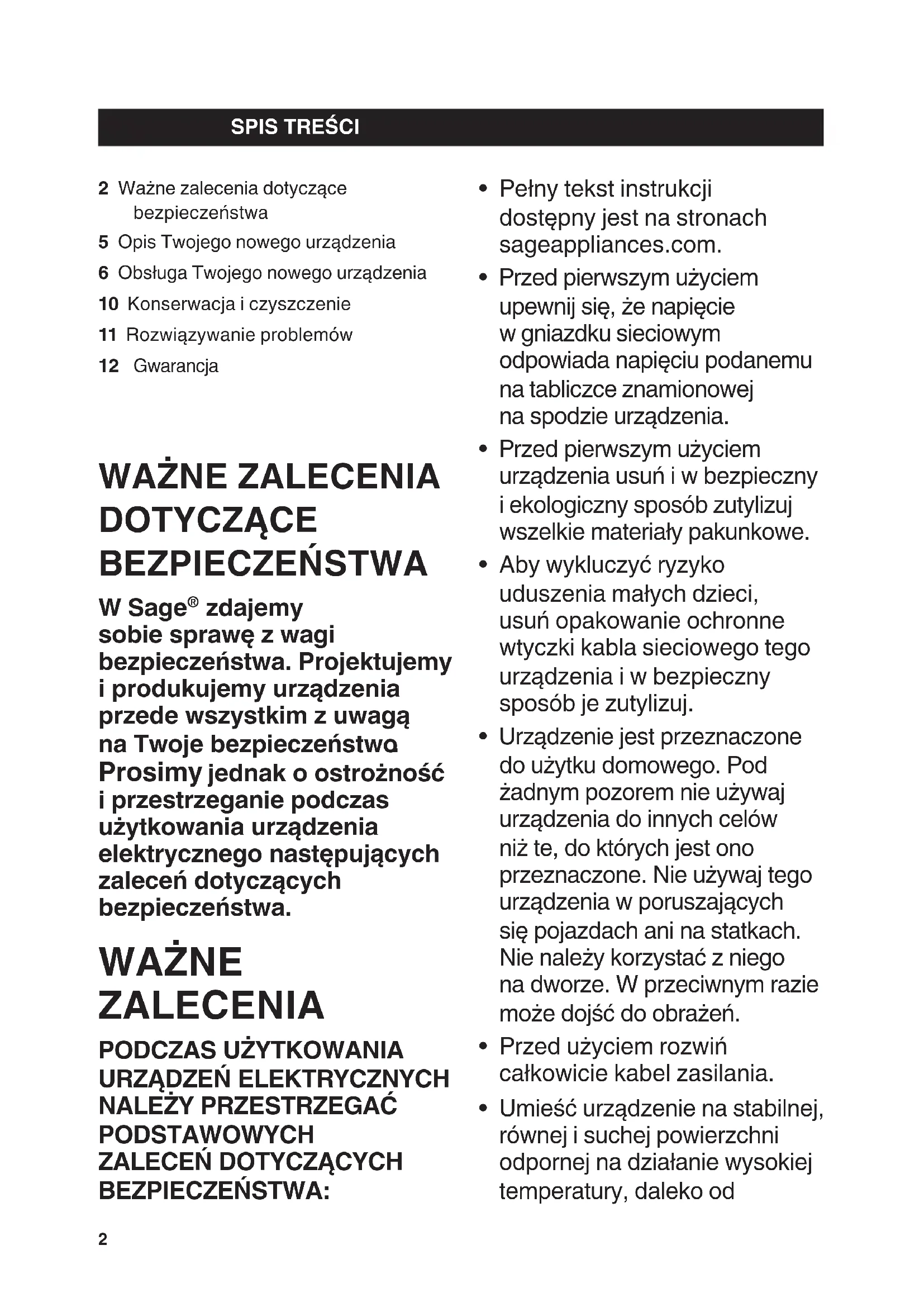 - Pełny tekst instrukcj biodępny jest na stronach sageappliances.com.