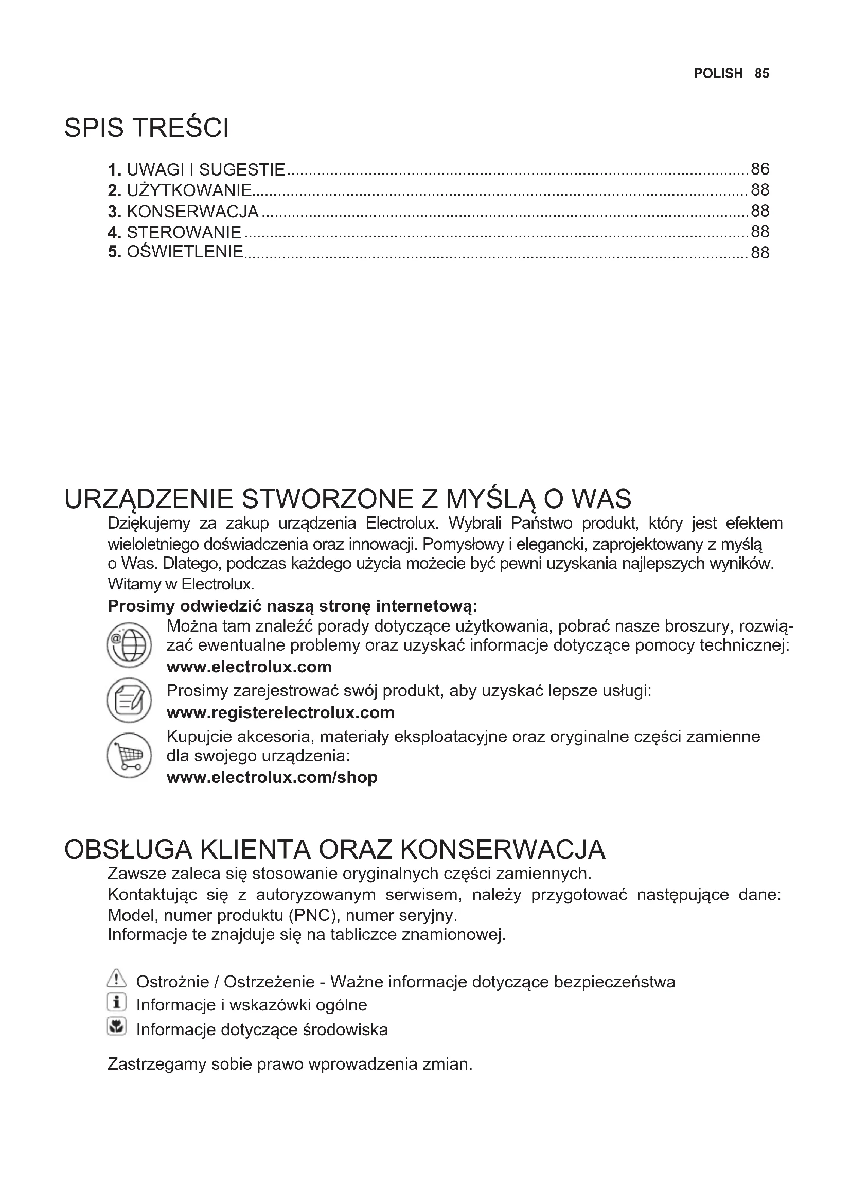 Zawsze zaleca się stosowanie oryginalnych części zamiennych. Kontaktując się z autoryzowanym serwisem, należy przygotować następujące dane: Model, numer produktu (PNC), numer seryjny. Informacje te znajduje się na tabliczce znamionowej. Ostrożnie / Ostrzeżenie - Ważne informacje dotyczące bezpieczeństwa Informacje i wskazówki ogólne Informacje dotyczące środowiska Zastrzegamy sobie prawo wprowadzenia zmian.86 www.electrolux.com