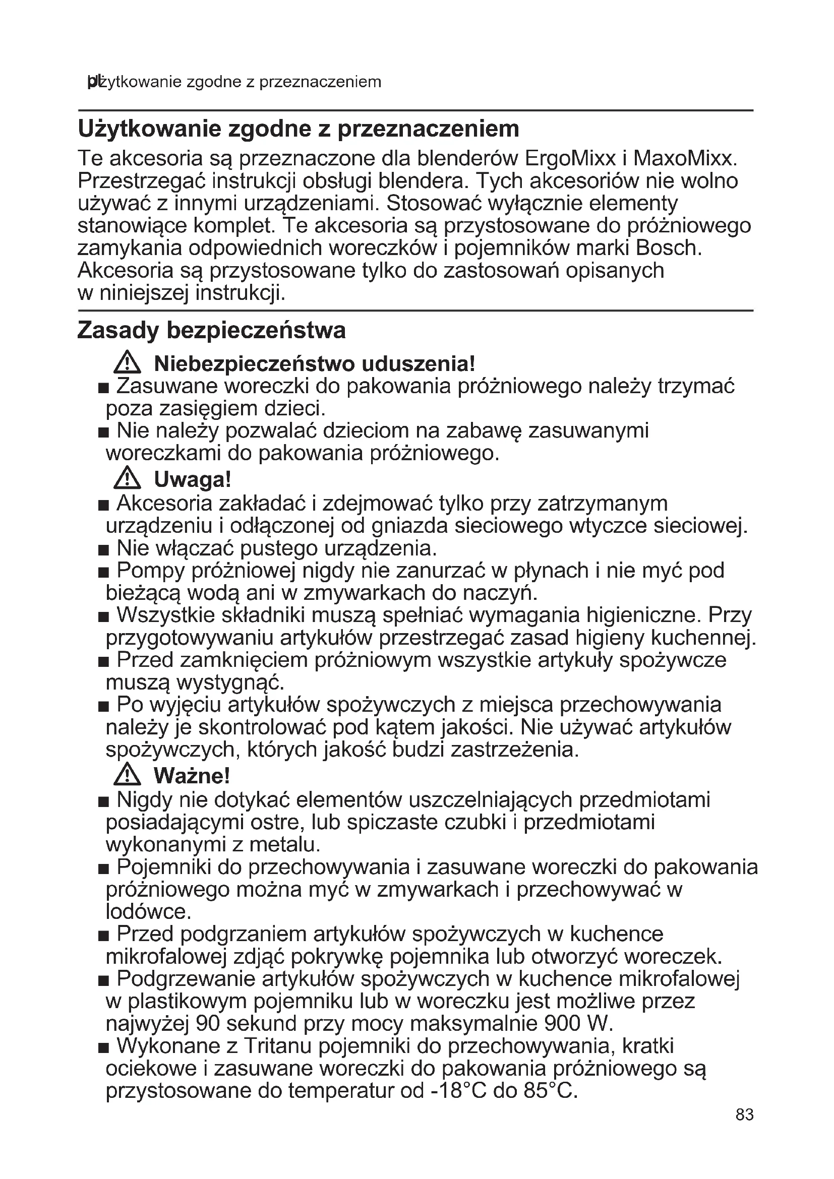 Użytkowanie zgodne z przeznaczeniem Użytkowanie zgodne z przeznaczeniem Te akcesoria są przeznaczone dla blenderów ErgoMixx i MaxoMixx. Przestrzegać instrukcji obsługi blendera. Tych akcesoriów nie wolno używać z innymi urządzeniami. Stosować wyłącznie elementy stanowiące komplet. Te akcesoria są przystosowane do próżniowego zamykania odpowiednich woreczków i pojemników marki Bosch. Akcesoria są przystosowane tylko do zastosowań opisanych w niniejszej instrukcji. Zasady bezpieczeństwa W Niebezpieczeństwo uduszenia! ■ Zasuwane woreczki do pakowania próżniowego należy trzymać poza zasięgiem dzieci. ■ Nie należy pozwalać dzieciom na zabawę zasuwanymi woreczkami do pakowania próżniowego. W Uwaga! ■ Akcesoria zakładać i zdejmować tylko przy zatrzymanym urządzeniu i odłączonej od gniazda sieciowego wtyczce sieciowej. ■ Nie włączać pustego urządzenia. ■ Pompy próżniowej nigdy nie zanurzać w płynach i nie myć pod bieżącą wodą ani w zmywarkach do naczyń. ■ Wszystkie składniki muszą spełniać wymagania higieniczne. Przy przygotowywaniu artykułów przestrzegać zasad higieny kuchennej. ■ Przed zamknięciem próżniowym wszystkie artykuły spożywcze muszą wystygnąć. ■ Po wyjęciu artykułów spożywczych z miejsca przechowywania należy je skontrolować pod kątem jakości. Nie używać artykułów spożywczych, których jakość budzi zastrzeżenia. W Ważne! ■ Nigdy nie dotykać elementów uszczelniających przedmiotami posiadającymi ostre, lub spiczaste czubki i przedmiotami wykonanymi z metalu. ■ Pojemniki do przechowywania i zasuwane woreczki do pakowania próżniowego można myć w zmywarkach i przechowywać w lodówce. ■ Przed podgrzaniem artykułów spożywczych w kuchence mikrofalowej zdjąć pokrywkę pojemnika lub otworzyć woreczek. ■ Podgrzewanie artykułów spożywczych w kuchence mikrofalowej w plastikowym pojemniku lub w woreczku jest możliwe przez najwyżej 90 sekund przy mocy maksymalnie 900 W. ■ Wykonane z Tritanu pojemniki do przechowywania, kratki ociekowe i zasuwane woreczki do pakowania próżniowego są przystosowane do temperatur od -18°C do 85°C.84 pl Zasady bezpieczeństwa Opis urządzenia X Rysunek A 1 Pompa próżniowa a Zawór próżniowy b Złącze korpusu urządzenia 2 Pojemnik do przechowywania * a Pojemniki z: – tworzywa Tritan * – szkła * b Kratka ociekowa * c Pokrywa d Zatrzaski zamykające e Zamknięcie próżniowe f Wskaźnik próżni g Pierścienie do ustawiania daty (dzień/ miesiąc) h Uszczelka pokrywy 3 Zasuwany woreczek przystosowany do pakowania próżniowego * a Zamknięcie zasuwane b Linia oznaczająca poziom max c Zamknięcie próżniowe