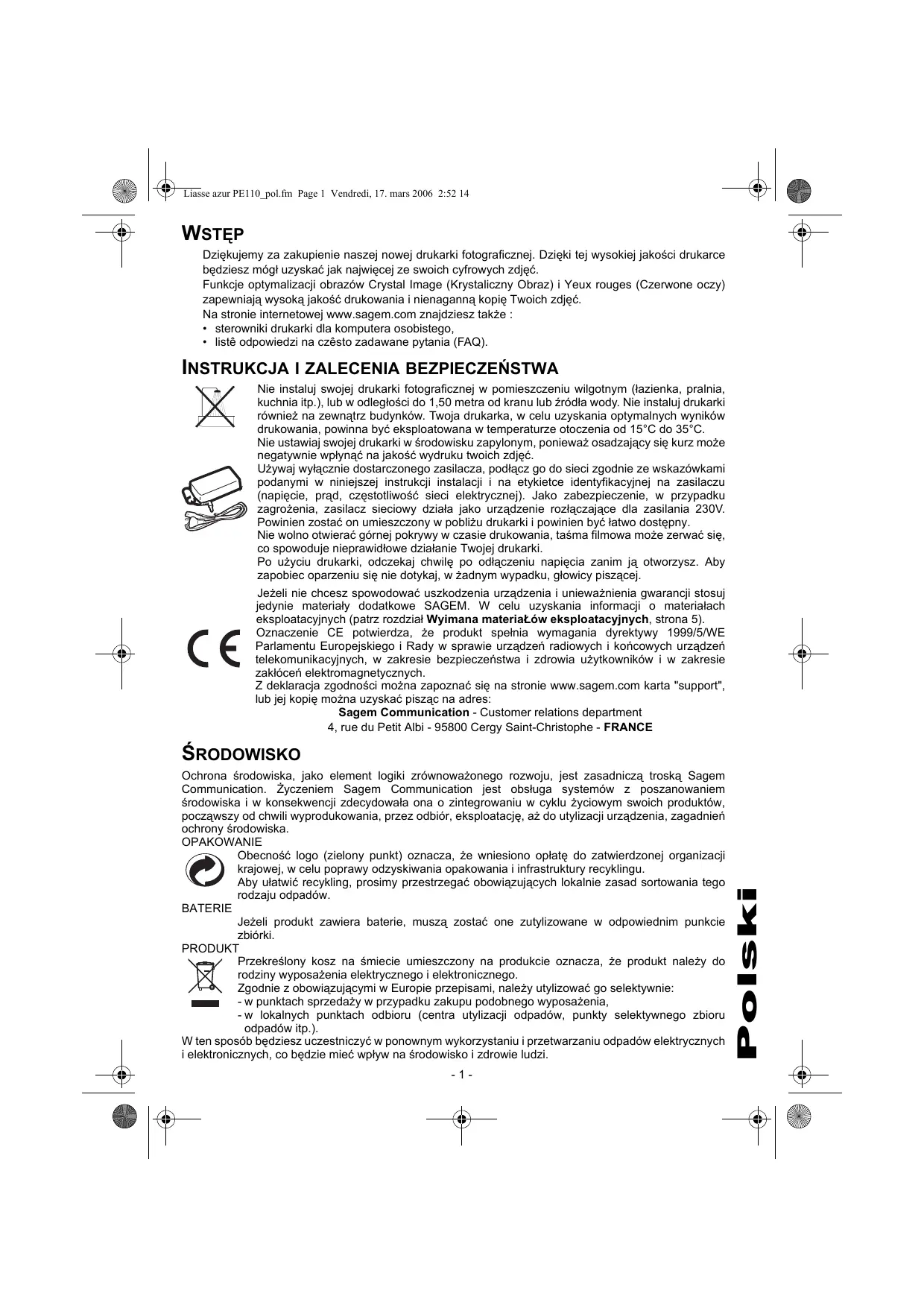 INSTRUKCJA I ZALECENIA BEZPIECZEŃSTWA Nie instaluj swojej drukarki fotograficznej w pomieszczeniu wilgotnym (łazienka, pralnia, kuchnia itp.), lub w odległości do 1,50 metra od kranu lub źródła wody. Nie instaluj drukarki również na zewnątrz budynków. Twoja drukarka, w celu uzyskania optymalnych wyników drukowania, powinna być eksploatowana w temperaturze otoczenia od 15°C do 35°C. Nie ustawiaj swojej drukarki w środowisku zapylonym, ponieważ osadzający się kurz może negatywnie wpłynąć na jakość wydruku twoich zdjęć. Używaj wyłącznie dostarczonego zasilacza, podłącz go do sieci zgodnie ze wskazówkami podanymi w niniejszej instrukcji instalacji i na etykietce identyfikacyjnej na zasilaczu (napięcie, prąd, częstotliwość sieci elektrycznej). Jako zabezpieczenie, w przypadku zagrożenia, zasilacz sieciowy działa jako urządzenie rozłączające dla zasilania 230V. Powinien zostać on umieszczony w pobliżu drukarki i powinien być łatwo dostępny. Nie wolno otwierać górnej pokrywy w czasie drukowania, taśma filmowa może zerwać się, co spowoduje nieprawidłowe działanie Twojej drukarki. Po użyciu drukarki, odczekaj chwilę po odłączeniu napięcia zanim ją otworzysz. Aby zapobiec oparzeniu się nie dotykaj, w żadnym wypadku, głowicy piszącej. Jeżeli nie chcesz spowodować uszkodzenia urządzenia i unieważnienia gwarancji stosuj jedynie materiały dodatkowe SAGEM. W celu uzyskania informacji o materiałach eksploatacyjnych (patrz rozdział Wyimana materiaŁów eksploatacyjnych, strona 5). Oznaczenie CE potwierdza, że produkt spełnia wymagania dyrektywy 1999/5/WE Parlamentu Europejskiego i Rady w sprawie urządzeń radiowych i końcowych urządzeń telekomunikacyjnych, w zakresie bezpieczeństwa i zdrowia użytkowników i w zakresie zakłóceń elektromagnetycznych. Z deklaracja zgodności można zapoznać się na stronie www.sagem.com karta "support", lub jej kopię można uzyskać pisząc na adres: Sagem Communication - Customer relations department