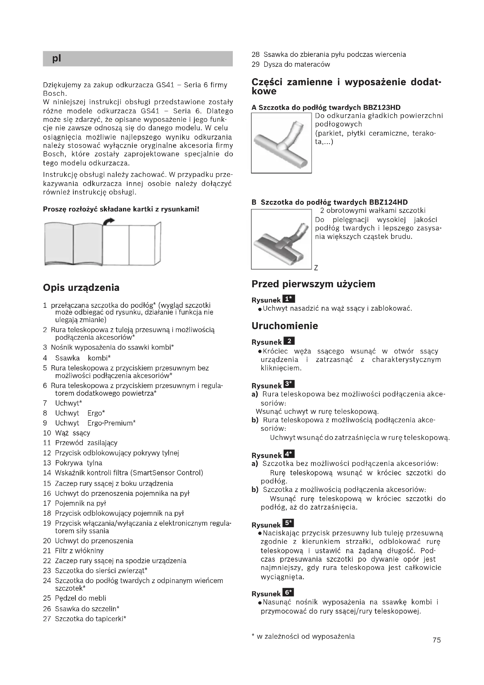 Dziękujemy za zakup odkurzacza GS41 – Seria 6 firmy Bosch. W niniejszej instrukcji obsługi przedstawione zostały różne modele odkurzacza GS41 – Seria 6. Dlatego może się zdarzyć, że opisane wyposażenie i jego funk- cje nie zawsze odnoszą się do danego modelu. W celu osiągnięcia możliwie najlepszego wyniku odkurzania należy stosować wyłącznie oryginalne akcesoria firmy Bosch, które zostały zaprojektowane specjalnie do tego modelu odkurzacza. Instrukcję obsługi należy zachować. W przypadku prze- kazywania odkurzacza innej osobie należy dołączyć również instrukcję obsługi. Proszę rozłożyć składane kartki z rysunkami! Opis urządzenia 1 przełączana szczotka do podłóg* (wygląd szczotki może odbiegać od rysunku, działanie i funkcja nie ulegają zmianie) 2 Rura teleskopowa z tuleją przesuwną i możliwością podłączenia akcesoriów* 3 Nośnik wyposażenia do ssawki kombi* 4 Ssawka kombi* 5 Rura teleskopowa z przyciskiem przesuwnym bez możliwości podłączenia akcesoriów* 6 Rura teleskopowa z przyciskiem przesuwnym i regula- torem dodatkowego powietrza* 7 Uchwyt* 8 Uchwyt Ergo* 9 Uchwyt Ergo-Premium* 10 Wąż ssący 11 Przewód zasilający 12 Przycisk odblokowujący pokrywy tylnej 13 Pokrywa tylna 14 Wskaźnik kontroli filtra (SmartSensor Control) 15 Zaczep rury ssącej z boku urządzenia 16 Uchwyt do przenoszenia pojemnika na pył 17 Pojemnik na pył 18 Przycisk odblokowujący pojemnik na pył 19 Przycisk włączania/wyłączania z elektronicznym regula- torem siły ssania 20 Uchwyt do przenoszenia 21 Filtr z włókniny 22 Zaczep rury ssącej na spodzie urządzenia 23 Szczotka do sierści zwierząt* 24 Szczotka do podłóg twardych z odpinanym wieńcem szczotek* 25 Pędzel do mebli 26 Ssawka do szczelin* 27 Szczotka do tapicerki* 28 Ssawka do zbierania pyłu podczas wiercenia 29 Dysza do materaców Części zamienne i wyposażenie dodat- kowe A Szczotka do podłóg twardych BBZ123HD Do odkurzania gładkich powierzchni podłogowych (parkiet, płytki ceramiczne, terako- ta,...) B Szczotka do podłóg twardych BBZ124HD