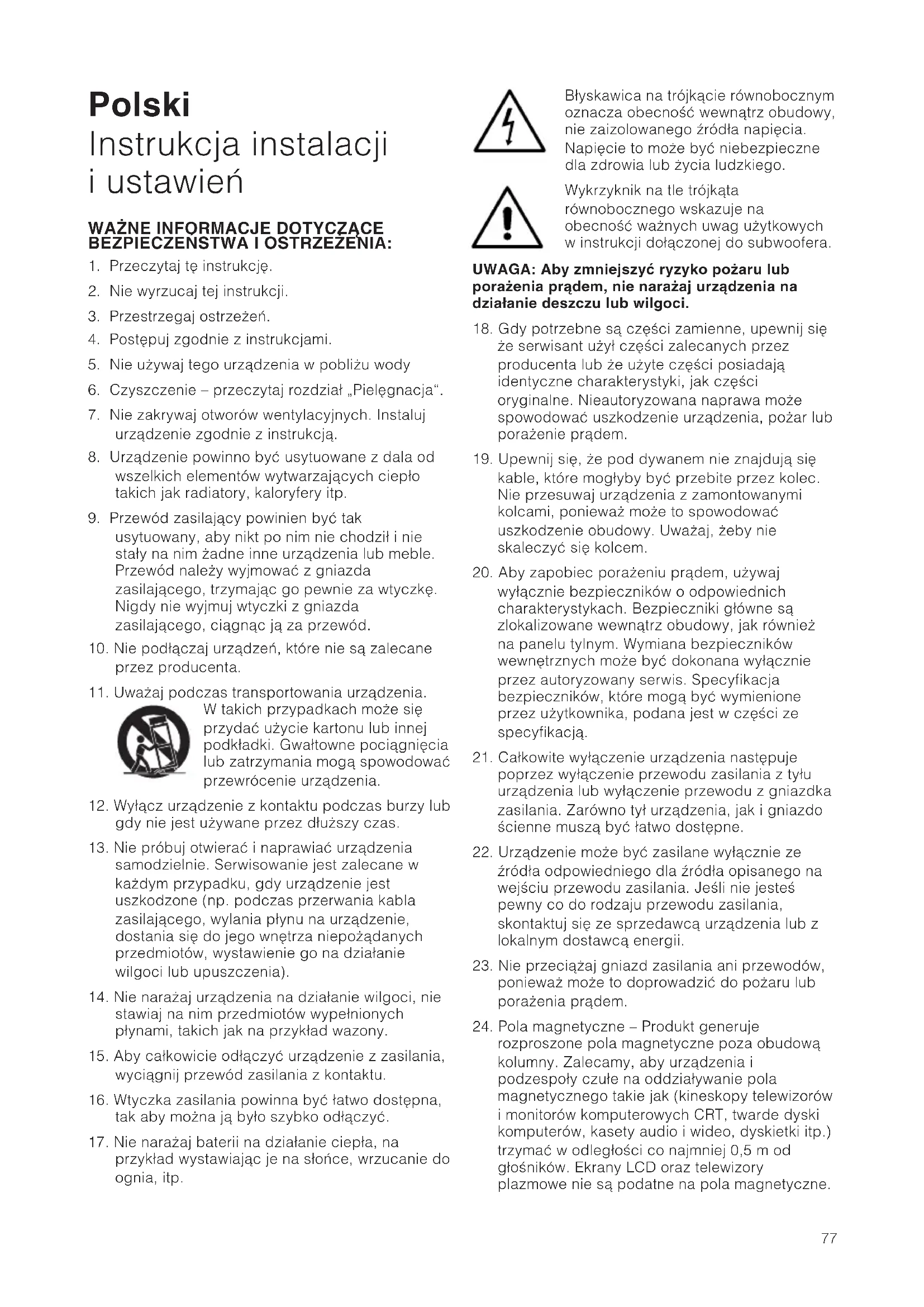 przyk¡ad wystawiajƒc je na s¡o◊ce, wrzucanie do ognia, itp. B¡yskawica na trójkƒcie równobocznym oznacza obecno·π wewnƒtrz obudowy, nie zaizolowanego Øród¡a napi∆cia. Napi∆cie to moÃe byπ niebezpieczne dla zdrowia lub Ãycia ludzkiego. Wykrzyknik na tle trójkƒta równobocznego wskazuje na obecno·π waÃnych uwag uÃytkowych w instrukcji do¡ƒczonej do subwoofera. UWAGA: Aby zmniejszyπ ryzyko poÃaru lub poraÃenia prƒdem, nie naraÃaj urzƒdzenia na dzia¡anie deszczu lub wilgoci.