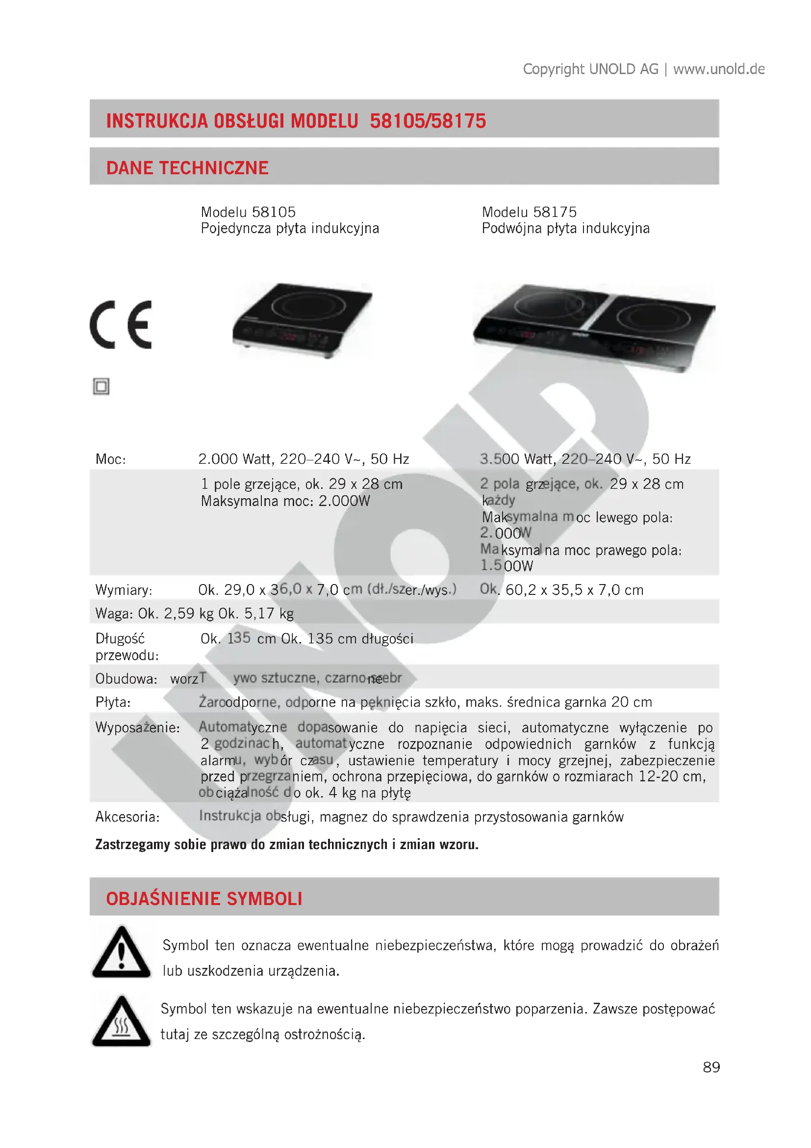 Symbol ten oznacza ewentualne niebezpieczeństwa, które mogą prowadzić do obrażeń lub uszkodzenia urządzenia. Symbol ten wskazuje na ewentualne niebezpieczeństwo poparzenia. Zawsze postępować tutaj ze szczególną ostrożnością. Copyright UNOLD AG | www.unold.de90