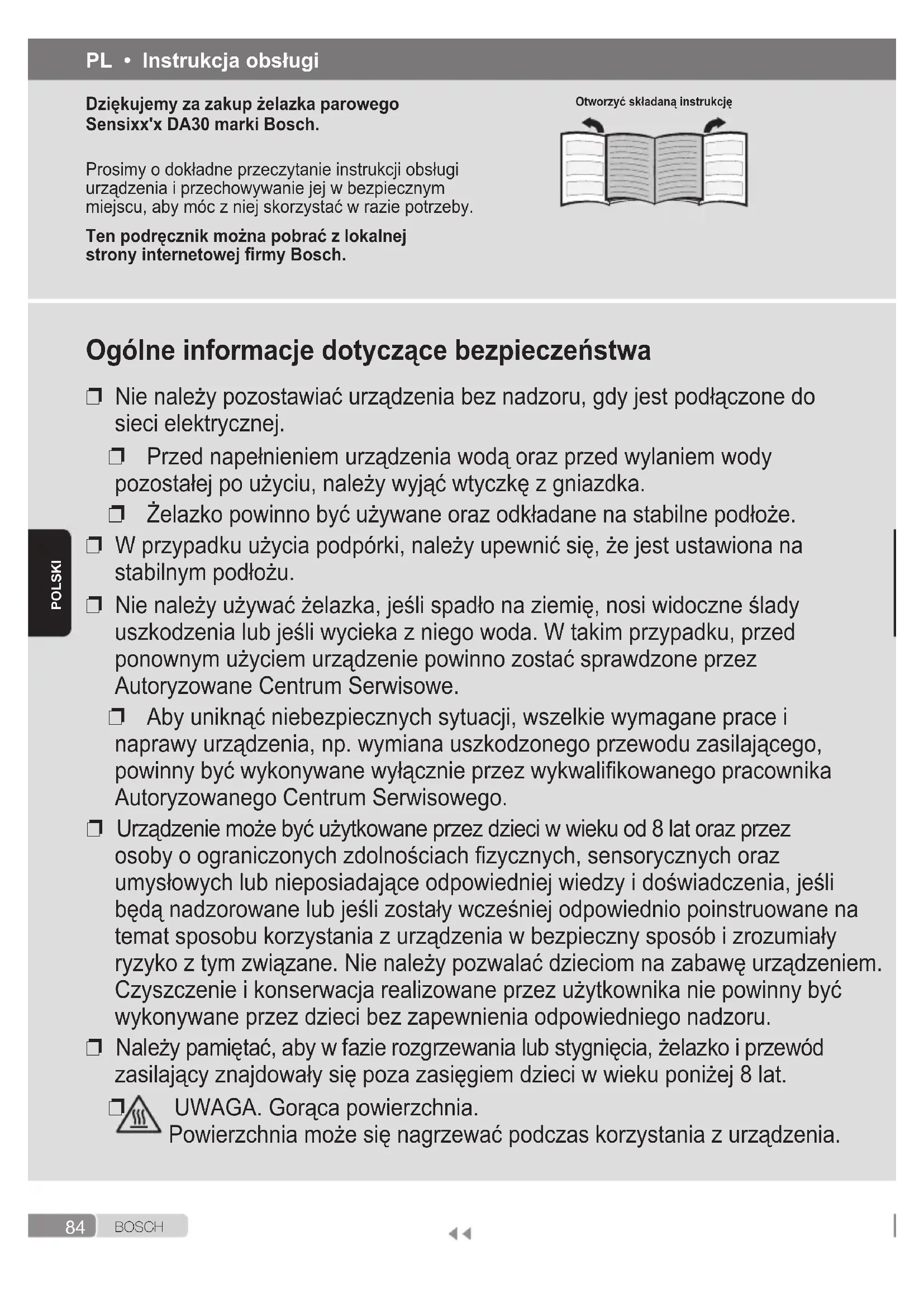 UWAGA. Gorąca powierzchnia. Powierzchnia może się nagrzewać podczas korzystania z urządzenia. PL • Instrukcja obsługi Dziękujemy za zakup żelazka parowego Sensixx'x DA30 marki Bosch. Prosimy o dokładne przeczytanie instrukcji obsługi urządzenia i przechowywanie jej w bezpiecznym miejscu, aby móc z niej skorzystać w razie potrzeby. Ten podręcznik można pobrać z lokalnej strony internetowej rmy Bosch. Otworzyć składaną instrukcję85 B O S C H