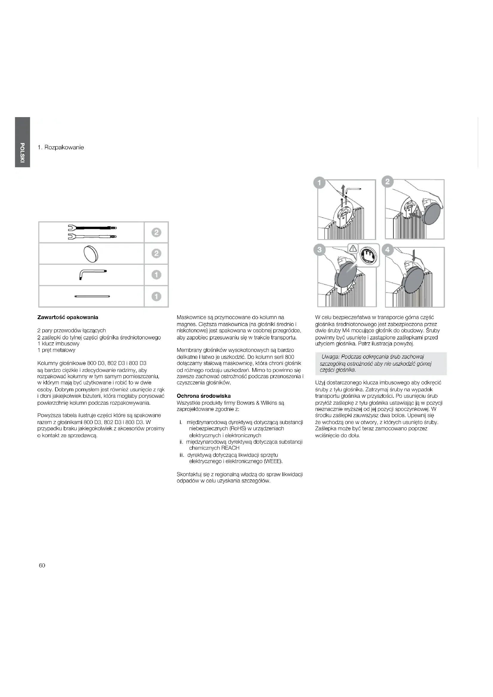 Zawartość opakowania 2 pary przewodów łączących 2 zaślepki do tylnej części głośnika średniotonowego 1 klucz imbusowy 1 pręt metalowy Kolumny głośnikowe 800 D3, 802 D3 i 803 D3 są bardzo ciężkie i zdecydowanie radzimy, aby rozpakować kolumny w tym samym pomieszczeniu, w którym mają być użytkowane i robić to w dwie osoby. Dobrym pomysłem jest również usunięcie z rąk i dłoni jakiejkolwiek biżuterii, która mogłaby porysować powierzchnię kolumn podczas rozpakowywania. Powyższa tabela ilustruje części które są spakowane razem z głośnikami 800 D3, 802 D3 i 803 D3. W przypadku braku jakiegokolwiek z akcesoriów prosimy o kontakt ze sprzedawcą. Maskownice są przymocowane do kolumn na magnes. Cięższa maskownica (na głośniki średnio i niskotonowe) jest spakowana w osobnej przegródce, aby zapobiec przesuwaniu się w trakcie transportu. Membrany głośników wysokotonowych są bardzo delikatne i łatwo je uszkodzić. Do kolumn serii 800 dołączamy stalową maskownicę, która chroni głośnik od różnego rodzaju uszkodzeń. Mimo to powinno się zawsze zachować ostrożność podczas przenoszenia i czyszczenia głośników. Ochrona środowiska Wszystkie produkty rmy Bowers & Wilkins są zaprojektowane zgodnie z: