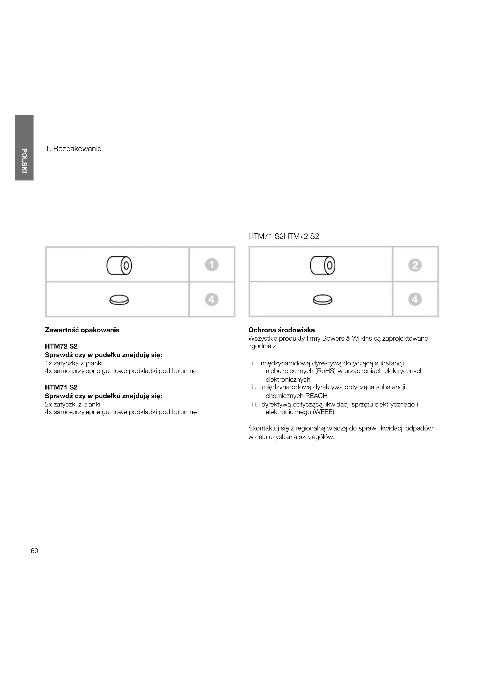 Zawartość opakowania HTM72S2 Sprawdź czy w pudełku znajdują się: 1x zatyczka z pianki 4x samo-przylepne gumowe podkładki pod kolumnę HTM71S2 Sprawdź czy w pudełku znajdują się: 2x zatyczki z pianki 4x samo-przylepne gumowe podkładki pod kolumnę Ochrona środowiska Wszystkie produkty rmy Bowers & Wilkins są zaprojektowane zgodnie z: