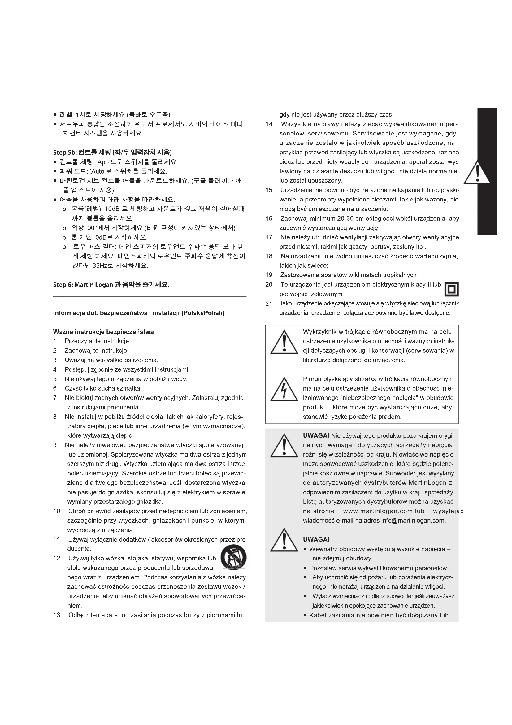 - 어플을 사용하며 아래 사항을 따라하세요. o 볼륨(레벨): 10dB 로 세팅하고 사운드가 깊고 저음이 길어질때 까지 볼륨을 올리세요. o 위상: 90°에서 시작하세요 (바뀐 극성이 켜져있는 상태에서) o 룸 게인: 0dB로 시작하세요. o 로우 패스 필터: 메인 스피커의 로우앤드 주파수 응답 보다 낮 게 세팅 하세요. 메인스피커의 로우앤드 주파수 응답에 확신이 없다면 35Hz로 시작하세요. Step 6: Martin Logan 과 음악을 즐기세요. Informacje dot. bezpieczeństwa i instalacji (Polski/Polish) Ważne instrukcje bezpieczeństwa 1 Przeczytajteinstrukcje. 2 Zachowajteinstrukcje. 3 Uważajnawszystkieostrzeżenia. 4 Postępujzgodniezewszystkimiinstrukcjami. 5 Nieużywajtegourządzeniawpobliżuwody. 6 Czyśćtylkosuchąszmatką. 7 Nieblokujżadnychotworówwentylacyjnych.Zainstalujzgodnie zinstrukcjamiproducenta. 8 Nieinstalujwpobliżuźródełciepła,takichjakkaloryfery,rejes- tratoryciepła,piecelubinneurządzenia(wtymwzmacniacze), którewytwarzająciepło. 9 Nienależyniwelowaćbezpieczeństwawtyczkispolaryzowanej lubuziemionej.Spolaryzowanawtyczkamadwaostrzazjednym szerszymniżdrugi.Wtyczkauziemiającamadwaostrzaitrzeci bolecuziemiający.Szerokieostrzelubtrzecibolecsąprzewid- zianedlatwojegobezpieczeństwa.Jeślidostarczonawtyczka niepasujedogniazdka,skonsultujsięzelektrykiemwsprawie wymianyprzestarzałegogniazdka. 10 Chrońprzewódzasilającyprzednadepnięciemlubzgnieceniem, szczególnieprzywtyczkach,gniazdkachipunkcie,wktórym wychodzązurządzenia. 11 Używajwyłączniedodatków/akcesoriówokreślonychprzezpro- ducenta. 12 Używajtylkowózka,stojaka,statywu,wspornikalub stołuwskazanegoprzezproducentalubsprzedawa- negowrazzurządzeniem.Podczaskorzystaniazwózkanależy zachowaćostrożnośćpodczasprzenoszeniazestawuwózek/ urządzenie,abyuniknąćobrażeńspowodowanychprzewróce- niem. 13 Odłącztenaparatodzasilaniapodczasburzyzpiorunamilub gdyniejestużywanyprzezdłuższyczas. 14 Wszystkienaprawynależyzlecaćwykwalifikowanemuper- sonelowiserwisowemu.Serwisowaniejestwymagane,gdy urządzeniezostałowjakikolwieksposóbuszkodzone,na przykładprzewódzasilającylubwtyczkasąuszkodzone,rozlana cieczlubprzedmiotywpadłydourządzenia,aparatzostałwys- tawionynadziałaniedeszczulubwilgoci,niedziałanormalnie lubzostałupuszczony. 15 Urządzenieniepowinnobyćnarażonenakapanielubrozpryski- wanie,aprzedmiotywypełnionecieczami,takiejakwazony,nie mogąbyćumieszczanenaurządzeniu. 16 Zachowajminimum20-30cmodległościwokółurządzenia,aby zapewnićwystarczającąwentylację; 17 Nienależyutrudniaćwentylacjizakrywającotworywentylacyjne przedmiotami,takimijakgazety,obrusy,zasłonyitp.; 18 Naurządzeniuniewolnoumieszczaćźródełotwartegoognia, takichjakświece; 19 Zastosowanieaparatówwklimatachtropikalnych 20 TourządzeniejesturządzeniemelektrycznymklasyIIlub podwójnieizolowanym