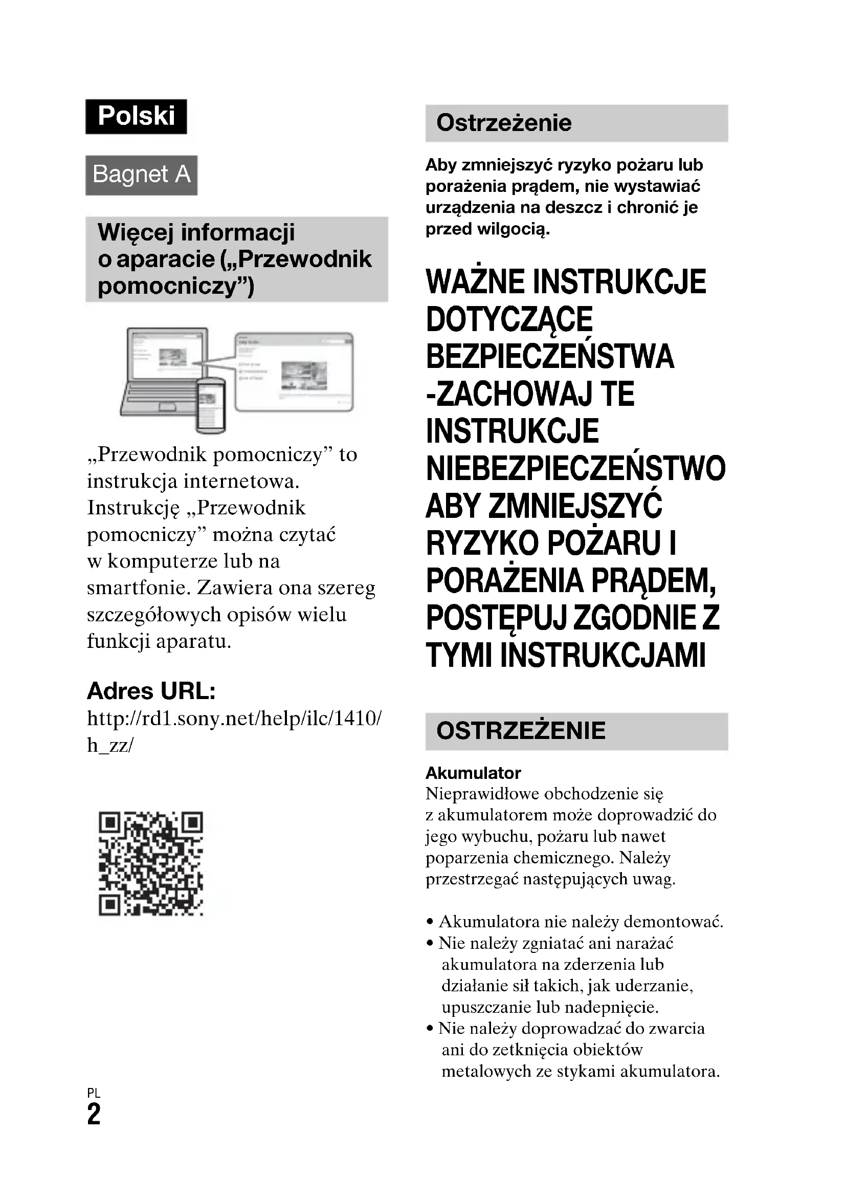 „Przewodnik pomocniczy” to instrukcja internetowa. Instrukcję „Przewodnik pomocniczy” można czytać w komputerze lub na smartfonie. Zawiera ona szereg szczegółowych opisów wielu funkcji aparatu. Adres URL: http://rd1.sony.net/help/ilc/1410/ h_zz/ Aby zmniejszyć ryzyko pożaru lub porażenia prądem, nie wystawiać urządzenia na deszcz i chronić je przed wilgocią.