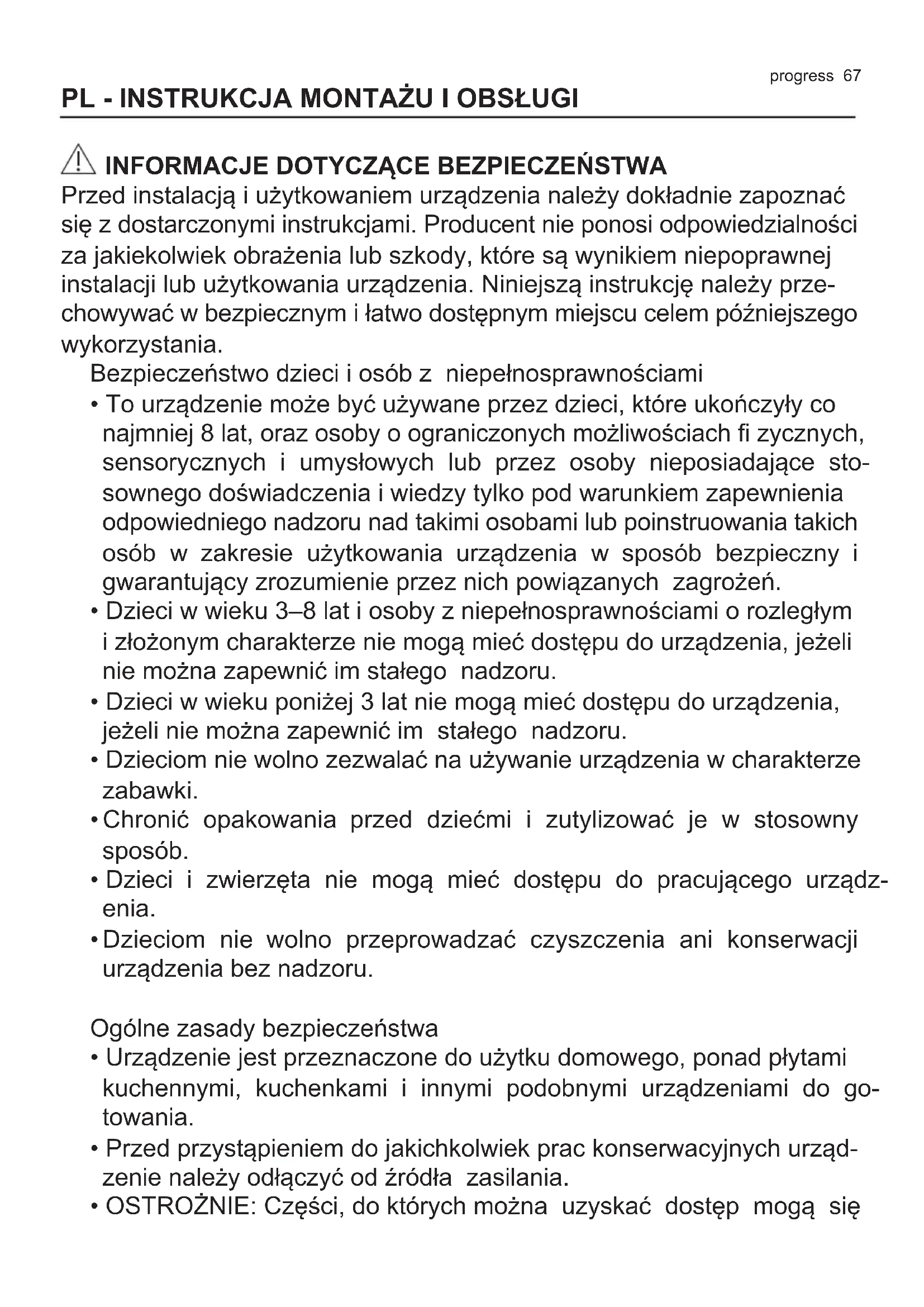 Przed instalacją i użytkowaniem urządzenia należy dokładnie zapoznać się z dostarczonymi instrukcjami. Producent nie ponosi odpowiedzialności za jakiekolwiek obrażenia lub szkody, które są wynikiem niepoprawnej instalacji lub użytkowania urządzenia. Niniejszą instrukcję należy prze- chowywać w bezpiecznym i łatwo dostępnym miejscu celem późniejszego wykorzystania. Bezpieczeństwo dzieci i osób z niepełnosprawnościami