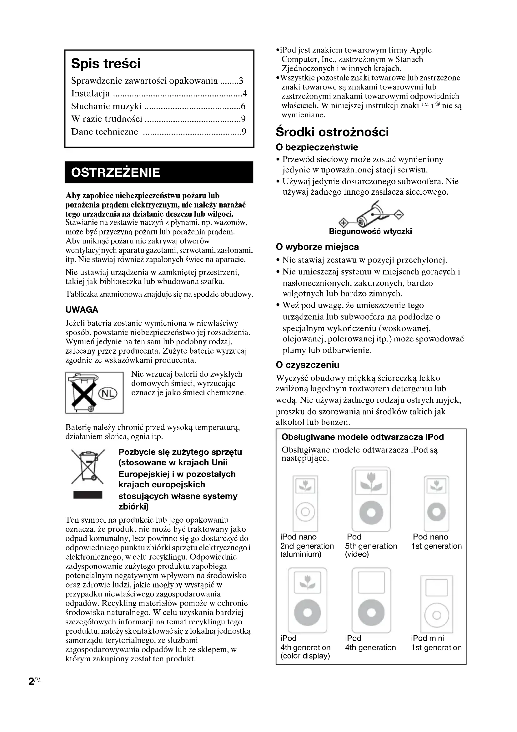 - Weź pod uwagę, że umieszczenie tego urządzenia lub subwoofera na podłodze o specjalnym wykończeniu (woskowanej, olejowanej, polerowanej itp.) może spowodować plamy lub odbarwienie. O czyszczeniu Wyczyść obudowy miękką ściereczką lekko zwilżoną łagodnym roztworem detergentu lub wodą. Nie używaj żadnego rodzaju ostrych myjek, proszku do szorowania ani środków takich jak alkohol lub benzen. Spis treści Sprawdzenie zawartości opakowania ........3 Instalacja .......................................................4 Słuchanie muzyki .........................................6 W razie trudności .........................................9 Dane techniczne ..........................................9 OSTRZEŻENIE Obsługiwane modele odtwarzacza iPod Obsługiwane modele odtwarzacza iPod są następujące. Biegunowość wtyczkiiPod nano 2nd generation (aluminium)iPod 5th generation (video)iPod nano 1st generationiPod 4th generation (color display)iPod 4th generationiPod mini 1st generation3