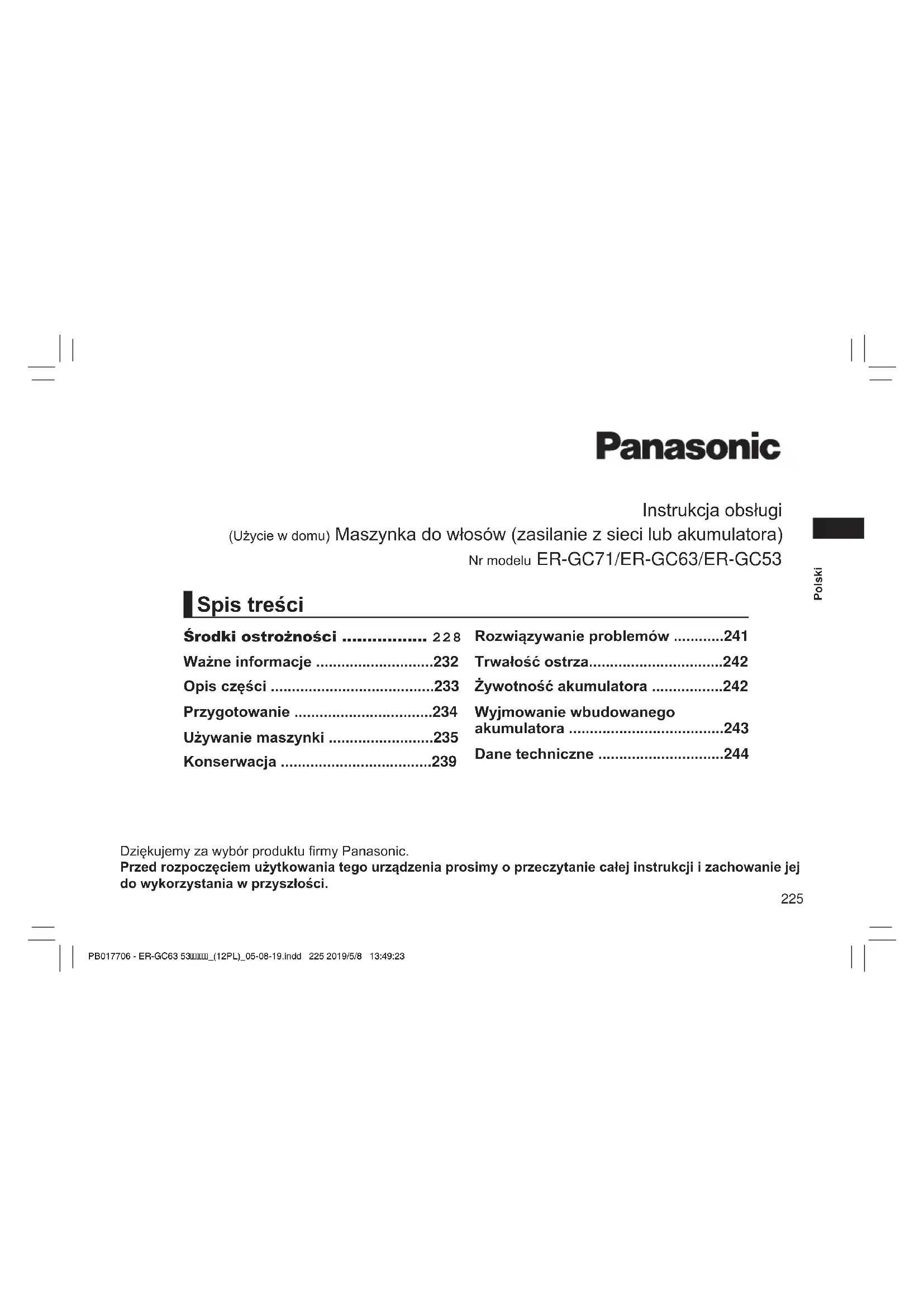 - Maszynka nie umożliwia przycinania włosów poniżej 0,5 mm. PB017706 - ER-GC63 53_(12PL)_05-08-19.indd 238 2019/5/8 13:49:44239 Polski Konserwacja