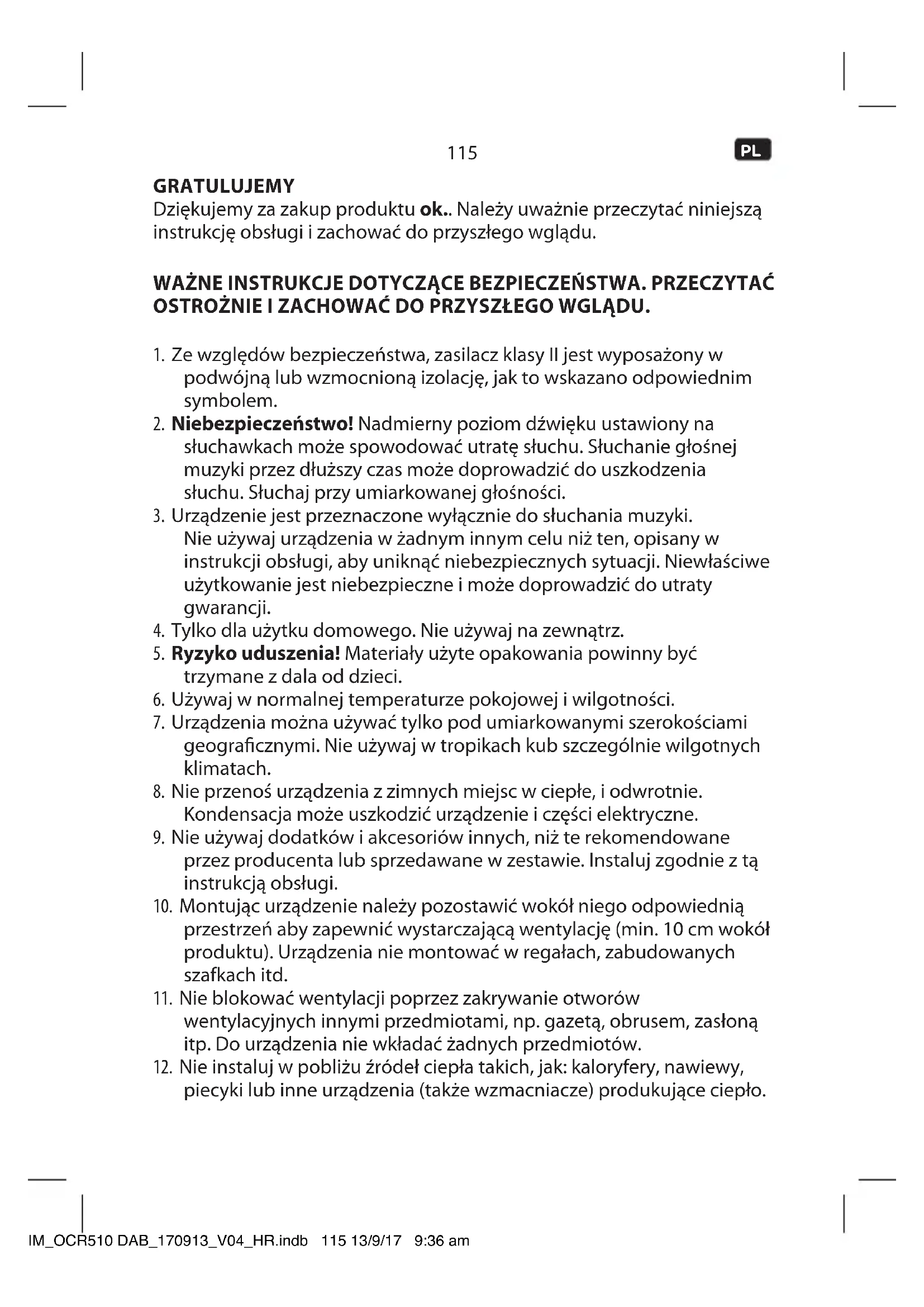 piecyki lub inne urządzenia (także wzmacniacze) produkujące ciepło. IM_OCR510 DAB_170913_V04_HR.indb 115 13/9/17 9:36 am116