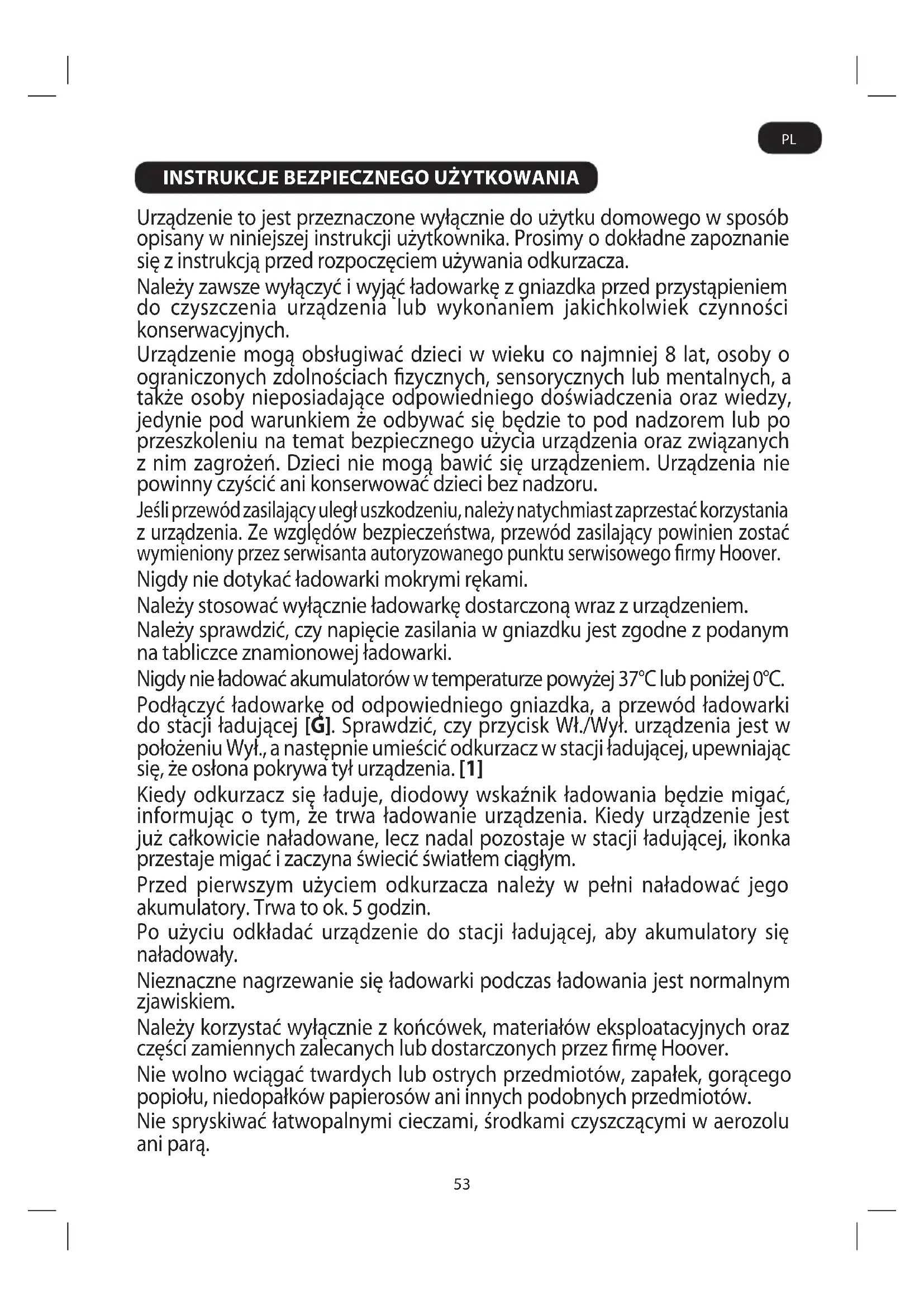 Urządzenie to jest przeznaczone wyłącznie do użytku domowego w sposób opisany w niniejszej instrukcji użytkownika. Prosimy o dokładne zapoznanie się z instrukcją przed rozpoczęciem używania odkurzacza. Należy zawsze wyłączyć i wyjąć ładowarkę z gniazdka przed przystąpieniem do czyszczenia urządzenia lub wykonaniem jakichkolwiek czynności konserwacyjnych. Urządzenie mogą obsługiwać dzieci w wieku co najmniej 8 lat, osoby o ograniczonych zdolnościach zycznych, sensorycznych lub mentalnych, a także osoby nieposiadające odpowiedniego doświadczenia oraz wiedzy, jedynie pod warunkiem że odbywać się będzie to pod nadzorem lub po przeszkoleniu na temat bezpiecznego użycia urządzenia oraz związanych z nim zagrożeń. Dzieci nie mogą bawić się urządzeniem. Urządzenia nie powinny czyścić ani konserwować dzieci bez nadzoru. Jeśli przewód zasilający uległ uszkodzeniu, należy natychmiast zaprzestać korzystania z urządzenia. Ze względów bezpieczeństwa, przewód zasilający powinien zostać wymieniony przez serwisanta autoryzowanego punktu serwisowego rmy Hoover. Nigdy nie dotykać ładowarki mokrymi rękami. Należy stosować wyłącznie ładowarkę dostarczoną wraz z urządzeniem. Należy sprawdzić, czy napięcie zasilania w gniazdku jest zgodne z podanym na tabliczce znamionowej ładowarki. Nigdy nie ładować akumulatorów w temperaturze powyżej 37°C lub poniżej 0°C. Podłączyć ładowarkę od odpowiedniego gniazdka, a przewód ładowarki do stacji ładującej [G]. Sprawdzić, czy przycisk Wł./Wył. urządzenia jest w położeniu Wył., a następnie umieścić odkurzacz w stacji ładującej, upewniając się, że osłona pokrywa tył urządzenia. [1] Kiedy odkurzacz się ładuje, diodowy wskaźnik ładowania będzie migać, informując o tym, że trwa ładowanie urządzenia. Kiedy urządzenie jest już całkowicie naładowane, lecz nadal pozostaje w stacji ładującej, ikonka przestaje migać i zaczyna świecić światłem ciągłym. Przed pierwszym użyciem odkurzacza należy w pełni naładować jego akumulatory. Trwa to ok. 5 godzin. Po użyciu odkładać urządzenie do stacji ładującej, aby akumulatory się naładowały. Nieznaczne nagrzewanie się ładowarki podczas ładowania jest normalnym zjawiskiem. Należy korzystać wyłącznie z końcówek, materiałów eksploatacyjnych oraz części zamiennych zalecanych lub dostarczonych przez rmę Hoover. Nie wolno wciągać twardych lub ostrych przedmiotów, zapałek, gorącego popiołu, niedopałków papierosów ani innych podobnych przedmiotów. Nie spryskiwać łatwopalnymi cieczami, środkami czyszczącymi w aerozolu ani parą. PL54