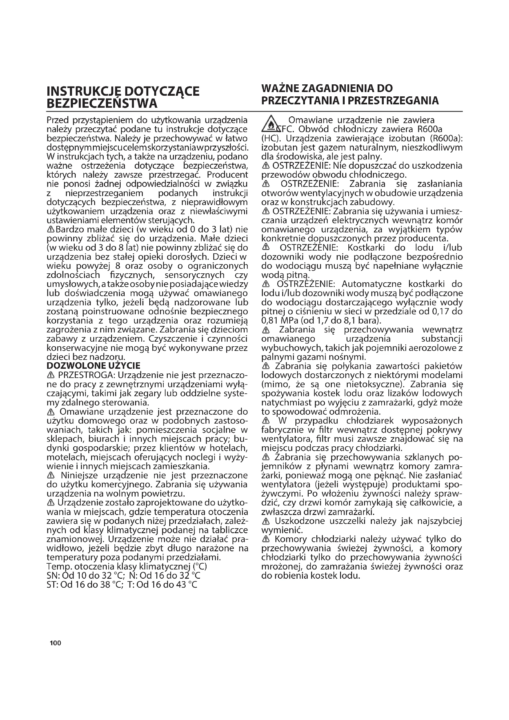 Omawiane urządzenie nie zawiera CFC. Obwód chłodniczy zawiera R600a (HC). Urządzenia zawierające izobutan (R600a): izobutan jest gazem naturalnym, nieszkodliwym dla środowiska, ale jest palny. OSTRZEŻENIE: Nie dopuszczać do uszkodzenia przewodów obwodu chłodniczego. OSTRZEŻENIE: Zabrania się zasłaniania otworów wentylacyjnych w obudowie urządzenia oraz w konstrukcjach zabudowy. OSTRZEŻENIE: Zabrania się używania i umiesz- czania urządzeń elektrycznych wewnątrz komór omawianego urządzenia, za wyjątkiem typów konkretnie dopuszczonych przez producenta. OSTRZEŻENIE: Kostkarki do lodu i/lub dozowniki wody nie podłączone bezpośrednio do wodociągu muszą być napełniane wyłącznie wodą pitną. OSTRZEŻENIE: Automatyczne kostkarki do lodu i/lub dozowniki wody muszą być podłączone do wodociągu dostarczającego wyłącznie wody pitnej o ciśnieniu w sieci w przedziale od 0,17 do 0,81MPa (od 1,7 do 8,1 bara). Zabrania się przechowywania wewnątrz omawianego urządzenia substancji wybuchowych, takich jak pojemniki aerozolowe z palnymi gazami nośnymi. Zabrania się połykania zawartości pakietów lodowych dostarczonych z niektórymi modelami (mimo, że są one nietoksyczne). Zabrania się spożywania kostek lodu oraz lizaków lodowych natychmiast po wyjęciu z zamrażarki, gdyż może to spowodować odmrożenia. W przypadku chłodziarek wyposażonych fabrycznie w ltr wewnątrz dostępnej pokrywy wentylatora, ltr musi zawsze znajdować się na miejscu podczas pracy chłodziarki. Zabrania się przechowywania szklanych po- jemników z płynami wewnątrz komory zamra- żarki, ponieważ mogą one pęknąć. Nie zasłaniać wentylatora (jeżeli występuje) produktami spo- żywczymi. Po włożeniu żywności należy spraw- dzić, czy drzwi komór zamykają się całkowicie, a zwłaszcza drzwi zamrażarki. Uszkodzone uszczelki należy jak najszybciej wymienić. Komory chłodziarki należy używać tylko do przechowywania świeżej żywności, a komory chłodziarki tylko do przechowywania żywności mrożonej, do zamrażania świeżej żywności oraz do robienia kostek lodu.101 Należy unikać przechowywania niezapakowanej żywności, która może stykać się bezpośrednio z powierzchniami wewnętrznymi komór chłodziarki lub zamrażarki. Urządzenia mogą posiadać również specjalne komory (na świeżą żywność, utrzymujące temp. zera stopni itp.). Można je wyjąć bez szkody dla wydajności urządzenia, chyba że określono inaczej w specjalnej broszurze produktu. C-Pentan stosowany jest jako środek porotwórczy w piance izolacyjnej i jest łatwopalnym gazem. INSTALACJA Do przenoszenia i zainstalowania urządzenia potrzebne są co najmniej dwie osoby- ryzyko ura- zów. Podczas rozpakowywania i instalacji należy używać rękawic ochronnych - ryzyko skaleczenia. Instalacja, podłączenie do wodociągu (jeżeli występuje), podłączenia elektryczne, a także na- prawy muszą być wykonywane przez wykwali- kowanego technika. Zabrania się naprawiania oraz wymieniania jakichkolwiek elementów urzą- dzenia, chyba takie instrukcje zawiera podręcznik użytkownika. Nie zezwalać dzieciom na zbliżanie się do miejsca instalacji. Po rozpakowaniu urządzenia należy upewnić się, czy nie uległo ono uszkodzeniu w czasie transpor- tu. W przypadku problemów, należy skontaktować się z dostawcą lub najbliższym punktem obsługi posprzedażnej. Po zakończeniu instalacji, materiały odpadowe z opakowania (folie, elementy styropia- nowe itp.) muszą być przechowywane w miejscu niedostępnym dla dzieci - ryzyko uduszenia. Przed przystąpieniem do jakichkolwiek czynności insta- lacyjnych konieczne jest odłączenie urządzenia od zasilania - ryzyko porażenia prądem elektrycznym. Podczas instalacji należy upewnić się, czy urządze- nie nie uszkodziło kabla zasilającego - ryzyko poża- ru lub porażenia prądem elektrycznym. Urządzenie można włączyć dopiero po zakończeniu instalacji. Podczas przemieszczania urządzenia należy uważać, aby nie uszkodzić podłóg (np. parkietu). Urządzenie należy instalować na podłodze lub podstawie o wytrzymałości dostosowanej do jego wagi, w miejscu odpowiednim dla jego wymiarów i sposobu użytkowania. Należy upewnić się, że urządzenie nie zostało ustawione w pobliżu źródeł ciepła oraz że cztery nóżki stabilnie spoczywają na podłodze, regulując je zależnie od potrzeb, a także sprawdzić przy użyciu poziomnicy, czy urządzenie jest wypoziomowane. Aby zapewnić pełną sprawność obwodu chłodniczego, należy odczekać co najmniej dwie godziny przed włączeniem urządzenia. OSTRZEŻENIE: Podczas ustawiania urządzenia na miejscu należy upewnić się, że kabel zasilający nie został przygnieciony ani uszkodzony. Aby zapewnić właściwą wentylację, należy pozostawić wolną przestrzeń po obu stronach oraz nad urządzeniem. Odległość pomiędzy tylną częścią urządzenia, a znajdującą się za nim ścianą powinna wynosić 50 mm, aby nie dopuścić do nadmiernego nagrzewania powierzchni. OSTRZEŻENIE: Aby uniknąć zagrożeń związanych z niestabilnością, ustawienie oraz unieruchomienie urządzenia musi zostać przeprowadzone zgodnie z instrukcjami producenta. Jeżeli zachodzi potrzeba wymiany drzwi, należy skontaktować się z ośrodkiem wsparcia technicznego.
