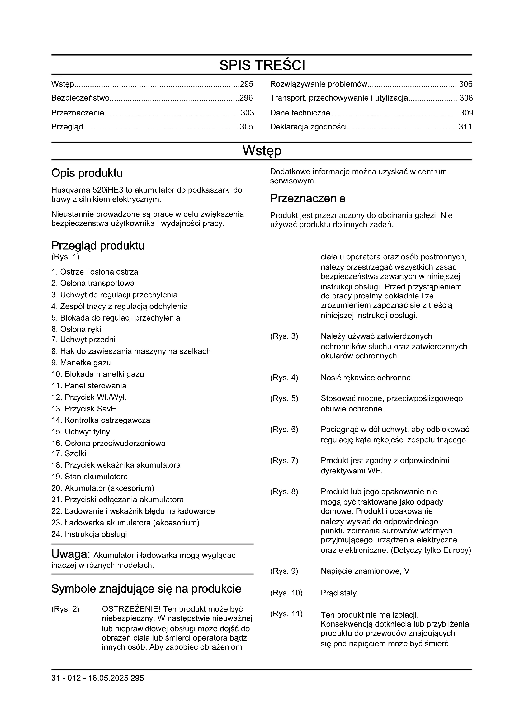 - Deklaracja zgodności Wstęp Opis produktu Husqvarna 520iHE3 to akumulator do podkaszarki do trawy z silnikiem elektrycznym. Nieustannie prowadzone są prace w celu zwiększenia bezpieczeństwa użytkownika i wydajności pracy. Dodatkowe informacje można uzyskać w centrum serwisowym. Przeznaczenie Produkt jest przeznaczony do obcinania gałęzi. Nie używać produktu do innych zadań. Przegląd produktu (Rys. 1) p. 311