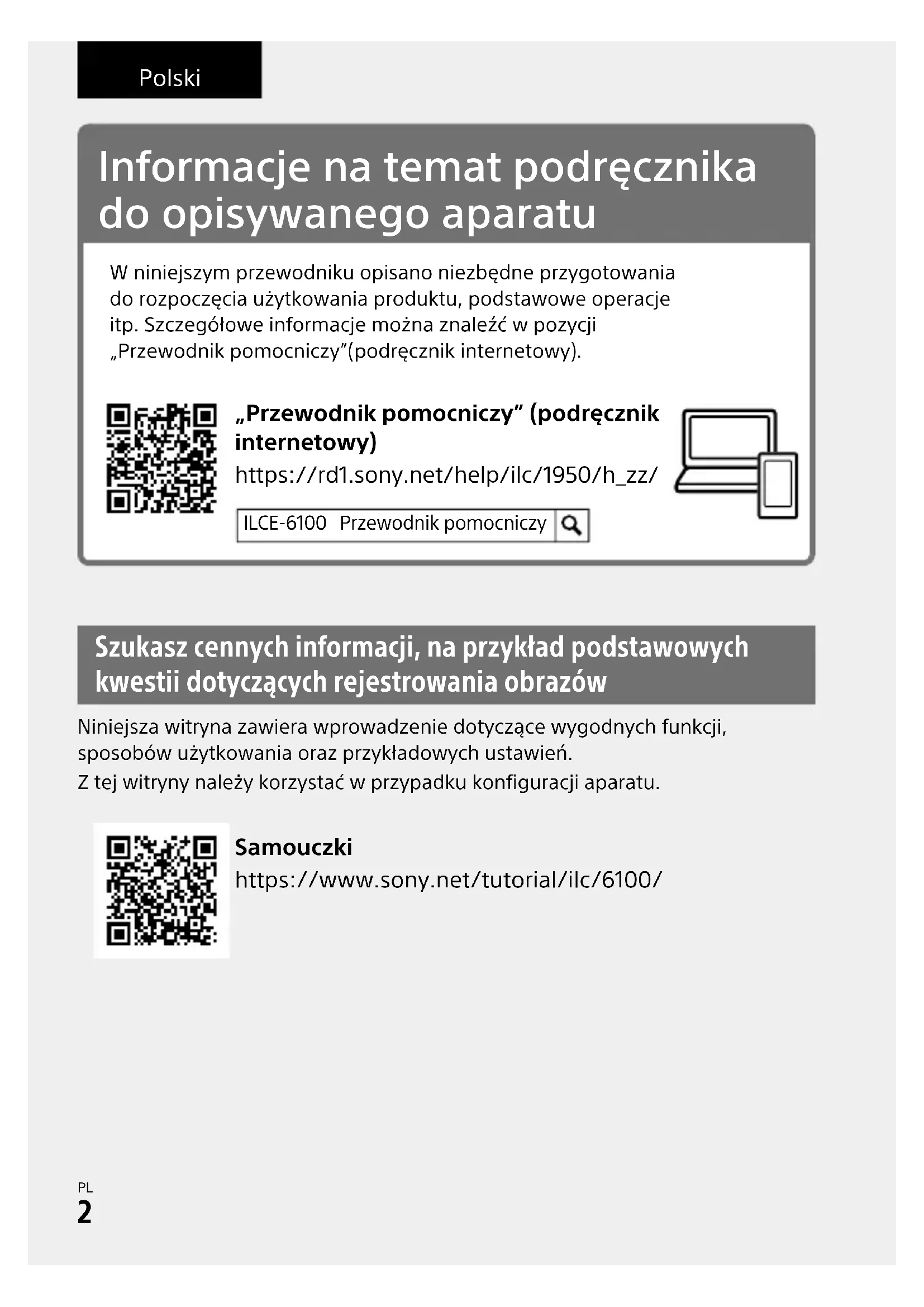 \\Win-473\camera\CX88400(PD)\Multi\06_Compose\5009876411_14lang\5009876411ILCE6100CEC\08PL-ILCE6100CEC\08PL.indd DTP data saved: 2019/07/24 09:13 PDF file created: 2019/07/31 09:19 Informacje na temat podręcznika do opisywanego aparatu W niniejszym przewodniku opisano niezbędne przygotowania do rozpoczęcia użytkowania produktu, podstawowe operacje itp. Szczegółowe informacje można znaleźć w pozycji „Przewodnik pomocniczy”(podręcznik internetowy). https://rd1.sony.net/help/ilc/1950/h_zz/ „Przewodnik pomocniczy” (podręcznik internetowy) ILCE-6100 Przewodnik pomocniczy Szukasz cennych informacji, na przykład podstawowych kwestii dotyczących rejestrowania obrazów Niniejsza witryna zawiera wprowadzenie dotyczące wygodnych funkcji, sposobów użytkowania oraz przykładowych ustawień.Z tej witryny należy korzystać w przypadku konfiguracji aparatu. Samouczki https://www.sony.net/tutorial/ilc/6100/ PolskiILCE-61005-009-876-41(1)