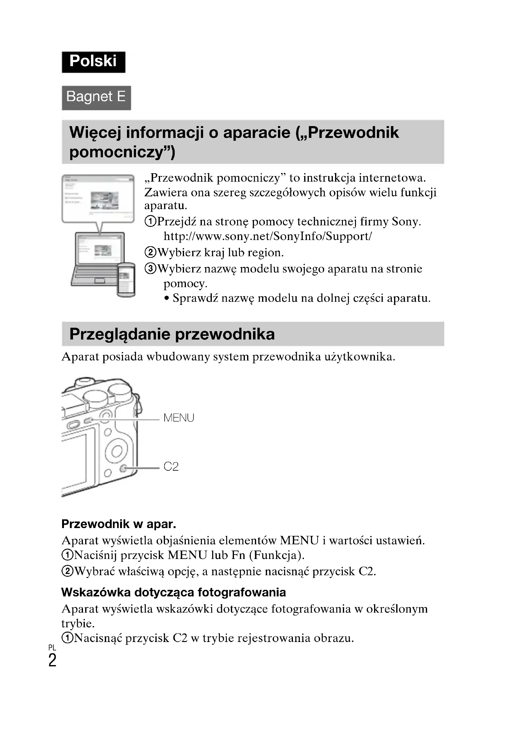 Aparat posiada wbudowany system przewodnika użytkownika. Przewodnik w apar. Aparat wyświetla objaśnienia elementów MENU i wartości ustawień. 1 Naciśnij przycisk MENU lub Fn (Funkcja). 2 Wybrać właściwą opcję, a następnie nacisnąć przycisk C2. Wskazówka dotycząca fotografowania Aparat wyświetla wskazówki dotyczące fotografowania w określonym trybie. 1 Nacisnąć przycisk C2 w trybie rejestrowania obrazu. Polski Bagnet E Więcej informacji o aparacie („Przewodnik pomocniczy”) „Przewodnik pomocniczy” to instrukcja internetowa. Zawiera ona szereg szczegółowych opisów wielu funkcji aparatu. 1 Przejdź na stronę pomocy technicznej firmy Sony. http://www.sony.net/SonyInfo/Support/ 2 Wybierz kraj lub region. 3 Wybierz nazwę modelu swojego aparatu na stronie pomocy.