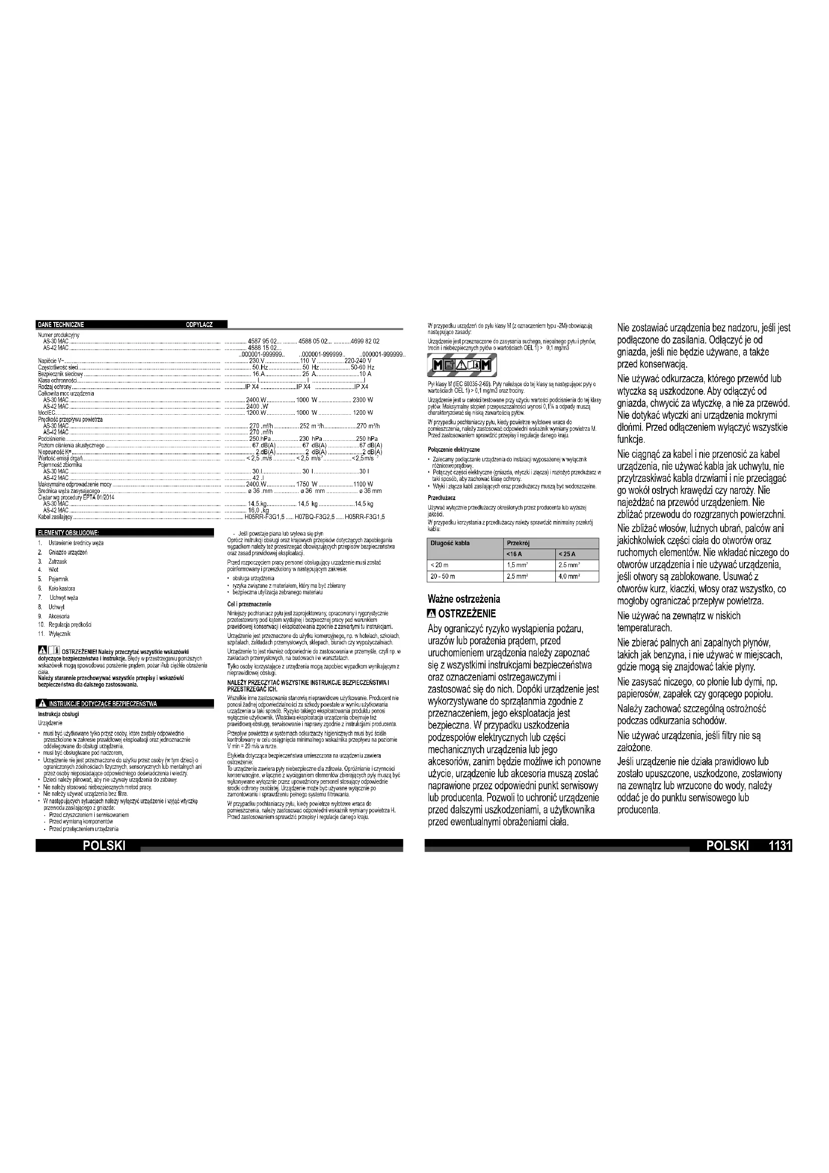 Jako producent oświadczamy na naszą wyłączną odpowiedzialność, że produkt opisany w punkcie „Dane techniczne” jest zgodny ze wszystkimi istotnymi przepisami Dyrektywy 2011/65/EU (RoHS), 20014/30/UE, 2006/42/WE oraz z następującymi zharmonizowanymi dokumentami normatywnymi: EN 60335-1:2012+AC:2014+A11:2014+A13:2017 EN 60335-2-69:2012 EN 55014-1:2017+A11:2020 EN 55014-2:2015 EN 61000-3-2:2014 EN 61000-3-3:2013 EN IEC 63000:2018 Winnenden, 2020-12-01 Alexander Krug Managing Director Upełnomocniony do zestawienia danych technicznych Techtronic Industries GmbH Max-Eyth-Straße 10 71364 Winnenden Germany SYMBOLE UWAGA! OSTRZEŻENIE NIEBEZPIECZEŃSTWO! Przed przystąpieniem do jakichkolwiek prac związanych z elektronarzędziem należy wyjąć wtyczkę z gniazdka. Przed uruchomieniem elektronarzędzia zapoznać się uważnie z treścią instrukcji. Zużyty sprzęt elektryczny i elektroniczny nie może być usuwany razem z odpadami pochodzącymi z gospodarstw domowych. Zużyty sprzęt elektryczny i elektroniczny należy gromadzić i usuwać oddzielnie. Przed utylizacją należy usunąć źródła światła z urządzeń. Proszę zasięgnąć informacji o centrach recyklingowych i punktach zbiorczych u władz lokalnych lub u wyspecjalizowanego dostawcy. W zależności od lokalnych przepisów, sprzedawcy detaliczni mogą być zobowiązani do bezpłatnego odbioru zużytego sprzętu elektrycznego i elektronicznego. Poprzez ponowne wykorzystanie i recykling zużytego sprzętu elektrycznego i elektronicznego pomagamy zmniejszać zapotrzebowanie na surowce. Zużyty sprzęt elektryczny i elektroniczny zawiera cenne materiały nadające się do recyklingu, które mogą mieć negatywny wpływ na środowisko naturalne i zdrowie użytkownika, jeśli nie zostaną zutylizowane w sposób przyjazny dla środowiska. Przed utylizacją zużytego sprzętu należy usunąć wszelkie zamieszczone na nim dane osobowe. Pył klasy M (IEC 60335-2-69). Pyły należące do tej klasy mają wartości OEL