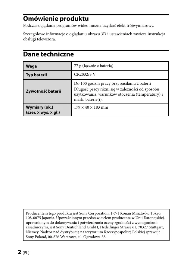 Obs! När du öppnar eller stänger batterifacket ska du se till att myntet etc. är ordentligt insatt i spåret i batterilocket. Felsökning Se TV:ns bruksanvisning om det uppstår ett problem. (SE) Omówienie produktu Podczas oglądania programów wideo można uzyskać efekt trójwymiarowy. Szczegółowe informacje o oglądaniu obrazu 3D i ustawieniach zawiera instrukcja obsługi telewizora. Dane techniczne Waga 77 g (łącznie z baterią) Typ baterii CR2032/3 V Żywotność baterii Do 100 godzin pracy przy zasilaniu z baterii Długość pracy różni się w zależności od sposobu użytkowania, warunków otoczenia (temperatury) i marki baterie(i). Wymiary (ok.) (szer. × wys. × gł.) 179 × 40 × 183 mm Producentem tego produktu jest Sony Corporation, 1-7-1 Konan Minato-ku Tokyo, 108-0075 Japonia. Upoważnionym przedstawicielem producenta w Unii Europejskiej, uprawnionym do dokonywania i potwierdzania oceny zgodności z wymaganiami zasadniczymi, jest Sony Deutschland GmbH, Hedelfinger Strasse 61, 70327 Stuttgart, Niemcy. Nadzór nad dystrybucją na terytorium Rzeczypospolitej Polskiej sprawuje Sony Poland, 00-876 Warszawa, ul. Ogrodowa 58. (PL) Pozbywanie się zużytych baterii (stosowane w krajach Unii Europejskiej i w pozostałych krajach europejskich mających własne systemy zbiórki) Ten symbol na baterii lub na jej opakowaniu oznacza, że bateria nie może być traktowana jako odpad komunalny. Symbol ten dla pewnych baterii może być stosowany w kombinacji z symbolem chemicznym. Symbole chemiczne rtęci (Hg) lub ołowiu (Pb) są dodawane, jeśli bateria zawiera więcej niż 0,0005% rtęci lub 0,004% ołowiu. Odpowiednio gospodarując zużytymi bateriami, możesz zapobiec potencjalnym negatywnym wpływom na środowisko oraz zdrowie ludzi, jakie mogłyby wystąpić w przypadku niewłaściwego obchodzenia się z tymi odpadami. Recykling baterii pomoże chronić środowisko naturalne. W przypadku produktów, w których ze względu na bezpieczeństwo, poprawne działanie lub integralność danych wymagane jest stałe podłączenie do baterii, wymianę zużytej baterii należy zlecić wyłącznie wykwalifikowanemu personelowi stacji serwisowej. Aby mieć pewność, że bateria znajdująca się w zużytym sprzęcie elektrycznym i elektronicznym będzie właściwie zagospodarowana, należy dostarczyć sprzęt do odpowiedniego punktu zbiórki. W odniesieniu do wszystkich pozostałych zużytych baterii, prosimy o zapoznanie się z rozdziałem instrukcji obsługi produktu o bezpiecznym demontażu baterii. Zużytą baterię należy dostarczyć do właściwego punktu zbiórki. W celu uzyskania bardziej szczegółowych informacji na temat zbiórki i recyklingu baterii należy skontaktować się z lokalną jednostką samorządu terytorialnego, ze służbami zajmującymi się zagospodarowywaniem odpadów lub ze sklepem, w którym zakupiony został ten produkt. Pozbywanie się Okularów 3D Pozbycie się zużytego sprzętu (stosowane w krajach Unii Europejskiej i w pozostałych krajach europejskich stosujących własne systemy zbiórki) Ten symbol na produkcie lub jego opakowaniu oznacza, że produkt nie może być traktowany jako odpad komunalny, lecz powinno się go dostarczyć do odpowiedniego punktu zbiórki sprzętu elektrycznego i elektronicznego, w celu recyklingu. Odpowiednie zadysponowanie zużytego produktu zapobiega potencjalnym negatywnym wpływom na środowisko oraz zdrowie ludzi, jakie mogłyby wystąpić w przypadku niewłaściwego zagospodarowania odpadów. Recykling materiałów pomoże w ochronie środowiska naturalnego. W celu uzyskania bardziej szczegółowych informacji na temat recyklingu tego produktu, należy skontaktować się z lokalną jednostką samorządu terytorialnego, ze służbami zagospodarowywania odpadów lub ze sklepem, w którym zakupiony został ten produkt. (PL)