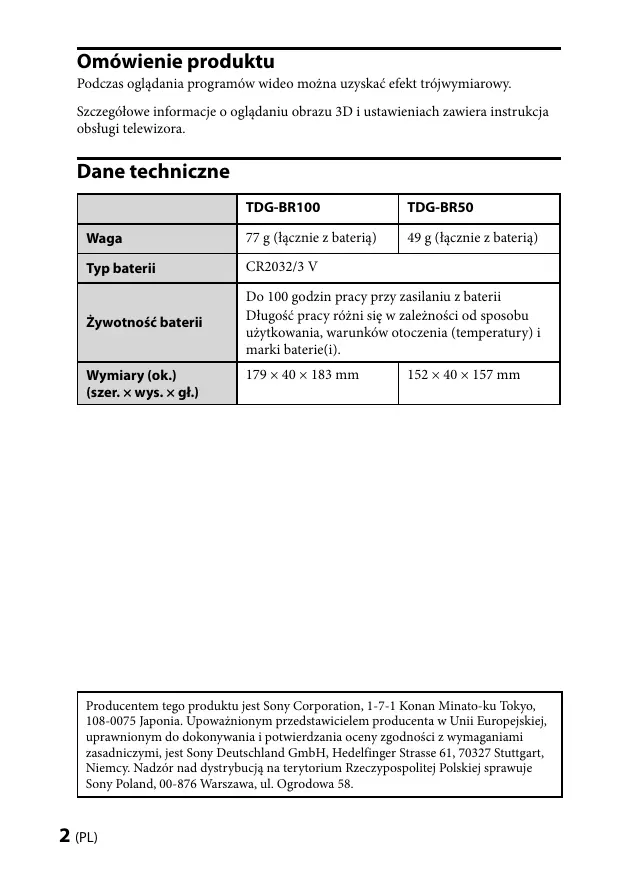 Batteri (CR2032) Tryck på knappen på batterilocket med spetsen på t.ex. en penna. () Skjut batterilocket uppåt för att öppna. () Skjut tillbaka batterilocket för att stänga. () Felsökning Se TV:ns bruksanvisning om det uppstår ett problem. (SE) Omówienie produktu Podczas oglądania programów wideo można uzyskać efekt trójwymiarowy. Szczegółowe informacje o oglądaniu obrazu 3D i ustawieniach zawiera instrukcja obsługi telewizora. Dane techniczne TDG-BR100 TDG-BR50 Waga 77 g (łącznie z baterią) 49 g (łącznie z baterią) Typ baterii CR2032/3 V Żywotność baterii Do 100 godzin pracy przy zasilaniu z baterii Długość pracy różni się w zależności od sposobu użytkowania, warunków otoczenia (temperatury) i marki baterie(i). Wymiary (ok.) (szer. × wys. × gł.) 179 × 40 × 183 mm 152 × 40 × 157 mm Producentem tego produktu jest Sony Corporation, 1-7-1 Konan Minato-ku Tokyo, 108-0075 Japonia. Upoważnionym przedstawicielem producenta w Unii Europejskiej, uprawnionym do dokonywania i potwierdzania oceny zgodności z wymaganiami zasadniczymi, jest Sony Deutschland GmbH, Hedelfinger Strasse 61, 70327 Stuttgart, Niemcy. Nadzór nad dystrybucją na terytorium Rzeczypospolitej Polskiej sprawuje Sony Poland, 00-876 Warszawa, ul. Ogrodowa 58. (PL) Pozbywanie się zużytych baterii (stosowane w krajach Unii Europejskiej i w pozostałych krajach europejskich mających własne systemy zbiórki) Ten symbol na baterii lub na jej opakowaniu oznacza, że bateria nie może być traktowana jako odpad komunalny. Symbol ten dla pewnych baterii może być stosowany w kombinacji z symbolem chemicznym. Symbole chemiczne rtęci (Hg) lub ołowiu (Pb) są dodawane, jeśli bateria zawiera więcej niż 0,0005% rtęci lub 0,004% ołowiu. Odpowiednio gospodarując zużytymi bateriami, możesz zapobiec potencjalnym negatywnym wpływom na środowisko oraz zdrowie ludzi, jakie mogłyby wystąpić w przypadku niewłaściwego obchodzenia się z tymi odpadami. Recykling baterii pomoże chronić środowisko naturalne. W przypadku produktów, w których ze względu na bezpieczeństwo, poprawne działanie lub integralność danych wymagane jest stałe podłączenie do baterii, wymianę zużytej baterii należy zlecić wyłącznie wykwalifikowanemu personelowi stacji serwisowej. Aby mieć pewność, że bateria znajdująca się w zużytym sprzęcie elektrycznym i elektronicznym będzie właściwie zagospodarowana, należy dostarczyć sprzęt do odpowiedniego punktu zbiórki. W odniesieniu do wszystkich pozostałych zużytych baterii, prosimy o zapoznanie się z rozdziałem instrukcji obsługi produktu o bezpiecznym demontażu baterii. Zużytą baterię należy dostarczyć do właściwego punktu zbiórki. W celu uzyskania bardziej szczegółowych informacji na temat zbiórki i recyklingu baterii należy skontaktować się z lokalną jednostką samorządu terytorialnego, ze służbami zajmującymi się zagospodarowywaniem odpadów lub ze sklepem, w którym zakupiony został ten produkt. Pozbywanie się Okularów 3D Pozbycie się zużytego sprzętu (stosowane w krajach Unii Europejskiej i w pozostałych krajach europejskich stosujących własne systemy zbiórki) Ten symbol na produkcie lub jego opakowaniu oznacza, że produkt nie może być traktowany jako odpad komunalny, lecz powinno się go dostarczyć do odpowiedniego punktu zbiórki sprzętu elektrycznego i elektronicznego, w celu recyklingu. Odpowiednie zadysponowanie zużytego produktu zapobiega potencjalnym negatywnym wpływom na środowisko oraz zdrowie ludzi, jakie mogłyby wystąpić w przypadku niewłaściwego zagospodarowania odpadów. Recykling materiałów pomoże w ochronie środowiska naturalnego. W celu uzyskania bardziej szczegółowych informacji na temat recyklingu tego produktu, należy skontaktować się z lokalną jednostką samorządu terytorialnego, ze służbami zagospodarowywania odpadów lub ze sklepem, w którym zakupiony został ten produkt. Przestroga Należy zapoznać się z tymi instrukcjami, aby zapewnić bezpieczeństwo osobiste i zapobiec uszkodzeniom mienia. (Ciąg dalszy) (PL)