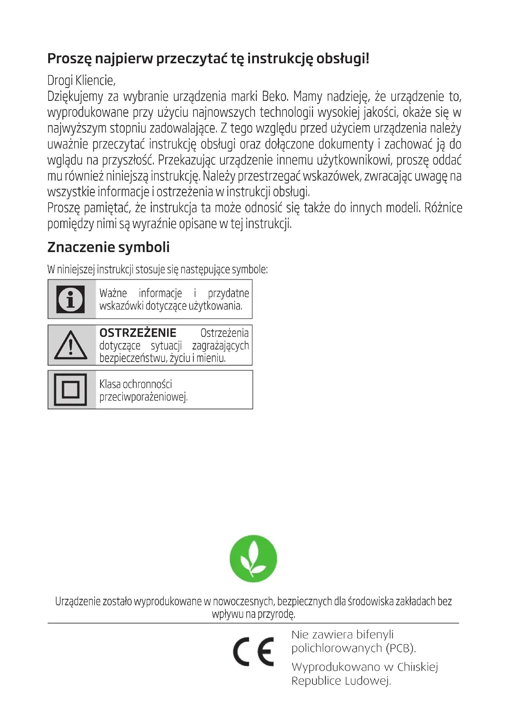 - Ha leejti az alkalmazást, azzal működésképtelenné teheti vagy maradandó károsodást okozhat. 4 Tisztítás és ápolásProszę najpierw przeczytać tę instrukcję obsługi! Drogi Kliencie, Dziękujemy za wybranie urządzenia marki Beko. Mamy nadzieję, że urządzenie to, wyprodukowane przy użyciu najnowszych technologii wysokiej jakości, okaże się w najwyższym stopniu zadowalające. Z tego względu przed użyciem urządzenia należy uważnie przeczytać instrukcję obsługi oraz dołączone dokumenty i zachować ją do wglądu na przyszłość. Przekazując urządzenie innemu użytkownikowi, proszę oddać mu również niniejszą instrukcję. Należy przestrzegać wskazówek, zwracając uwagę na wszystkie informacje i ostrzeżenia w instrukcji obsługi. Proszę pamiętać, że instrukcja ta może odnosić się także do innych modeli. Różnice pomiędzy nimi są wyraźnie opisane w tej instrukcji. Znaczenie symboli W nnejszej nstrukcj stosuje sę następujące symbole: