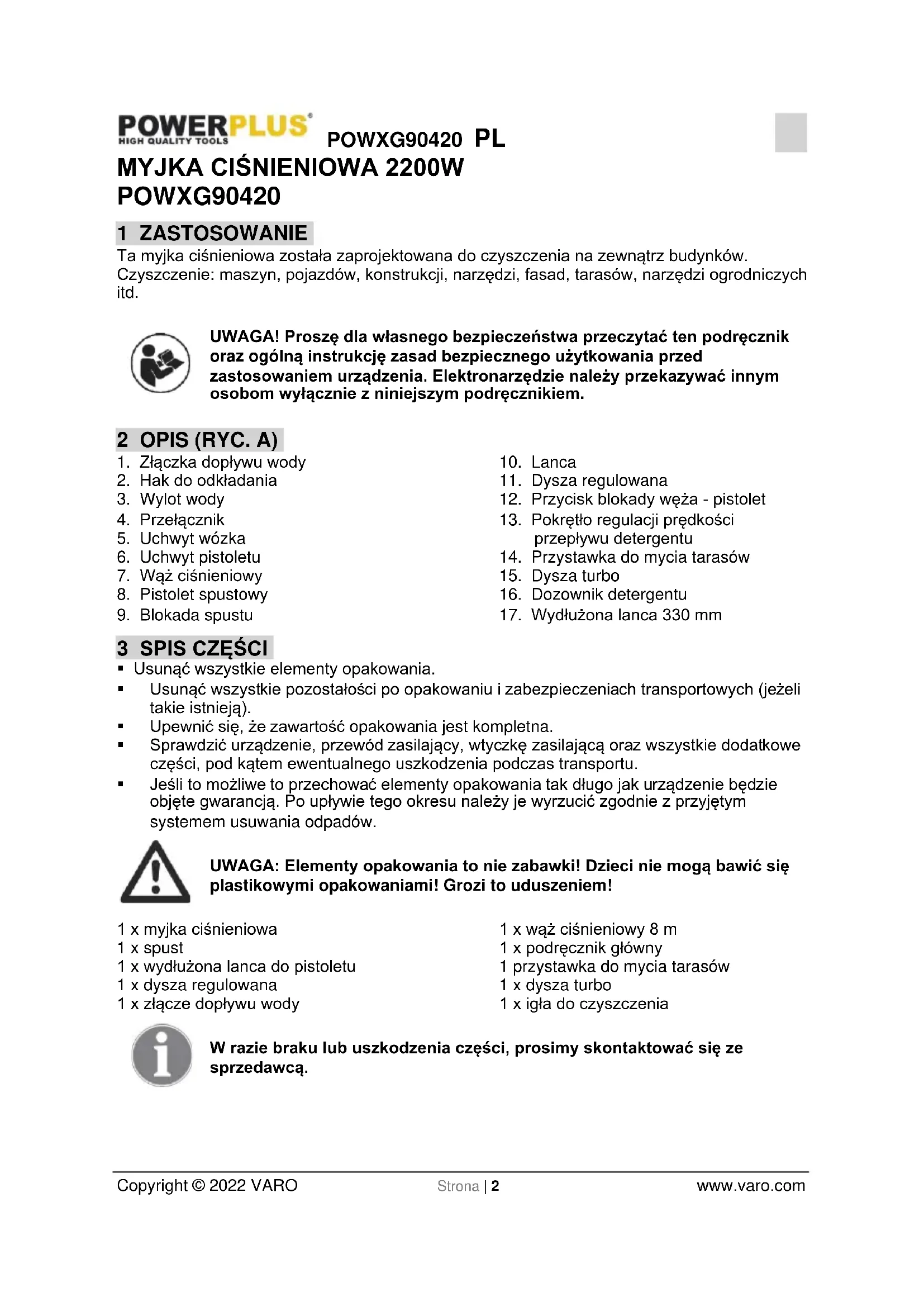 - Jeśli to możliwe to przechować elementy opakowania tak długo jak urządzenie będzie objęte gwarancją. Po upływie tego okresu należy je wyrzucić zgodnie z przyjętym systemem usuwania odpadów. UWAGA: Elementy opakowania to nie zabawki! Dzieci nie mogą bawić się plastikowymi opakowaniami! Grozi to uduszeniem! 1 x myjka ciśnieniowa 1 x spust 1 x wydłużona lanca do pistoletu 1 x dysza regulowana 1 x złącze dopływu wody 1 x wąż ciśnieniowy 8 m 1 x podręcznik główny 1 przystawka do mycia tarasów 1 x dysza turbo 1 x igła do czyszczenia W razie braku lub uszkodzenia części, prosimy skontaktować się ze sprzedawcą.POWXG90420 PL Copyright © 2022 VARO Strona | 3 www.varo.com 4 DODATKOWE INSTRUKCJE BEZPIECZEŃSTWA PRACY Z MYJKĄ CIŚNIENIOWĄ