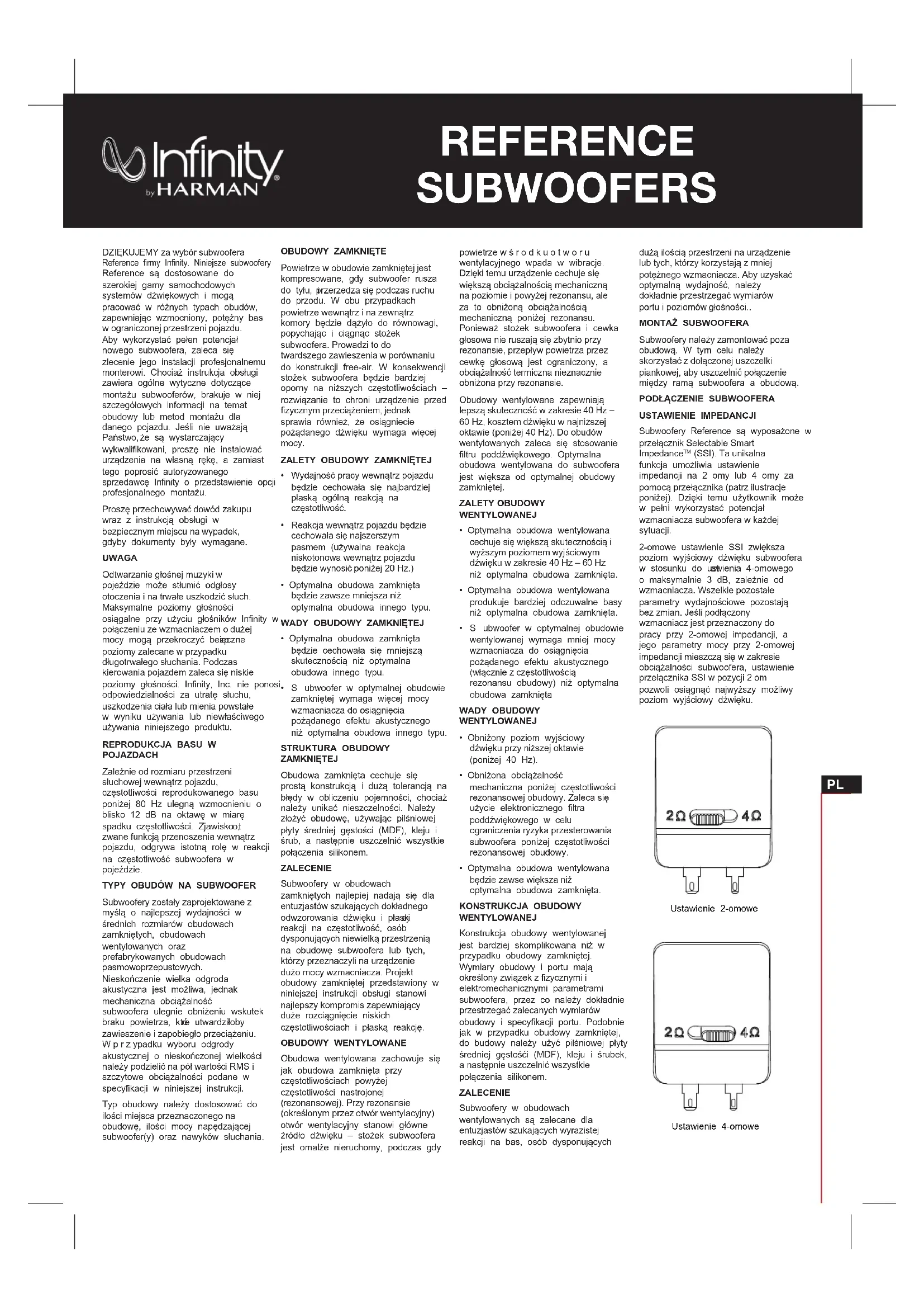 5-5/8" (142mm)9" (228mm)10-3/4" (272mm)11/16" (17 mm)6-1/2" (165mm)11-1/4" (285mm)12-15/16" (328mm)11/16" (17 mm)PL DZIĘKUJEMY zawybór subwoofera Reference firmy Infinity. Niniejsze subwoofery szerokiej gamy samochodowych systemów dźwiękowych i mogą pracować w różnych typach obudów, zapewniając wzmocniony, potężny bas w ograniczonej przestrzeni pojazdu. Aby wykorzystać pełen potencjał nowego subwoofera, zaleca się zlecenie jego instalacji profesjonalnemu monterowi. Chociaż instrukcja obsługi zawiera ogólne wytyczne dotyczące montażu subwooferów, brakuje w niej szczegółowych informacji na temat obudowy lub metod montażu dla danego pojazdu. Jeśli nie uważają Państwo, że są wystarczający wykwalifikowani, proszę nie instalować urządzenia na własną rękę, a zamiast tego poprosić autoryzowanego profesjonalnego montażu. Proszęprzechowywać dowód zakupu wraz z instrukcją obsługi w bezpiecznym miejscu na wypadek, gdyby dokumenty były wymagane. UWAGA Odtwarzanie głośnej muzyki w pojeździe może stłumić odgłosy otoczenia i na trwałe uszkodzić słuch. Maksymalne poziomy głośności połączeniu zewzmacniaczem o dużej mocy mogą przekroczyć bezp ieczne poziomy zalecane w przypadku długotrwałego słuchania. Podczas kierowania pojazdem zaleca się niskie odpowiedzialności za utratę słuchu, uszkodzenia ciała lub mienia powstałe w wyniku używania lub niewłaściwego używania niniejszego produktu.