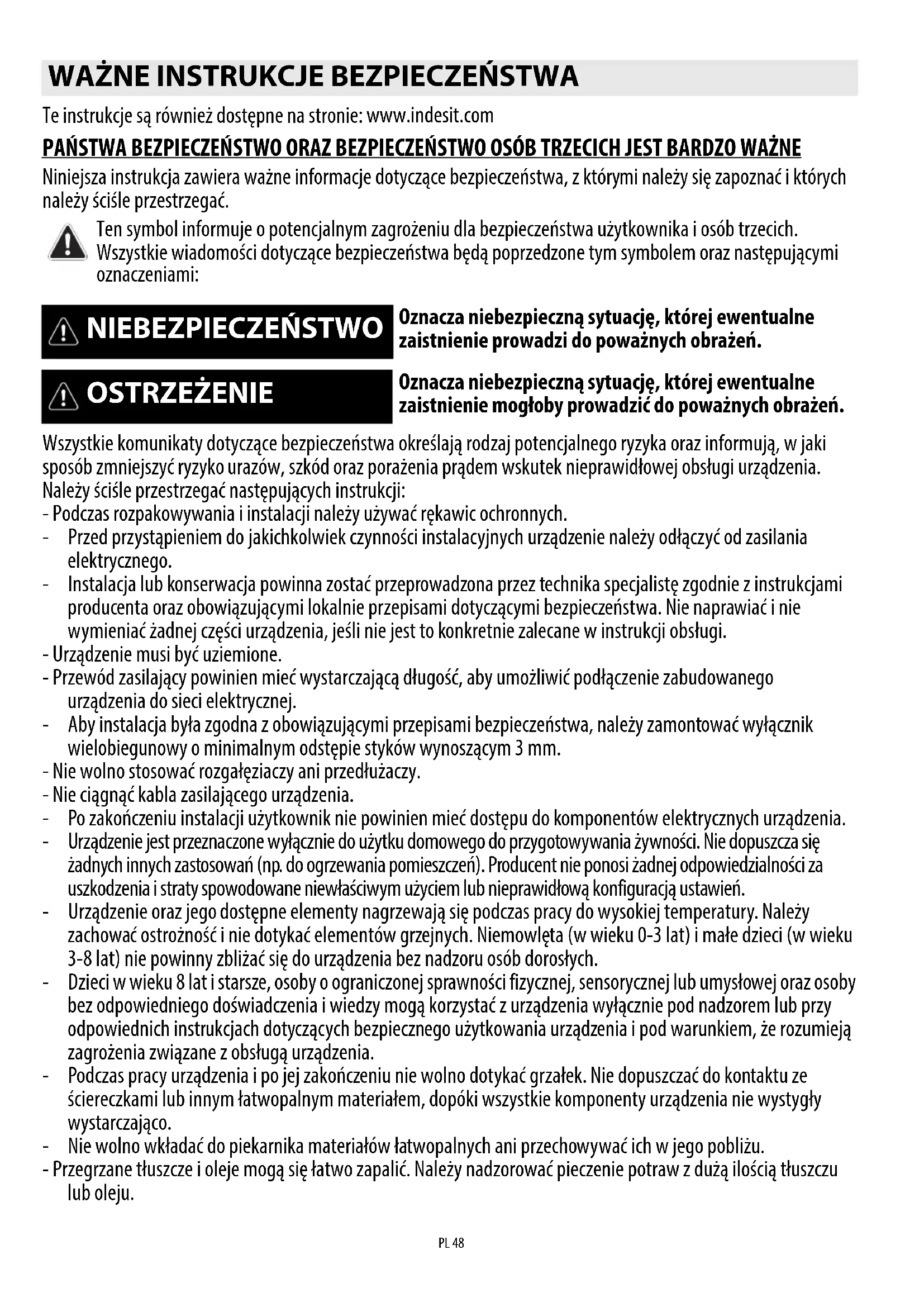 - uw telefoonnummer. Wanneer er een reparatie nodig is, neem dan contact op met een officieel klantenservicecentrum (om te garanderen dat er originele reserveonderdelen worden gebruikt en de reparatie correct wordt uitgevoerd). De reserveonderdelen blijven nog 10 jaar lang verkrijgbaar. KLANTENSERVICEPL 48 Te instrukcje są również dostępne na stronie: PAŃSTWA BEZPIECZEŃSTWO ORAZ BEZPIECZEŃSTWO OSÓB TRZECICH JEST BARDZO WAŻNE Niniejsza instrukcja zawiera ważne informacje dotyczące bezpieczeństwa, z którymi należy się zapoznać i których należy ściśle przestrzegać. Wszystkie komunikaty dotyczące bezpieczeństwa określają rodzaj potencjalnego ryzyka oraz informują, w jaki sposób zmniejszyć ryzyko urazów, szkód oraz porażenia prądem wskutek nieprawidłowej obsługi urządzenia. Należy ściśle przestrzegać następujących instrukcji: - Podczas rozpakowywania i instalacji należy używać rękawic ochronnych. - Przed przystąpieniem do jakichkolwiek czynności instalacyjnych urządzenie należy odłączyć od zasilania elektrycznego. - Instalacja lub konserwacja powinna zostać przeprowadzona przez technika specjalistę zgodnie z instrukcjami producenta oraz obowiązującymi lokalnie przepisami dotyczącymi bezpieczeństwa. Nie naprawiać i nie wymieniać żadnej części urządzenia, jeśli nie jest to konkretnie zalecane w instrukcji obsługi. - Urządzenie musi być uziemione. - Przewód zasilający powinien mieć wystarczającą długość, aby umożliwić podłączenie zabudowanego urządzenia do sieci elektrycznej. - Aby instalacja była zgodna z obowiązującymi przepisami bezpieczeństwa, należy zamontować wyłącznik wielobiegunowy o minimalnym odstępie styków wynoszącym 3 mm. - Nie wolno stosować rozgałęziaczy ani przedłużaczy. - Nie ciągnąć kabla zasilającego urządzenia. - Po zakończeniu instalacji użytkownik nie powinien mieć dostępu do komponentów elektrycznych urządzenia. - Urządzenie jest przeznaczone wyłącznie do użytku domowego do przygotowywania żywności. Nie dopuszcza się żadnych innych zastosowań (np. do ogrzewania pomieszczeń). Producent nie ponosi żadnej odpowiedzialności za uszkodzenia i straty spowodowane niewłaściwym użyciem lub nieprawidłową konfiguracją ustawień. - Urządzenie oraz jego dostępne elementy nagrzewają się podczas pracy do wysokiej temperatury. Należy zachować ostrożność i nie dotykać elementów grzejnych. Niemowlęta (w wieku 0-3 lat) i małe dzieci (w wieku 3-8 lat) nie powinny zbliżać się do urządzenia bez nadzoru osób dorosłych. - Dzieci w wieku 8 lat i starsze, osoby o ograniczonej sprawności fizycznej, sensorycznej lub umysłowej oraz osoby bez odpowiedniego doświadczenia i wiedzy mogą korzystać z urządzenia wyłącznie pod nadzorem lub przy odpowiednich instrukcjach dotyczących bezpiecznego użytkowania urządzenia i pod warunkiem, że rozumieją zagrożenia związane z obsługą urządzenia. - Podczas pracy urządzenia i po jej zakończeniu nie wolno dotykać grzałek. Nie dopuszczać do kontaktu ze ściereczkami lub innym łatwopalnym materiałem, dopóki wszystkie komponenty urządzenia nie wystygły wystarczająco. - Nie wolno wkładać do piekarnika materiałów łatwopalnych ani przechowywać ich w jego pobliżu. - Przegrzane tłuszcze i oleje mogą się łatwo zapalić. Należy nadzorować pieczenie potraw z dużą ilością tłuszczu lub oleju.