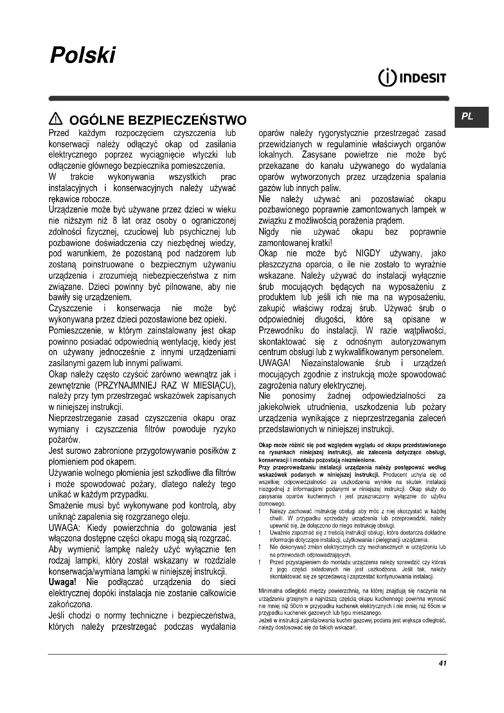 Przed każdym rozpoczęciem czyszczenia lub konserwacji należy odłączyć okap od zasilania elektrycznego poprzez wyciągnięcie wtyczki lub odłączenie głównego bezpiecznika pomieszczenia. W trakcie wykonywania wszystkich prac instalacyjnych i konserwacyjnych należy używać rękawice robocze. Urządzenie może być używane przez dzieci w wieku nie niższym niż 8 lat oraz osoby o ograniczonej zdolności fizycznej, czuciowej lub psychicznej lub pozbawione doświadczenia czy niezbędnej wiedzy, pod warunkiem, że pozostaną pod nadzorem lub zostaną poinstruowane o bezpiecznym używaniu urządzenia i zrozumieją niebezpieczeństwa z nim związane. Dzieci powinny być pilnowane, aby nie bawiły się urządzeniem. Czyszczenie i konserwacja nie może być wykonywana przez dzieci pozostawione bez opieki. Pomieszczenie, w którym zainstalowany jest okap powinno posiadać odpowiednią wentylację, kiedy jest on używany jednocześnie z innymi urządzeniami zasilanymi gazem lub innymi paliwami. Okap należy często czyścić zarówno wewnątrz jak i zewnętrznie (PRZYNAJMNIEJ RAZ W MIESIĄCU), należy przy tym przestrzegać wskazówek zapisanych w niniejszej instrukcji. Nieprzestrzeganie zasad czyszczenia okapu oraz wymiany i czyszczenia filtrów powoduje ryzyko pożarów. Jest surowo zabronione przygotowywanie posiłków z płomieniem pod okapem. Używanie wolnego płomienia jest szkodliwe dla filtrów i może spowodować pożary, dlatego należy tego unikać w każdym przypadku. Smażenie musi być wykonywane pod kontrolą, aby uniknąć zapalenia się rozgrzanego oleju. UWAGA: Kiedy powierzchnia do gotowania jest włączona dostępne części okapu mogą sią rozgrzać. Aby wymienić lampkę należy użyć wyłącznie ten rodzaj lampki, który został wskazany w rozdziale konserwacja/wymiana lampki w niniejszej instrukcji. Uwaga! Nie podłączać urządzenia do sieci elektrycznej dopóki instalacja nie zostanie całkowicie zakończona. Jeśli chodzi o normy techniczne i bezpieczeństwa, których należy przestrzegać podczas wydalania oparów należy rygorystycznie przestrzegać zasad przewidzianych w regulaminie właściwych organów lokalnych. Zasysane powietrze nie może być przekazane do kanału używanego do wydalania oparów wytworzonych przez urządzenia spalania gazów lub innych paliw. Nie należy używać ani pozostawiać okapu pozbawionego poprawnie zamontowanych lampek w związku z możliwością porażenia prądem. Nigdy nie używać okapu bez poprawnie zamontowanej kratki! Okap nie może być NIGDY używany, jako płaszczyzna oparcia, o ile nie zostało to wyraźnie wskazane. Należy używać do instalacji wyłącznie śrub mocujących będących na wyposażeniu z produktem lub jeśli ich nie ma na wyposażeniu, zakupić właściwy rodzaj śrub. Używać śrub o odpowiedniej długości, które są opisane w Przewodniku do instalacji. W razie wątpliwości, skontaktować się z odnośnym autoryzowanym centrum obsługi lub z wykwalifikowanym personelem. UWAGA! Niezainstalowanie śrub i urządzeń mocujących zgodnie z instrukcją może spowodować zagrożenia natury elektrycznej. Nie ponosimy żadnej odpowiedzialności za jakiekolwiek utrudnienia, uszkodzenia lub pożary urządzenia wynikające z nieprzestrzegania zaleceń przedstawionych w niniejszej instrukcji. Okap może różnić się pod względem wyglądu od okapu przedstawionego na rysunkach niniejszej instrukcji, ale zalecenia dotyczące obsługi, konserwacji i montażu pozostają niezmienione. Przy przeprowadzaniu instalacji urządzenia należy postępować według wskazówek podanych w niniejszej instrukcji. Producent uchyla się od wszelkiej odpowiedzialności za uszkodzenia wynikłe na skutek instalacji niezgodnej z informacjami podanymi w niniejszej instrukcji. Okap służy do zasysania oparów kuchennych i jest przeznaczony wyłącznie do użytku domowego. ! Należy zachować instrukcję obsługi aby móc z niej skorzystać w każdej chwili. W przypadku sprzedaży urządzenia lub przeprowadzki, należy upewnić się, że dołączono do niego instrukcję obsługi. ! Uważnie zapoznać się z treścią instrukcji obs ługi, która dostarcza dokładne informacje dotyczące instalacji, użytkowania i pielęgnacji urządzenia.. ! Nie dokonywać zmian elektrycznych czy mechanicznych w urządzeniu lub na przewodach odprowadzających. ! Przed przystąpieniem do montażu urządzenia należy sprawdzić czy któraś z jego części składowych nie jest uszkodzona. Jeśli tak, należy skontaktować się ze sprzedawcą i zaprzestać kontynuowania instalacji. Minimalna odległość między powierzchnią, na której znajdują się naczynia na urządzeniu grzejnym a najniższą częścią okapu kuchennego powinna wynosić nie mniej niż 50cm w przypadku kuchenek elektrycznych i nie mniej niż 65cm w przypadku kuchenek gazowych lub typu mieszanego. Jeżeli w instrukcji zainstalowania kuchni gazowej podana jest większa odległość, należy dostosować się do takich wskaza ń.42