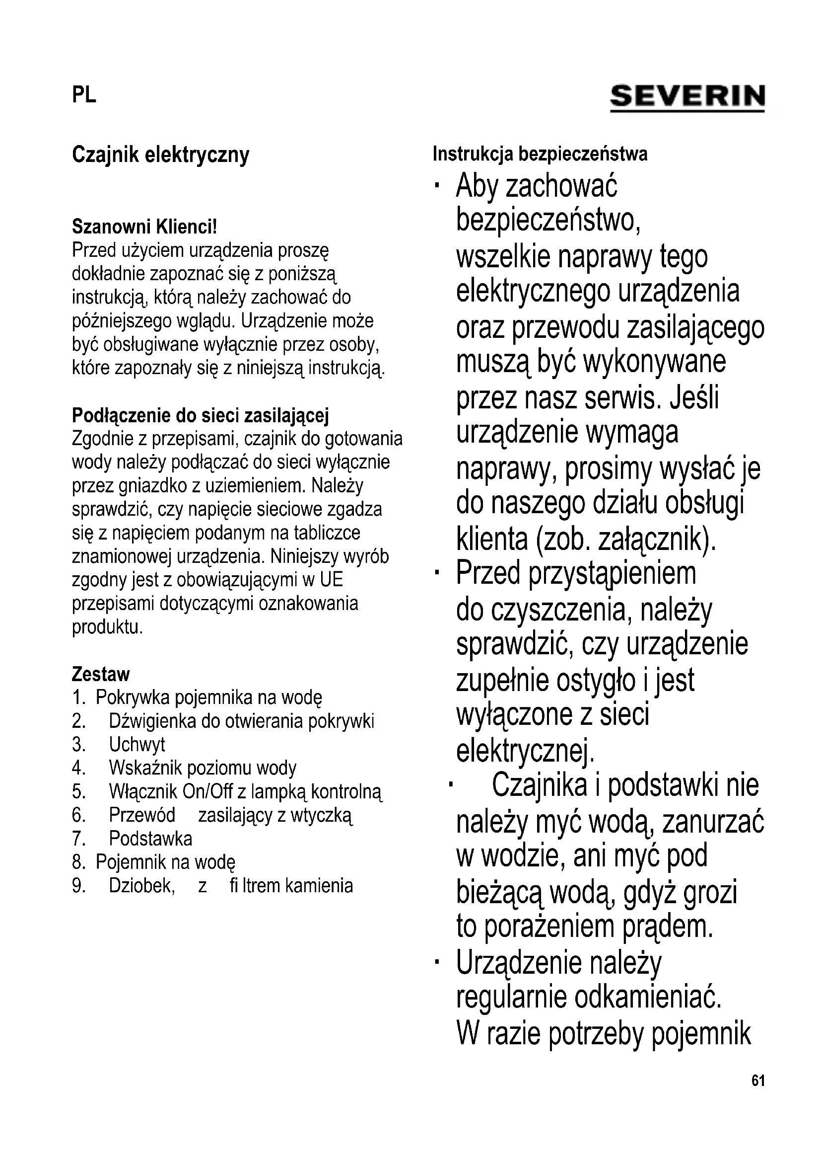 Instrukcja bezpieczeństwa ∙ Aby zachować bezpieczeństwo, wszelkie naprawy tego elektrycznego urządzenia oraz przewodu zasilającego muszą być wykonywane przez nasz serwis. Jeśli urządzenie wymaga naprawy, prosimy wysłać je do naszego działu obsługi klienta (zob. załącznik). ∙ Przed przystąpieniem do czyszczenia, należy sprawdzić, czy urządzenie zupełnie ostygło i jest wyłączone z sieci elektrycznej. ∙ Czajnika i podstawki nie należy myć wodą, zanurzać w wodzie, ani myć pod bieżącą wodą, gdyż grozi to porażeniem prądem. ∙ Urządzenie należy regularnie odkamieniać. W razie potrzeby pojemnik PL62 na wodę należy wyczyścić wilgotną ściereczką. ∙ Szczegółowe informacje nt. czyszczenia urządzenia znajdują się w punkcie Konserwacja i czyszczenie. ∙ Osoby o ograniczonych zdolnościach fi zycznych, czuciowych lub psychicznych albo nieposiadające stosownego doświadczenia lub wiedzy, a także dzieci (w wieku co najmniej 8 lat), mogą korzystać z urządzenia, pod warunkiem że znajdują się pod nadzorem lub zostały poinstruowane, jak używać urządzenia i są w pełni świadome wszelkich zagrożeń i wymaganych środków ostrożności. ∙ Nie dopuszczać do używania urzą dzenia jako zabawki przez dzieci. ∙ Nie wolno pozwalać dzieciom na wykonywanie jakichkolwiek prac związanych bezpośrednio z konserwacją lub czyszczeniem urządzenia, a jeżeli już, to dziecko musi mieć co najmniej 8 lat i być nadzorowane przez osobę dorosłą. ∙ Nie dopuszczać do urządzenia i jego przewodu zasilającego dzieci w wieku poniżej 8 lat. ∙ Urządzenie przeznaczone jest do zastosowań domowych lub podobnych, jak np. w - kuchniach biurowych lub innych miejscach pracy; - agroturystyce; - hotelach, motelach itp. oraz innych podobnych lokalach (przez klientów); - pensjonatach. ∙ Korpus urządzenia rozgrzewa się do wysokiej63 temperatury w trakcie pracy i pozostaje gorący przez jakiś czas po jej zakończeniu. ∙ Nie należy zostawiać włączonego czajnika bez nadzoru. Pojemnik na wodę napełniać wyłącznie czystą wodą do żądanego poziomu między oznaczeniami Min. (0,5 l) a Max. (1,7 l) na skali. Przepełnienie pojemnika grozi wylaniem się wrzątku z urządzenia. ∙ Należy także uważać, aby nie oparzyć się gorącą parą wydobywającą się podczas gotowania. Nie dotykać żadnych części urządzenia oprócz uchwytu. ∙ Ostrzeżenie: Podczas gotowania a tak