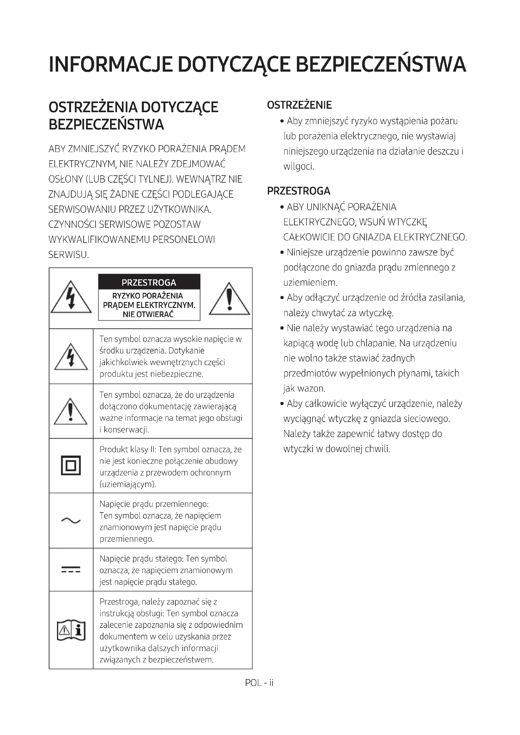 - Aby całkowicie wyłączyć urządzenie, należy wyciągnąć wtyczkę z gniazda sieciowego. Należy także zapewnić łatwy dostęp do wtyczki w dowolnej chwili.POL - iii