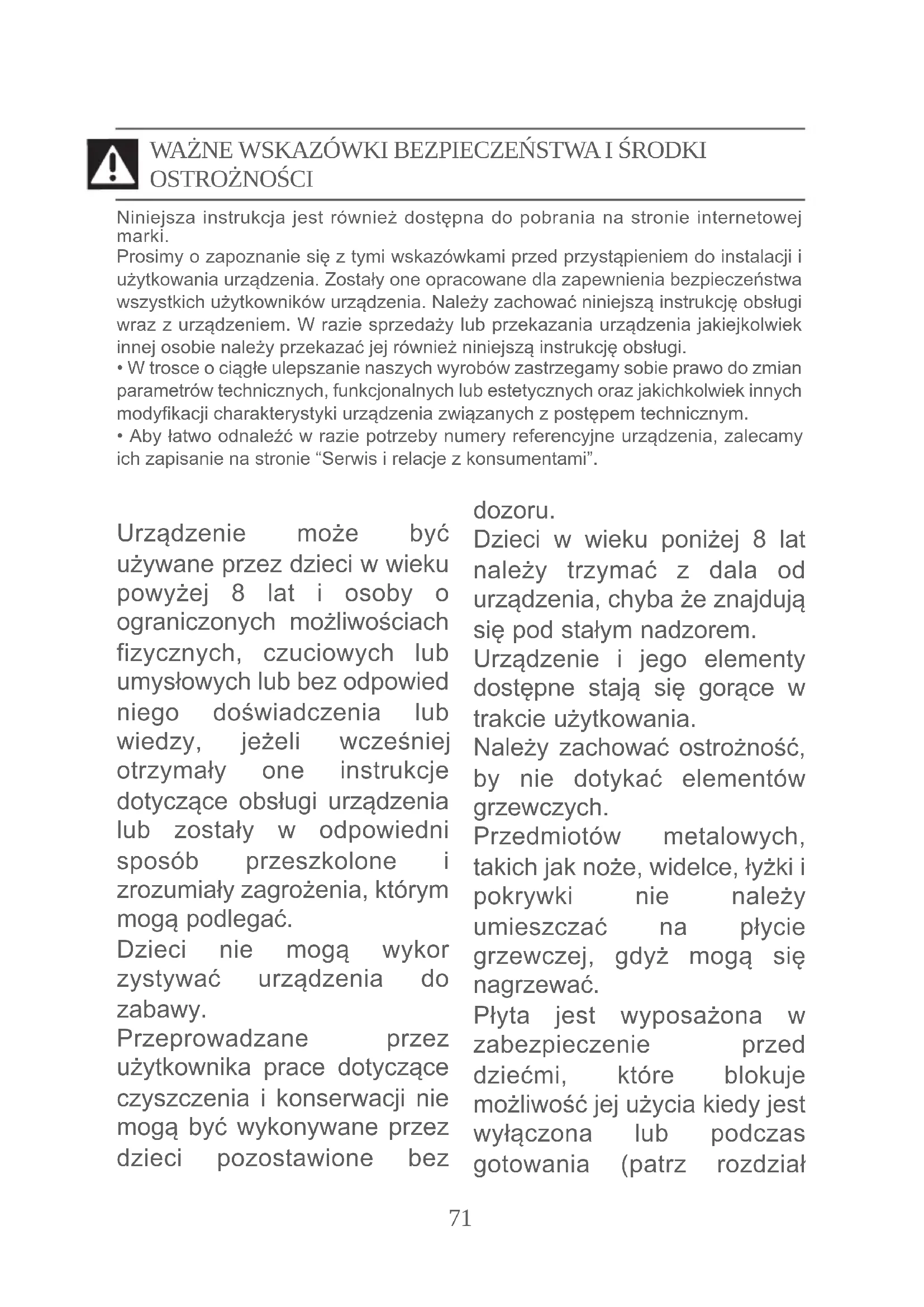- Aby łatwo odnaleźć w razie potrzeby numery referencyjne urządzenia, zalecamy ich zapisanie na stronie “Serwis i relacje z konsumentami”. Urządzenie może być używane przez dzieci w wieku powyżej 8 lat i osoby o ograniczonych możliwościach fizycznych, czuciowych lub umysłowych lub bez odpowied niego doświadczenia lub wiedzy, jeżeli wcześniej otrzymały one instrukcje dotyczące obsługi urządzenia lub zostały w odpowiedni sposób przeszkolone i zrozumiały zagrożenia, którym mogą podlegać. Dzieci nie mogą wykor zystywać urządzenia do zabawy. Przeprowadzane przez użytkownika prace dotyczące czyszczenia i konserwacji nie mogą być wykonywane przez dzieci pozostawione bez dozoru. Dzieci w wieku poniżej 8 lat należy trzymać z dala od urządzenia, chyba że znajdują się pod stałym nadzorem. Urządzenie i jego elementy dostępne stają się gorące w trakcie użytkowania. Należy zachować ostrożność, by nie dotykać elementów grzewczych. Przedmiotów metalowych, takich jak noże, widelce, łyżki i pokrywki nie należy umieszczać na płycie grzewczej, gdyż mogą się nagrzewać. Płyta jest wyposażona w zabezpieczenie przed dziećmi, które blokuje możliwość jej użycia kiedy jest wyłączona lub podczas gotowania (patrz rozdziałWAŻNE WSKAZÓWKI BEZPIECZEŃSTWA I ŚRODKI
