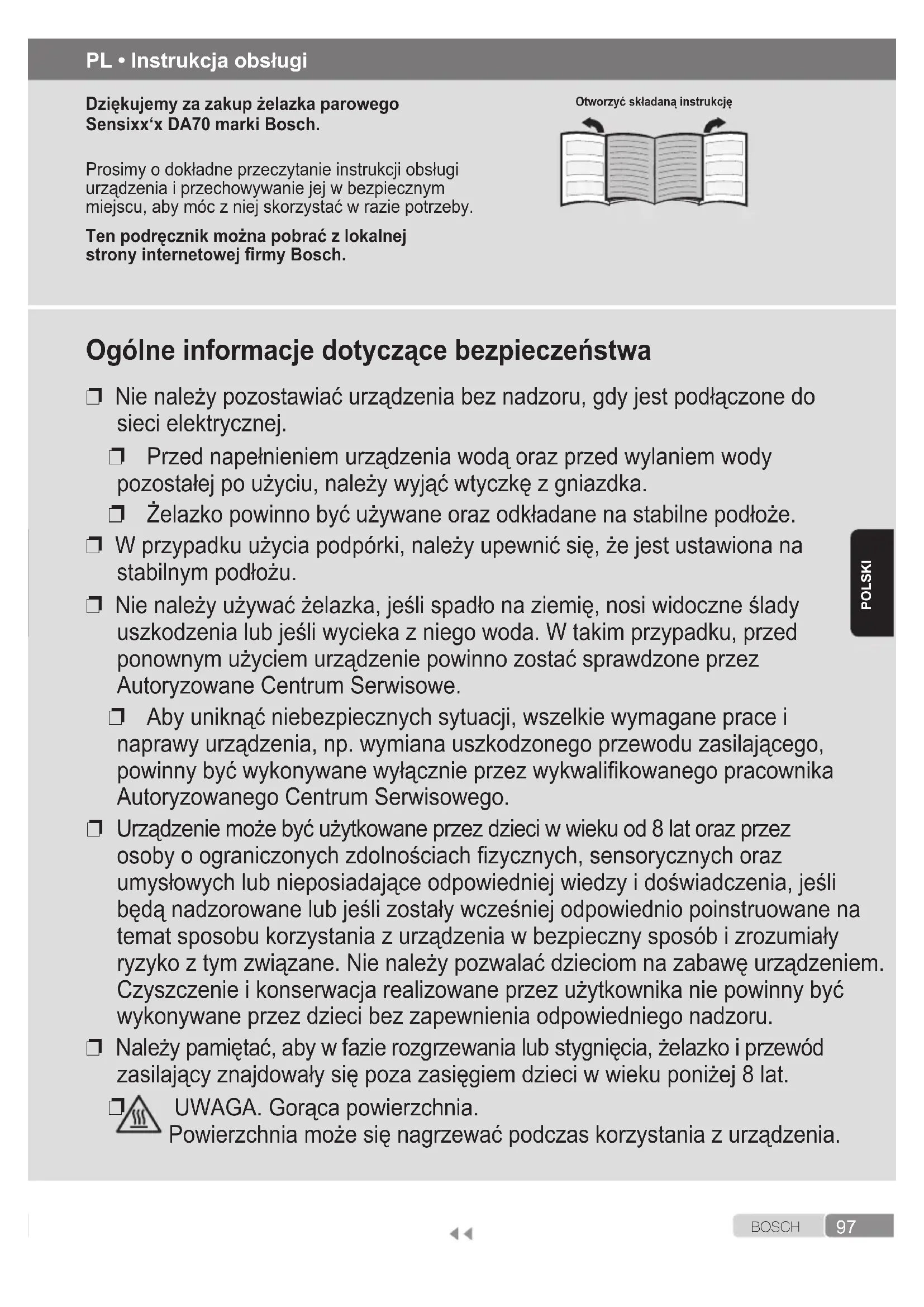 UWAGA. Gorąca powierzchnia. Powierzchnia może się nagrzewać podczas korzystania z urządzenia. PL • Instrukcja obsługi Dziękujemy za zakup żelazka parowego Sensixx‘x DA70 marki Bosch. Prosimy o dokładne przeczytanie instrukcji obsługi urządzenia i przechowywanie jej w bezpiecznym miejscu, aby móc z niej skorzystać w razie potrzeby. Ten podręcznik można pobrać z lokalnej strony internetowej rmy Bosch. Otworzyć składaną instrukcję98 B O S C H
