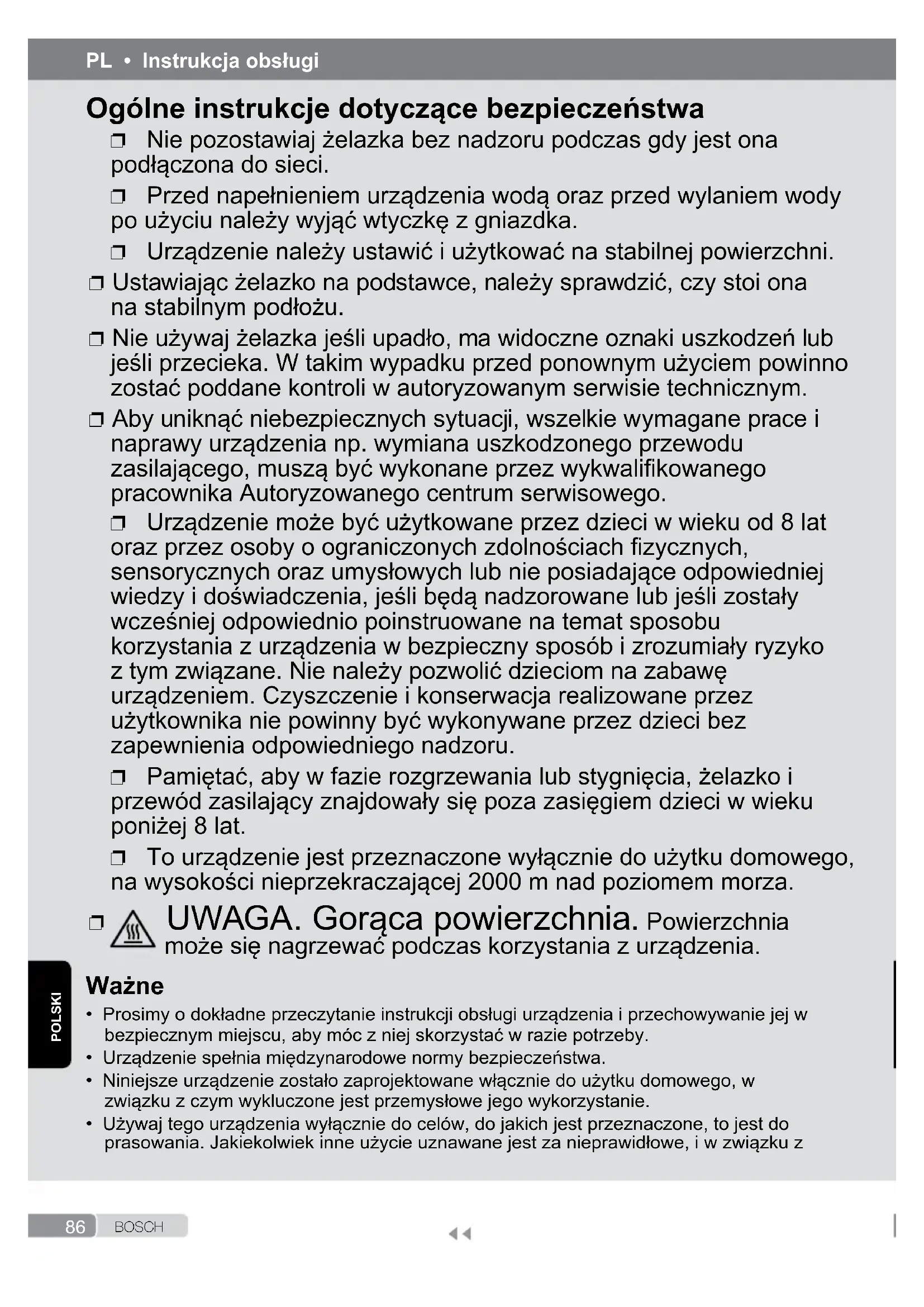 - Prosimy o dokładne przeczytanie instrukcji obsługi urządzenia i przechowywanie jej w bezpiecznym miejscu, aby móc z niej skorzystać w razie potrzeby.• Urządzenie spełnia międzynarodowe normy bezpieczeństwa.• Niniejsze urządzenie zostało zaprojektowane włącznie do użytku domowego, w związku z czym wykluczone jest przemysłowe jego wykorzystanie.• Używaj tego urządzenia wyłącznie do celów, do jakich jest przeznaczone, to jest do prasowania. Jakiekolwiek inne użycie uznawane jest za nieprawidłowe, i w związku z Ogólne instrukcje dotyczące bezpieczeństwa ❐ Nie pozostawiaj żelazka bez nadzoru podczas gdy jest ona podłączona do sieci. ❐ Przed napełnieniem urządzenia wodą oraz przed wylaniem wody po użyciu należy wyjąć wtyczkę z gniazdka. ❐ Urządzenie należy ustawić i użytkować na stabilnej powierzchni. ❐ Ustawiając żelazko na podstawce, należy sprawdzić, czy stoi ona na stabilnym podłożu. ❐ Nie używaj żelazka jeśli upadło, ma widoczne oznaki uszkodzeń lub jeśli przecieka. W takim wypadku przed ponownym użyciem powinno zostać poddane kontroli w autoryzowanym serwisie technicznym. ❐ Aby uniknąć niebezpiecznych sytuacji, wszelkie wymagane prace i naprawy urządzenia np. wymiana uszkodzonego przewodu zasilającego, muszą być wykonane przez wykwalikowanego pracownika Autoryzowanego centrum serwisowego. ❐ Urządzenie może być użytkowane przez dzieci w wieku od 8 lat oraz przez osoby o ograniczonych zdolnościach zycznych, sensorycznych oraz umysłowych lub nie posiadające odpowiedniej wiedzy i doświadczenia, jeśli będą nadzorowane lub jeśli zostały wcześniej odpowiednio poinstruowane na temat sposobu korzystania z urządzenia w bezpieczny sposób i zrozumiały ryzyko z tym związane. Nie należy pozwolić dzieciom na zabawę urządzeniem. Czyszczenie i konserwacja realizowane przez użytkownika nie powinny być wykonywane przez dzieci bez zapewnienia odpowiedniego nadzoru. ❐ Pamiętać, aby w fazie rozgrzewania lub stygnięcia, żelazko i przewód zasilający znajdowały się poza zasięgiem dzieci w wieku poniżej 8 lat. ❐ To urządzenie jest przeznaczone wyłącznie do użytku domowego, na wysokości nieprzekraczającej 2000 m nad poziomem morza. ❐ UWAGA. Gorąca powierzchnia. Powierzchnia może się nagrzewać podczas korzystania z urządzenia.87 B O S C H POLSKI
