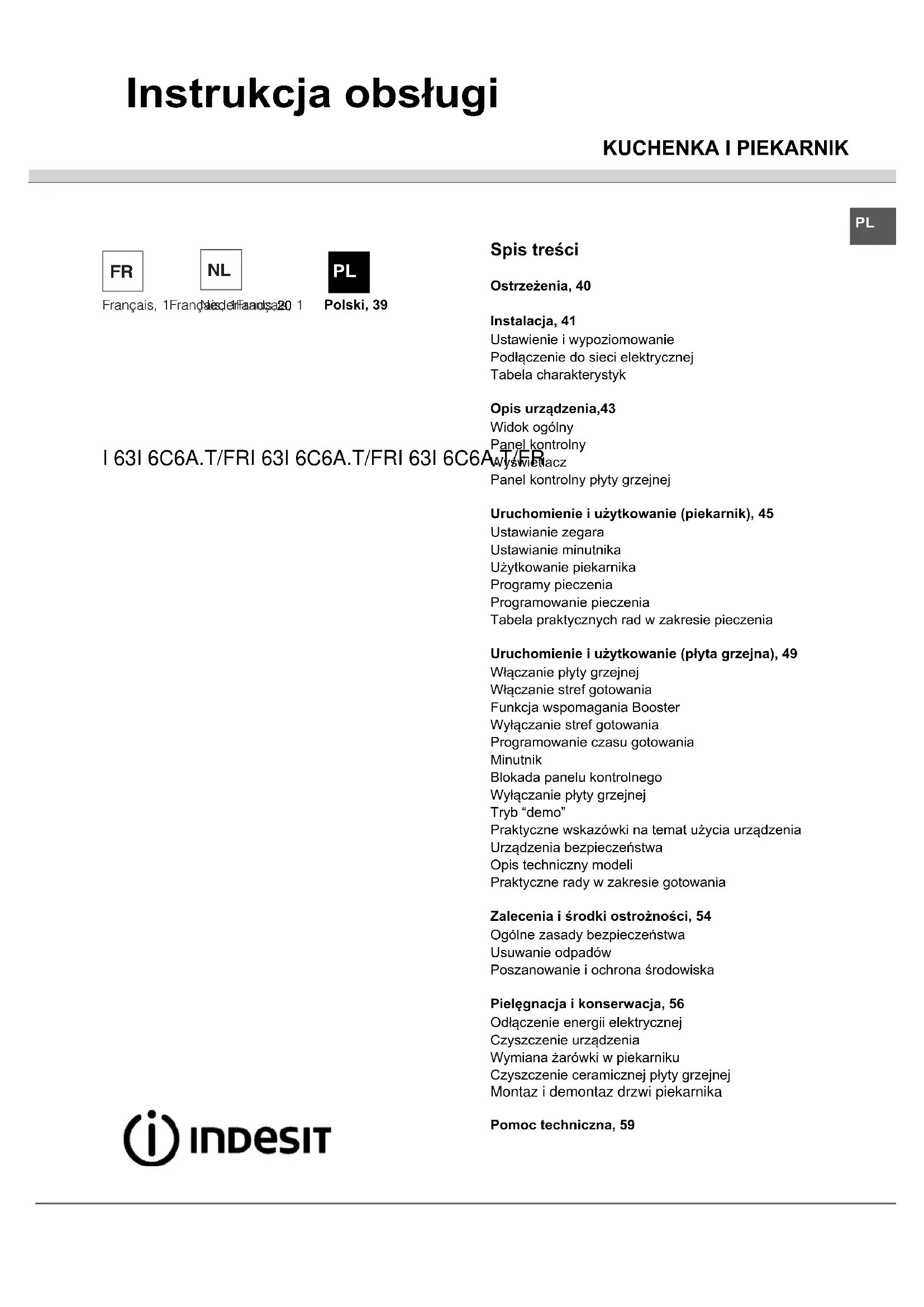 Spis treści Ostrzeżenia, 40Instalacja, 41Ustawienie i wypoziomowaniePodłączenie do sieci elektrycznejTabela charakterystykOpis urządzenia,43Widok ogólnyPanel kontrolnyWyświetlaczPanel kontrolny płyty grzejnejUruchomienie i użytkowanie (piekarnik), 45Ustawianie zegaraUstawianie minutnikaUżytkowanie piekarnikaProgramy pieczeniaProgramowanie pieczeniaTabela praktycznych rad w zakresie pieczeniaUruchomienie i użytkowanie (płyta grzejna), 49Włączanie płyty grzejnejWłączanie stref gotowaniaFunkcja wspomagania BoosterWyłączanie stref gotowaniaProgramowanie czasu gotowaniaMinutnikBlokada panelu kontrolnegoWyłączanie płyty grzejnejTryb “demo”Praktyczne wskazówki na temat użycia urządzeniaUrządzenia bezpieczeństwaOpis techniczny modeliPraktyczne rady w zakresie gotowaniaZalecenia i środki ostrożności, 54Ogólne zasady bezpieczeństwaUsuwanie odpadówPoszanowanie i ochrona środowiskaPielęgnacja i konserwacja, 56Odłączenie energii elektrycznej Czyszczenie urządzeniaWymiana żarówki w piekarnikuCzyszczenie ceramicznej płyty grzejnejPomoc techniczna, 59Français, 1 Polski, 39 Nederlands,Français, 1Français, 1 Nederlands, Nederlands, Français, 1Français, 1Français, 1 Montaz i demontaz drzwi piekarnika I 63I 6C6A.T/FRI 63I 6C6A.T/FRI 63I 6C6A.T/FRPL