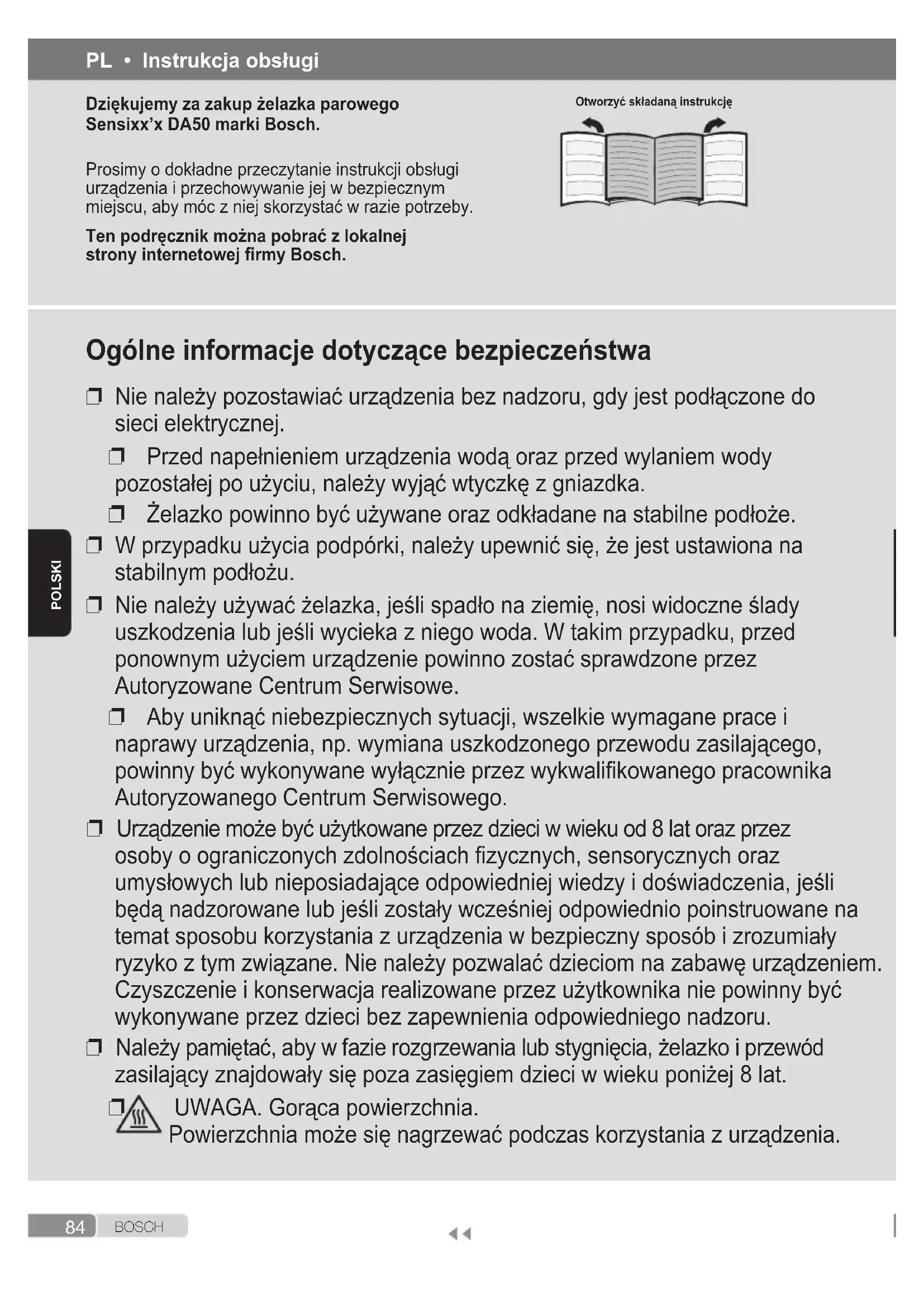 UWAGA. Gorąca powierzchnia. Powierzchnia może się nagrzewać podczas korzystania z urządzenia. PL • Instrukcja obsługi Dziękujemy za zakup żelazka parowego Sensixx’x DA50 marki Bosch. Prosimy o dokładne przeczytanie instrukcji obsługi urządzenia i przechowywanie jej w bezpiecznym miejscu, aby móc z niej skorzystać w razie potrzeby. Ten podręcznik można pobrać z lokalnej strony internetowej rmy Bosch. Otworzyć składaną instrukcję85 B O S C H