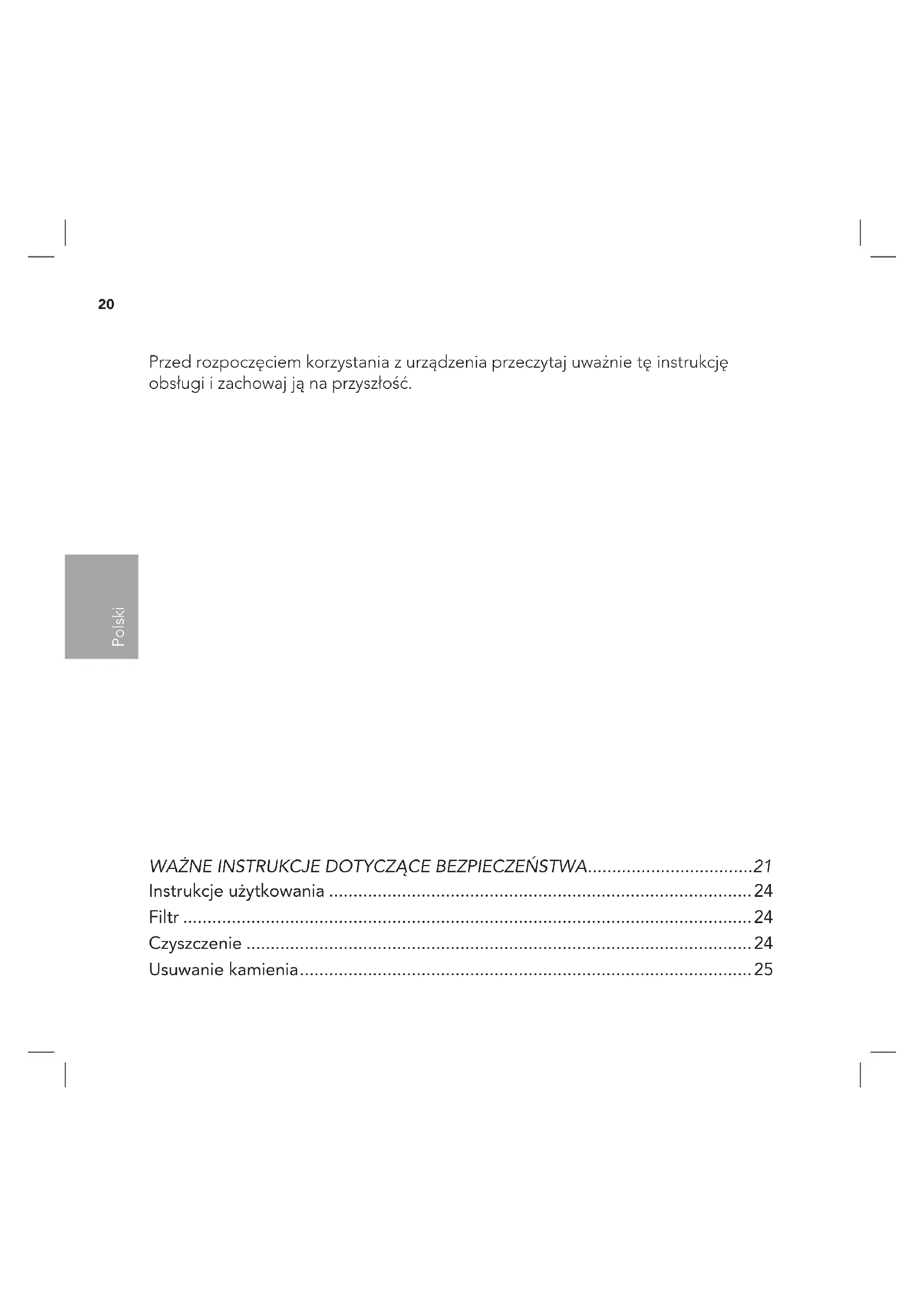 - Usuwanie kamienia Przed rozpoczęciem korzystania z urządzenia przeczytaj uważnie tę instrukcję obsługi i zachowaj ją na przyszłość. 20Polski WAŻNE INSTRUKCJE DOTYCZĄCE BEZPIECZEŃSTWA p. 25