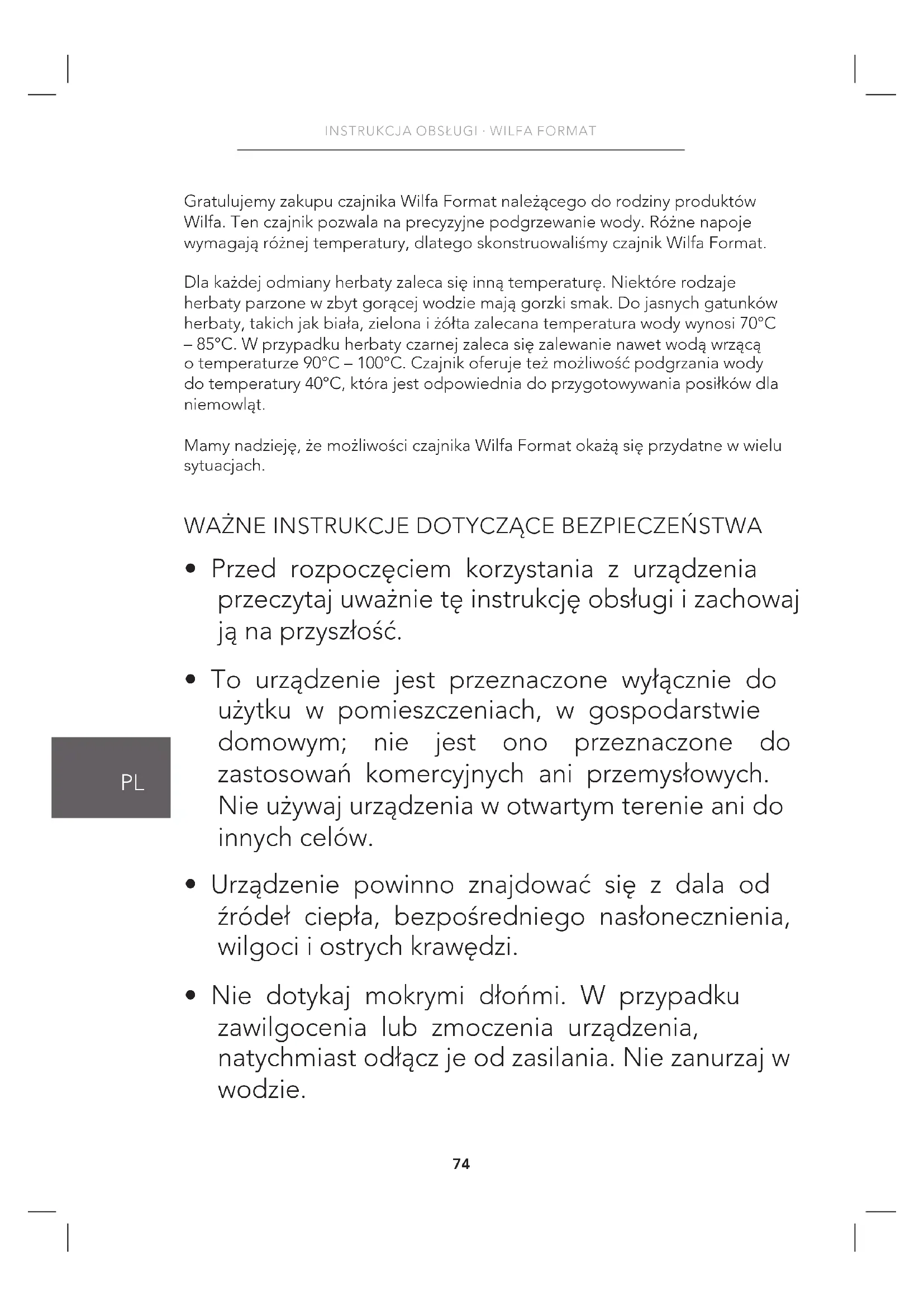 Gratulujemy zakupu czajnika Wilfa Format należącego do rodziny produktów Wilfa. Ten czajnik pozwala na precyzyjne podgrzewanie wody. Różne napoje wymagają różnej temperatury, dlatego skonstruowaliśmy czajnik Wilfa Format. Dla każdej odmiany herbaty zaleca się inną temperaturę. Niektóre rodzaje herbaty parzone w zbyt gorącej wodzie mają gorzki smak. Do jasnych gatunków herbaty, takich jak biała, zielona i żółta zalecana temperatura wody wynosi 70°C – 85°C. W przypadku herbaty czarnej zaleca się zalewanie nawet wodą wrzącą o temperaturze 90°C – 100°C. Czajnik oferuje też możliwość podgrzania wody do temperatury 40°C, która jest odpowiednia do przygotowywania posiłków dla niemowląt. Mamy nadzieję, że możliwości czajnika Wilfa Format okażą się przydatne w wielu sytuacjach. WAŻNE INSTRUKCJE DOTYCZĄCE BEZPIECZEŃSTWA