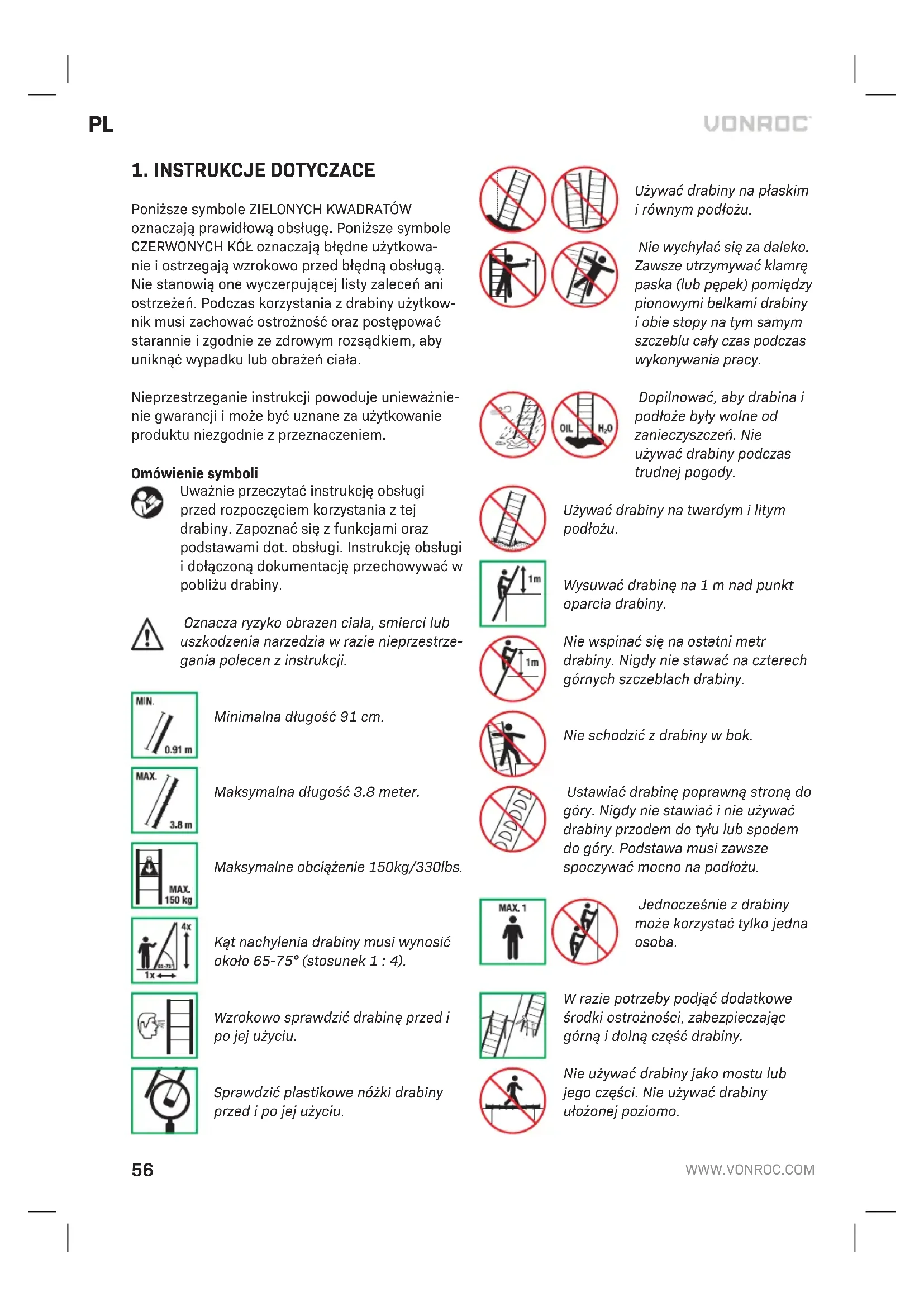 Poniższe symbole ZIELONYCH KWADRATÓW oznaczają prawidłową obsługę. Poniższe symbole CZERWONYCH KÓŁ oznaczają błędne użytkowa- nie i ostrzegają wzrokowo przed błędną obsługą. Nie stanowią one wyczerpującej listy zaleceń ani ostrzeżeń. Podczas korzystania z drabiny użytkow- nik musi zachować ostrożność oraz postępować starannie i zgodnie ze zdrowym rozsądkiem, aby uniknąć wypadku lub obrażeń ciała. Nieprzestrzeganie instrukcji powoduje unieważnie- nie gwarancji i może być uznane za użytkowanie produktu niezgodnie z przeznaczeniem. Omówienie symboli Uważnie przeczytać instrukcję obsługi przed rozpoczęciem korzystania z tej drabiny. Zapoznać się z funkcjami oraz podstawami dot. obsługi. Instrukcję obsługi i dołączoną dokumentację przechowywać w pobliżu drabiny. Oznacza ryzyko obrazen ciala, smierci lub uszkodzenia narzedzia w razie nieprzestrze- gania polecen z instrukcji. Minimalna długość 91 cm. Maksymalna długość 3.8 meter. Maksymalne obciążenie 150kg/330lbs. Kąt nachylenia drabiny musi wynosić około 65-75° (stosunek 1 : 4). Wzrokowo sprawdzić drabinę przed i po jej użyciu. Sprawdzić plastikowe nóżki drabiny przed i po jej użyciu. Używać drabiny na płaskim i równym podłożu. Nie wychylać się za daleko. Zawsze utrzymywać klamrę paska (lub pępek) pomiędzy pionowymi belkami drabiny i obie stopy na tym samym szczeblu cały czas podczas wykonywania pracy. Dopilnować, aby drabina i podłoże były wolne od zanieczyszczeń. Nie używać drabiny podczas trudnej pogody. Używać drabiny na twardym i litym podłożu. Wysuwać drabinę na 1 m nad punkt oparcia drabiny. Nie wspinać się na ostatni metr drabiny. Nigdy nie stawać na czterech górnych szczeblach drabiny. Nie schodzić z drabiny w bok. Ustawiać drabinę poprawną stroną do góry. Nigdy nie stawiać i nie używać drabiny przodem do tyłu lub spodem do góry. Podstawa musi zawsze spoczywać mocno na podłożu. Jednocześnie z drabiny może korzystać tylko jedna osoba. W razie potrzeby podjąć dodatkowe środki ostrożności, zabezpieczając górną i dolną część drabiny. Nie używać drabiny jako mostu lub jego części. Nie używać drabiny ułożonej poziomo.PL