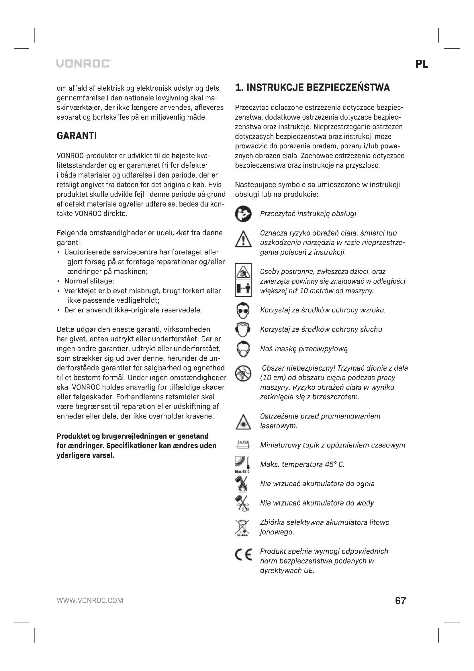 - Użyto części zamiennych innych niż oryginalne. Niniejsza gwarancja to wyłączna gwarancja pro- ducenta i nie obowiązują żadne inne wyrażone ani dorozumiane gwarancje. Nie obowiązują żadne inne wyrażone ani dorozumiane gwarancje o zakresie przekraczającym niniejszą gwarancję, co obejmuje dorozumiane gwarancje przydatności do sprzedaży i przydatności do określonego celu. W żadnym przy- padku firma VONROC nie ponosi odpowiedzialności za straty przypadkowe lub wynikowe. Zadośćuczy- nienie sprzedawcy jest ograniczone do naprawy lub wymiany niezgodnych urządzeń lub części. Produkt i instrukcja obsługi podlegają zmianom. Dane techniczne podlegają zmianom bez uprzedzenia.