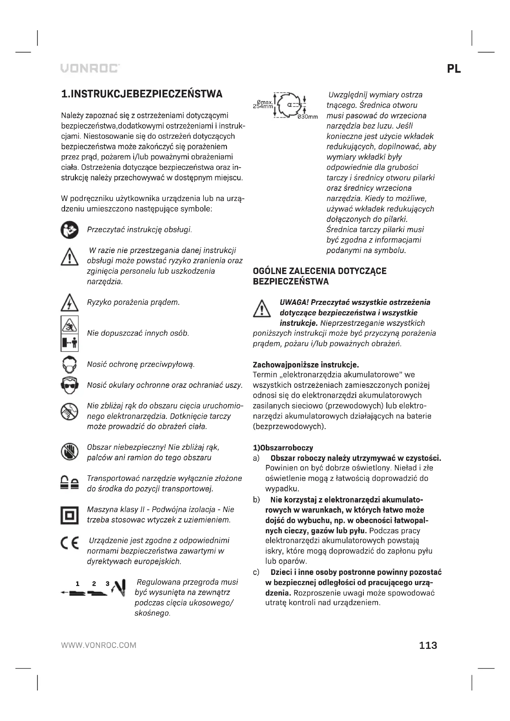 - Przesunąć pilarkę naprzód i wstecz, aby rozpro- wadzić olej na całej długości szyn. SRODOWISKO Uszkodzone i/lub niepotrzebne urzadzenia elektryczne lub elektroniczne podlegaja zbiórce w odpowiednich punktach recyklingu. Tylko kraje WE Nie wyrzucac elektronarzedzi wraz z odpadami z gospodarstw domowych. Zgodnie z dyrektywa 2012/19/WE dotyczaca zuzytych urzadzen elek- trycznych i elektronicznych oraz jej wdrozeniem do prawodawstwa krajowego, elektronarzedzia, które juz nie nadaja sie do uzytku, podlegaja oddziel- nej zbiórce oraz utylizacji w sposób przyjazny dla srodowiska. GWARANCJA Produkty VONROC są wytwarzane zgodnie z najwyż- szymi standardami jakości i producent udziela gwarancji na wady materiałowe i wady wykonania na okres wymagany prawem, licząc od dnia zaku- pu. Jeśli wystąpi usterka produktu w tym okresie spowodowana wadą materiałową i/lub wadą wykonania, proszę bezpośrednio skontaktować się ze sprzedawcą VONROC. Następujące okoliczności powodują unieważnienie gwarancji:
