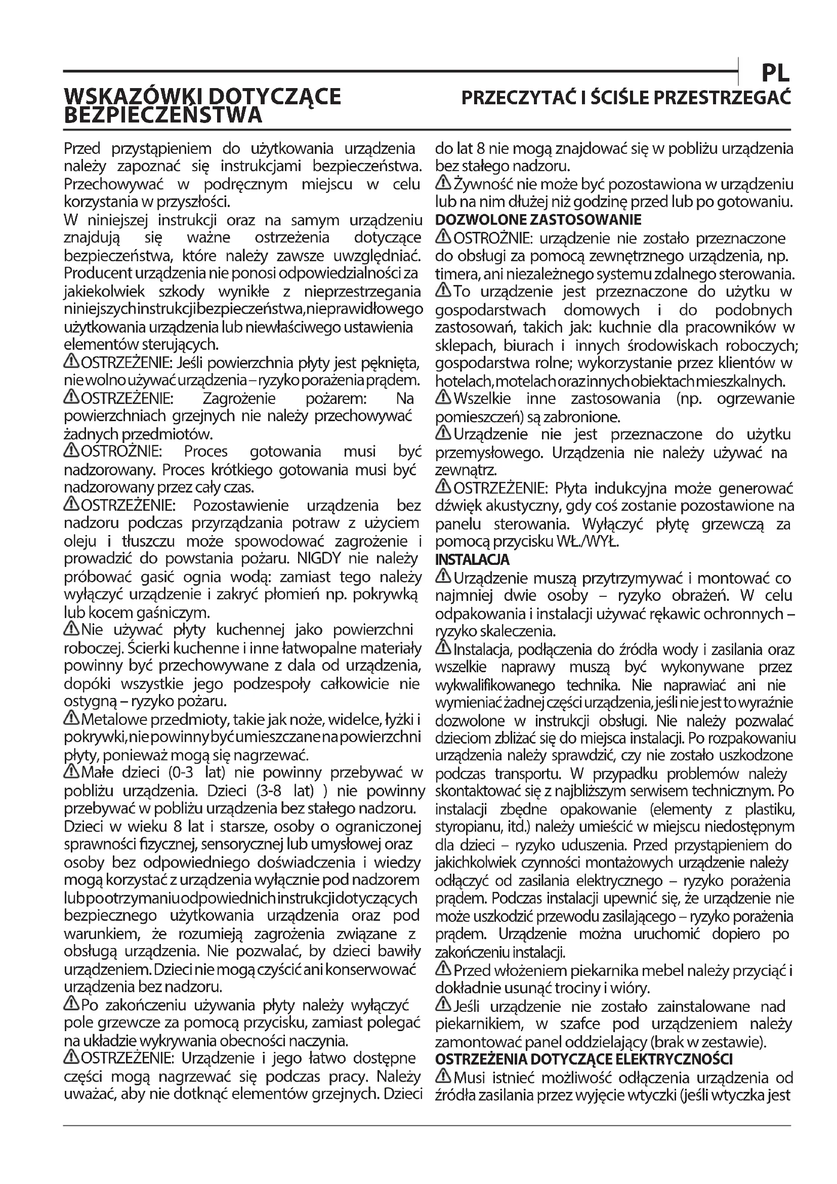 Przed przystąpieniem do użytkowania urządzenia należy zapoznać się instrukcjami bezpieczeństwa. Przechowywać w podręcznym miejscu w celu korzystania w przyszłości. W niniejszej instrukcji oraz na samym urządzeniu znajdują się ważne ostrzeżenia dotyczące bezpieczeństwa, które należy zawsze uwzględniać. Producent urządzenia nie ponosi odpowiedzialności za jakiekolwiek szkody wynikłe z nieprzestrzegania niniejszych instrukcji bezpieczeństwa, nieprawidłowego użytkowania urządzenia lub niewłaściwego ustawienia elementów sterujących. OSTRZEŻENIE: Jeśli powierzchnia płyty jest pęknięta, nie wolno używać urządzenia – ryzyko porażenia prądem. OSTRZEŻENIE: Zagrożenie pożarem: Na powierzchniach grzejnych nie należy przechowywać żadnych przedmiotów. OSTROŻNIE: Proces gotowania musi być nadzorowany. Proces krótkiego gotowania musi być nadzorowany przez cały czas. OSTRZEŻENIE: Pozostawienie urządzenia bez nadzoru podczas przyrządzania potraw z użyciem oleju i tłuszczu może spowodować zagrożenie i prowadzić do powstania pożaru. NIGDY nie należy próbować gasić ognia wodą: zamiast tego należy wyłączyć urządzenie i zakryć płomień np. pokrywką lub kocem gaśniczym. Nie używać płyty kuchennej jako powierzchni roboczej. Ścierki kuchenne i inne łatwopalne materiały powinny być przechowywane z dala od urządzenia, dopóki wszystkie jego podzespoły całkowicie nie ostygną – ryzyko pożaru. Metalowe przedmioty, takie jak noże, widelce, łyżki i pokrywki, nie powinny być umieszczane na powierzchni płyty, ponieważ mogą się nagrzewać. Małe dzieci (0-3 lat) nie powinny przebywać w pobliżu urządzenia. Dzieci (3-8 lat) ) nie powinny przebywać w pobliżu urządzenia bez stałego nadzoru. Dzieci w wieku 8 lat i starsze, osoby o ograniczonej sprawności zycznej, sensorycznej lub umysłowej oraz osoby bez odpowiedniego doświadczenia i wiedzy mogą korzystać z urządzenia wyłącznie pod nadzorem lub po otrz ymaniu odpowiednich instrukcji dot yczących bezpiecznego użytkowania urządzenia oraz pod warunkiem, że rozumieją zagrożenia związane z obsługą urządzenia. Nie pozwalać, by dzieci bawiły urządzeniem. Dzieci nie mogą czyścić ani konserwować urządzenia bez nadzoru. Po zakończeniu używania płyty należy wyłączyć pole grzewcze za pomocą przycisku, zamiast polegać na układzie wykrywania obecności naczynia. OSTRZEŻENIE: Urządzenie i jego łatwo dostępne części mogą nagrzewać się podczas pracy. Należy uważać, aby nie dotknąć elementów grzejnych. Dzieci do lat 8 nie mogą znajdować się w pobliżu urządzenia bez stałego nadzoru. Żywność nie może być pozostawiona w urządzeniu lub na nim dłużej niż godzinę przed lub po gotowaniu. DOZWOLONE ZASTOSOWANIE OSTROŻNIE: urządzenie nie zostało przeznaczone do obsługi za pomocą zewnętrznego urządzenia, np. timera, ani niezależnego systemu zdalnego sterowania. To urządzenie jest przeznaczone do użytku w gospodarstwach domowych i do podobnych zastosowań, takich jak: kuchnie dla pracowników w sklepach, biurach i innych środowiskach roboczych; gospodarstwa rolne; wykorzystanie przez klientów w hotelach, motelach oraz innych obiektach mieszkalnych. Wszelkie inne zastosowania (np. ogrzewanie pomieszczeń) są zabronione. Urządzenie nie jest przeznaczone do użytku przemysłowego. Urządzenia nie należy używać na zewnątrz. OSTRZEŻENIE: Płyta indukcyjna może generować dźwięk akustyczny, gdy coś zostanie pozostawione na panelu sterowania. Wyłączyć płytę grzewczą za pomocą przycisku WŁ./WYŁ. INSTALACJA Urządzenie muszą przytrzymywać i montować co najmniej dwie osoby – ryzyko obrażeń. W celu odpakowania i instalacji używać rękawic ochronnych – ryzyko skaleczenia. Instalacja, podłączenia do źródła wody i zasilania oraz wszelkie naprawy muszą być wykonywane przez wykwalifikowanego technika. Nie naprawiać ani nie wymieniać żadnej części urządzenia, jeśli nie jest to wyraźnie dozwolone w instrukcji obsługi. Nie należy pozwalać dzieciom zbliżać się do miejsca instalacji. Po rozpakowaniu urządzenia należy sprawdzić, czy nie zostało uszkodzone podczas transportu. W przypadku problemów należy skontaktować się z najbliższym serwisem technicznym. Po instalacji zbędne opakowanie (elementy z plastiku, styropianu, itd.) należy umieścić w miejscu niedostępnym dla dzieci – ryzyko uduszenia. Przed przystąpieniem do jakichkolwiek czynności montażowych urządzenie należy odłączyć od zasilania elektrycznego – ryzyko porażenia prądem. Podczas instalacji upewnić się, że urządzenie nie może uszkodzić przewodu zasilającego – ryzyko porażenia prądem. Urządzenie można uruchomić dopiero po zakończeniu instalacji. Przed włożeniem piekarnika mebel należy przyciąć i dokładnie usunąć trociny i wióry. Jeśli urządzenie nie zostało zainstalowane nad piekarnikiem, w szafce pod urządzeniem należy zamontować panel oddzielający (brak w zestawie).