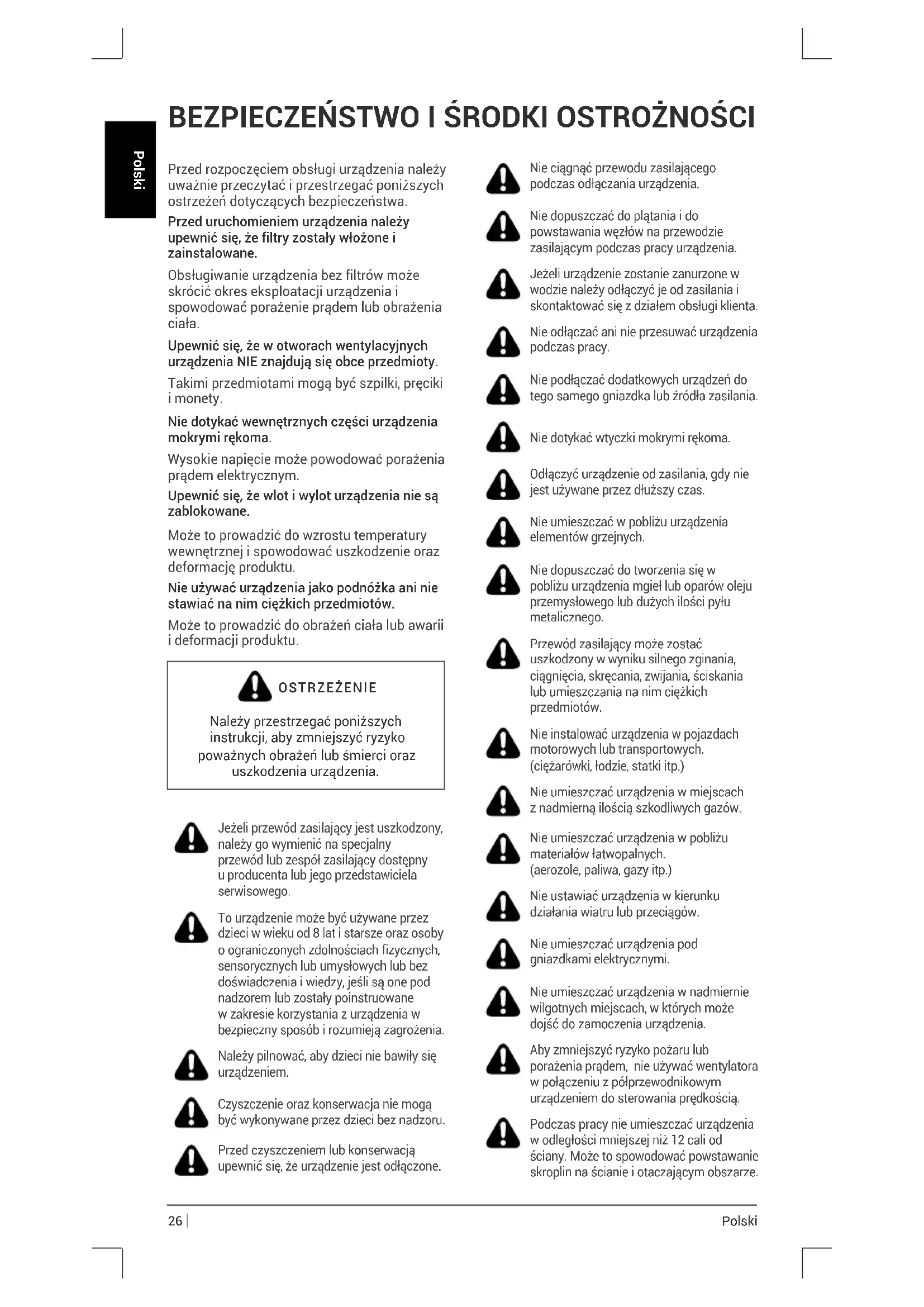 Przed rozpoczęciem obsługi urządzenia należy uważnie przeczytać i przestrzegać poniższych ostrzeżeń dotyczących bezpieczeństwa. Przed uruchomieniem urządzenia należy upewnić się, że filtry zostały włożone i zainstalowane. Obsługiwanie urządzenia bez filtrów może skrócić okres eksploatacji urządzenia i spowodować porażenie prądem lub obrażenia ciała. Upewnić się, że w otworach wentylacyjnych urządzenia NIE znajdują się obce przedmioty. Takimi przedmiotami mogą być szpilki, pręciki i monety. Nie dotykać wewnętrznych części urządzenia mokrymi rękoma. Wysokie napięcie może powodować porażenia prądem elektrycznym. Upewnić się, że wlot i wylot urządzenia nie są zablokowane. Może to prowadzić do wzrostu temperatury wewnętrznej i spowodować uszkodzenie oraz deformację produktu. Nie używać urządzenia jako podnóżka ani nie stawiać na nim ciężkich przedmiotów. Może to prowadzić do obrażeń ciała lub awarii i deformacji produktu. OSTRZEŻENIE Należy przestrzegać poniższych instrukcji, aby zmniejszyć ryzyko poważnych obrażeń lub śmierci oraz uszkodzenia urządzenia. Jeżeli przewód zasilający jest uszkodzony, należy go wymienić na specjalny przewód lub zespół zasilający dostępny u producenta lub jego przedstawiciela serwisowego. To urządzenie może być używane przez dzieci w wieku od 8 lat i starsze oraz osoby o ograniczonych zdolnościach fizycznych, sensorycznych lub umysłowych lub bez doświadczenia i wiedzy, jeśli są one pod nadzorem lub zostały poinstruowane w zakresie korzystania z urządzenia w bezpieczny sposób i rozumieją zagrożenia. Należy pilnować, aby dzieci nie bawiły się urządzeniem. Czyszczenie oraz konserwacja nie mogą być wykonywane przez dzieci bez nadzoru. Przed czyszczeniem lub konserwacją upewnić się, że urządzenie jest odłączone. Nie ciągnąć przewodu zasilającego podczas odłączania urządzenia. Nie dopuszczać do plątania i do powstawania węzłów na przewodzie zasilającym podczas pracy urządzenia. Jeżeli urządzenie zostanie zanurzone w wodzie należy odłączyć je od zasilania i skontaktować się z działem obsługi klienta. Nie odłączać ani nie przesuwać urządzenia podczas pracy. Nie podłączać dodatkowych urządzeń do tego samego gniazdka lub źródła zasilania. Nie dotykać wtyczki mokrymi rękoma. Odłączyć urządzenie od zasilania, gdy nie jest używane przez dłuższy czas. Nie umieszczać w pobliżu urządzenia elementów grzejnych. Nie dopuszczać do tworzenia się w pobliżu urządzenia mgieł lub oparów oleju przemysłowego lub dużych ilości pyłu metalicznego. Przewód zasilający może zostać uszkodzony w wyniku silnego zginania, ciągnięcia, skręcania, zwijania, ściskania lub umieszczania na nim ciężkich przedmiotów. Nie instalować urządzenia w pojazdach motorowych lub transportowych. (ciężarówki, łodzie, statki itp.) Nie umieszczać urządzenia w miejscach z nadmierną ilością szkodliwych gazów. Nie umieszczać urządzenia w pobliżu materiałów łatwopalnych. (aerozole, paliwa, gazy itp.) Nie ustawiać urządzenia w kierunku działania wiatru lub przeciągów. Nie umieszczać urządzenia pod gniazdkami elektrycznymi. Nie umieszczać urządzenia w nadmiernie wilgotnych miejscach, w których może dojść do zamoczenia urządzenia. Aby zmniejszyć ryzyko pożaru lub porażenia prądem, nie używać wentylatora w połączeniu z półprzewodnikowym urządzeniem do sterowania prędkością. Podczas pracy nie umieszczać urządzenia w odległości mniejszej niż 12 cali od ściany. Może to spowodować powstawanie skroplin na ścianie i otaczającym obszarze. BEZPIECZEŃSTWO I ŚRODKI OSTROŻNOŚCIPolski Polski