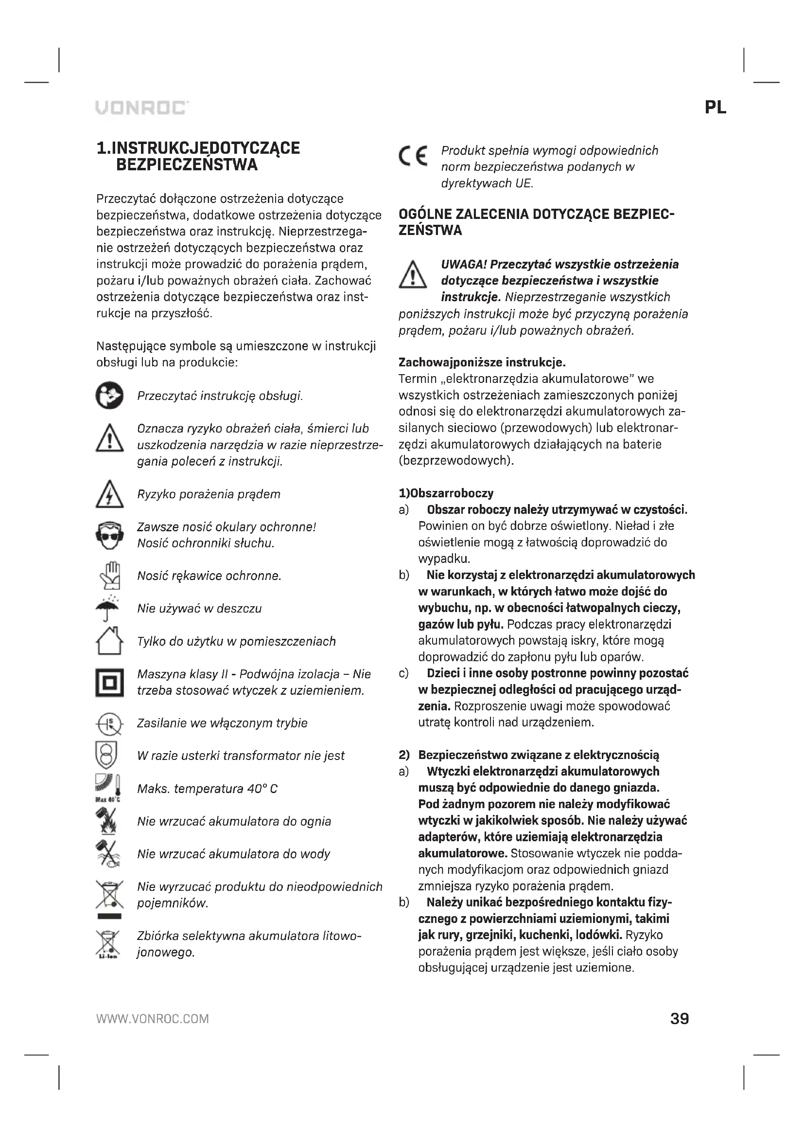 Przed rozpoczeciem czyszczenia i konser- wacji zawsze wylaczac maszyne i wyjmo- wac z niej akumulator. Czyscic obudowe maszyny regularnie miekka scie- reczka, najlepiej po kazdym uzyciu. Dopilnowac, aby otwory wentylacyjne byly wolne od pylu, kurzu i zabrudzen. Usuwac oporne zabrudzenia miekka sciereczka zwilzona mydlinami. Nie uzywac zad- nych rozpuszczalników, takich jak benzyna, alkohol, amoniak itp. Takie substancje chemiczne spowodu- ja uszkodzenie czesci z tworzyw sztucznych. SRODOWISKO Uszkodzone i/lub niepotrzebne urzadzenia elektryczne lub elektroniczne podlegaja zbiórce w odpowiednich punktach recyklingu. Tylko kraje WE Nie wyrzucac elektronarzedzi wraz z odpadami z gospodarstw domowych. Zgodnie z dyrektywa 2012/19/WE dotyczaca zuzytych urzadzen elek- trycznych i elektronicznych oraz jej wdrozeniem do prawodawstwa krajowego, elektronarzedzia, które juz nie nadaja sie do uzytku, podlegaja oddziel- nej zbiórce oraz utylizacji w sposób przyjazny dla srodowiska. GWARANCJA Produkty VONROC są wytwarzane zgodnie z naj- wyższymi standardami jakości i producent udziela gwarancji na wady materiałowe i wady wykonania na okres wymagany prawem, licząc od dnia zaku- pu. Jeśli wystąpi usterka produktu w tym okresie spowodowana wadą materiałową i/lub wadą wykonania, proszę bezpośrednio skontaktować się ze sprzedawcą VONROC. Następujące okoliczności powodują unieważnienie gwarancji: