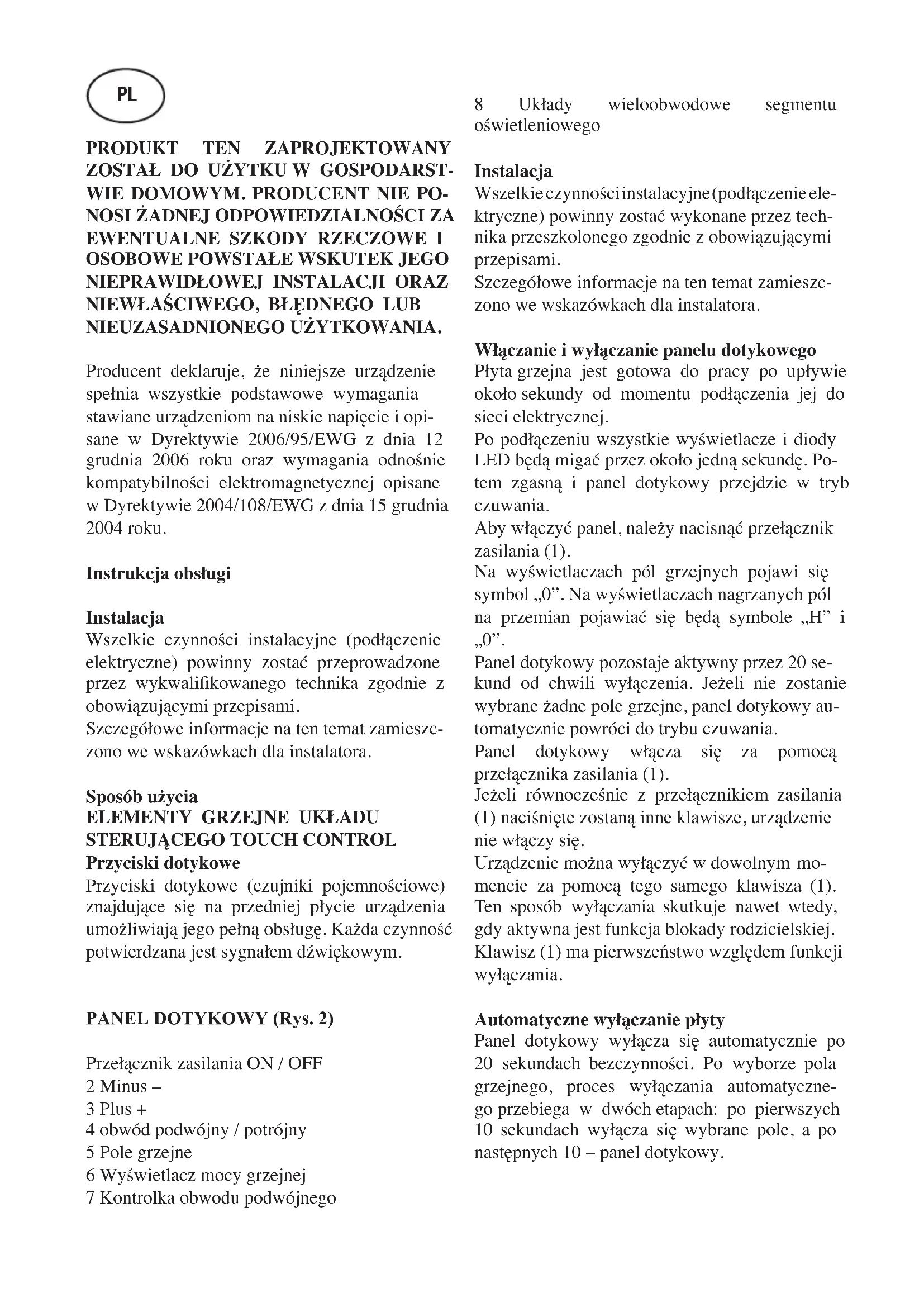 Przyciski dotykowe Przyciski dotykowe (czujniki pojemnościowe) znajdujące się na przedniej płycie urządzenia umożliwiają jego pełną obsługę. Każda czynność potwierdzana jest sygnałem dźwiękowym. PANEL DOTYKOWY (Rys. 2) Przełącznik zasilania ON / OFF 2 Minus – 3 Plus + 4 obwód podwójny / potrójny 5 Pole grzejne 6 Wyświetlacz mocy grzejnej 7 Kontrolka obwodu podwójnego 8 Układy wieloobwodowe segmentu oświetleniowego Instalacja Wszelkie czynności instalacyjne (podłączenie ele- ktryczne) powinny zostać wykonane przez tech- nika przeszkolonego zgodnie z obowiązującymi przepisami. Szczegółowe informacje na ten temat zamieszc- zono we wskazówkach dla instalatora. Włączanie i wyłączanie panelu dotykowego Płyta grzejna jest gotowa do pracy po upływie około sekundy od momentu podłączenia jej do sieci elektrycznej. Po podłączeniu wszystkie wyświetlacze i diody LED będą migać przez około jedną sekundę. Po- tem zgasną i panel dotykowy przejdzie w tryb czuwania. Aby włączyć panel, należy nacisnąć przełącznik zasilania (1). Na wyświetlaczach pól grzejnych pojawi się symbol „0”. Na wyświetlaczach nagrzanych pól na przemian pojawiać się będą symbole „H” i „0”. Panel dotykowy pozostaje aktywny przez 20 se- kund od chwili wyłączenia. Jeżeli nie zostanie wybrane żadne pole grzejne, panel dotykowy au- tomatycznie powróci do trybu czuwania. Panel dotykowy włącza się za pomocą przełącznika zasilania (1). Jeżeli równocześnie z przełącznikiem zasilania (1) naciśnięte zostaną inne klawisze, urządzenie nie włączy się. Urządzenie można wyłączyć w dowolnym mo- mencie za pomocą tego samego klawisza (1). Ten sposób wyłączania skutkuje nawet wtedy, gdy aktywna jest funkcja blokady rodzicielskiej. Klawisz (1) ma pierwszeństwo względem funkcji wyłączania. Automatyczne wyłączanie płyty Panel dotykowy wyłącza się automatycznie po 20 sekundach bezczynności. Po wyborze pola grzejnego, proces wyłączania automatyczne- go przebiega w dwóch etapach: po pierwszych 10 sekundach wyłącza się wybrane pole, a po następnych 10 – panel dotykowy. PLWłączanie i wyłączanie pola grzejnego Po włączeniu panelu pole grzejne wybiera się za pomocą odpowiadającego mu klawisza (5). Wyświetlacz (6) wybranego pola zaświeci się jaśniej, podczas gdy pozostałe wyświetlacze ściemnieją. Na wyświetlaczach nagrzanych pól na przemian pojawiać się będą symbole „H” i „0”. Moc grzejną pola ustawia się za pomocą klawiszy PLUS (3) i MINUS (2). Aby ustawić moc grzejną wybranego pola należy wcisnąć i przytrzymać klawisz PLUS (3); moc będzie wzrastać o jedną jednostkę co 0,4 sekun- dy poczynając od poziomu 1. Poziom „9” oznac- za maksymalną moc pola. Jeżeli regulację mocy grzejnej rozpocznie się wciśnięciem klawisza MINUS (2), to wartością wyjściową będzie poziom maksymalny „9”. Przytrzymanie klawisza spowoduje obniżenie mocy w tempie jednej jednostki na 0,4 sekun- dy. Poziom „0” oznacza minimalną moc grzejną pola. Moc grzejną można regulować ponownie naciskając klawisze MINUS (2) i PLUS (3). Wyłączanie pola grzejnego Wybierz pole, które chcesz wyłączyć, wciskając odpowiadający mu klawisz (5). Wyświetlacz (6) wybranego pola zaświeci się jaśniej, podczas gdy pozostałe wyświetlacze ściemnieją. Jednoc- zesne naciśnięcie klawiszy PLUS (3) i MINUS (2) spowoduje natychmiastowe przestawienie pola na wartość 0. Opcjonalnie można wciskać klawisz MINUS (2) dopóki wartość nie spadnie do 0. Na wyświetlaczach nagrzanych pól na przemian pojawiać się będą symbole „H” i „0”. Wyłączanie wszystkich pól grzejnych Aby w dowolnym momencie natychmiast wyłączyć wszystkie pola grzejne, należy wcisnąć klawisz (1). W trybie czuwania na wyświetlaczach nagrzanych pól wyświetlony zostanie symbol „H”. Wyświetlacze pozostałych pól pozostaną zgaszone. Poziom mocy grzejnej Dostępnych jest 9 poziomów mocy grzejnej pola, którym odpowiadają cyfry od „1” do „9”, wska- zywane na siedmiosegmentowym wyświetlaczu LED (6). Wskaźnik ciepła resztkowego Informuje użytkownika o tym, że płyta jest wciąż na tyle gorąca, iż dotknięcie jej może być nie- bezpieczne. Wartość temperatury obliczana jest według matematycznego wzoru, a ciepło resz- tkowe sygnalizowane literą „H” na siedmioseg- mentowym wyświetlaczu odpowiedniego pola. Wartości nagrzania i stygnięcia obliczane są na podstawie następujących danych: wybranego poziomu mocy (od „0” do „9”), czasu pracy. Po wyłączeniu danego pola grzejnego na odpowiadającym mu wyświetlaczu wskazywa- na jest litera „H”, dopóki temperatura obliczo- na według wspomnianego wzoru nie spadnie poniżej poziomu krytycznego (≤ 60ºC). Funkcja automatycznego wyłączania (ograni- czenie czasu pracy) O ile użytkownik nie wykona żadnych czynności, poszczególne pola grzejne automatycznie wyłączą się po upływie określonego czasu, zależnego od aktualnego poziomu mocy grzejnej. Licznik czasu zeruje się po każdorazowej zmianie dokonanej przez użytkownika (np. po naciśnięciu klawisza PLUS (3) lub MINUS (2) albo po włączeniu lub wyłączeniu podwójnego obwodu). Zabezpieczenie przed przypadkowym włączeniem Jeżeli czujnik elektroniczny wykryje przytrzy- manie klawisza przez ok. 10 s, nastąpi automa- tyczne wyłączenie urządzenia. Wyemitowany zostanie również sygnał dźwiękowy informujący użytkownika o wykryciu przedmiotu. Na wyświetlaczach pojawi się kod błędu „E R 0 3”. Na wyświetlaczach nagrzanych pól na przemian pojawiać się będzie litera „H” i kod błędu. Jeśli żadne pole grzejne nie zostanie wybrane przez 20 sekund od uruchomienia panelu do- tykowego, urządzenie automatycznie przejdzie w tryb czuwania. Przy włączonym panelu dotykowym przełącznik zasilania ma pierwszeństwo w sto- sunku do pozostałych funkcji. O