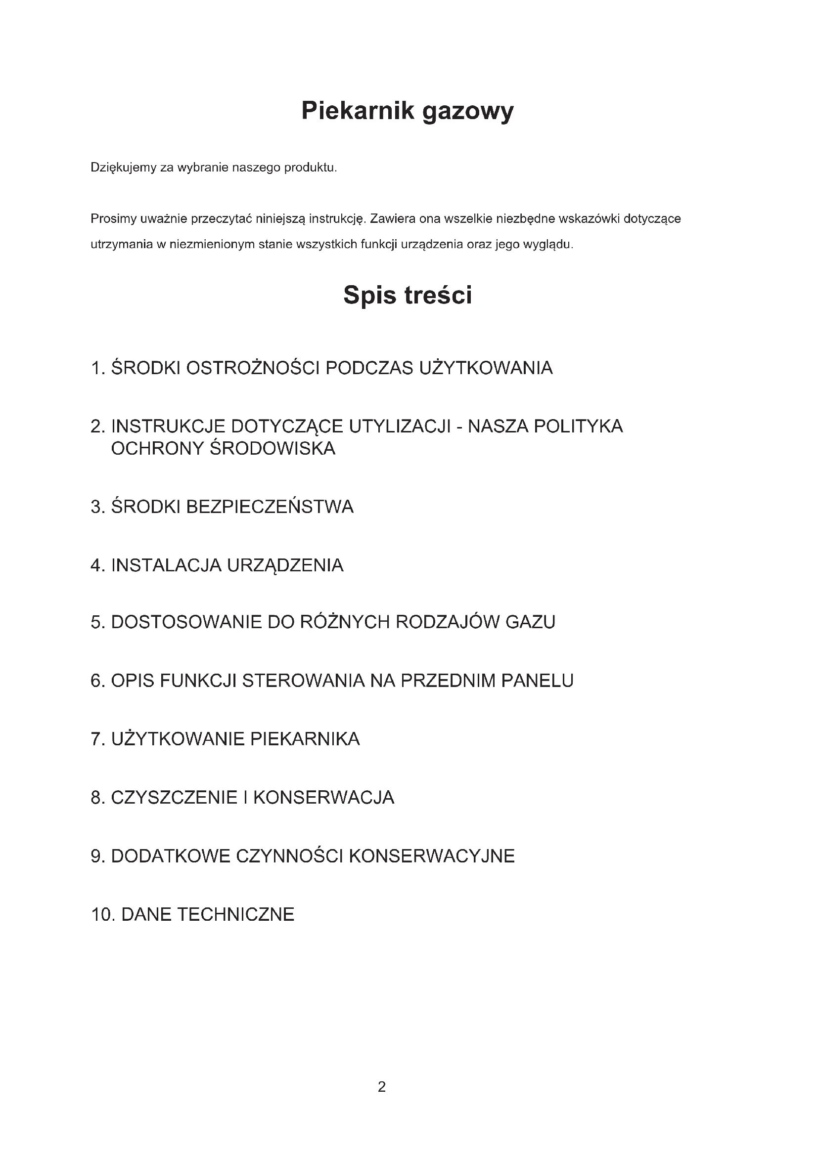 PL2 Piekarnik gazowy Dziękujemy za wybranie naszego produktu. Prosimy uważnie przeczytać niniejszą instrukcję. Zawiera ona wszelkie niezbędne wskazówki dotyczące utrzymania w niezmienionym stanie wszystkich funkcji urządzenia oraz jego wyglądu. Spis treści