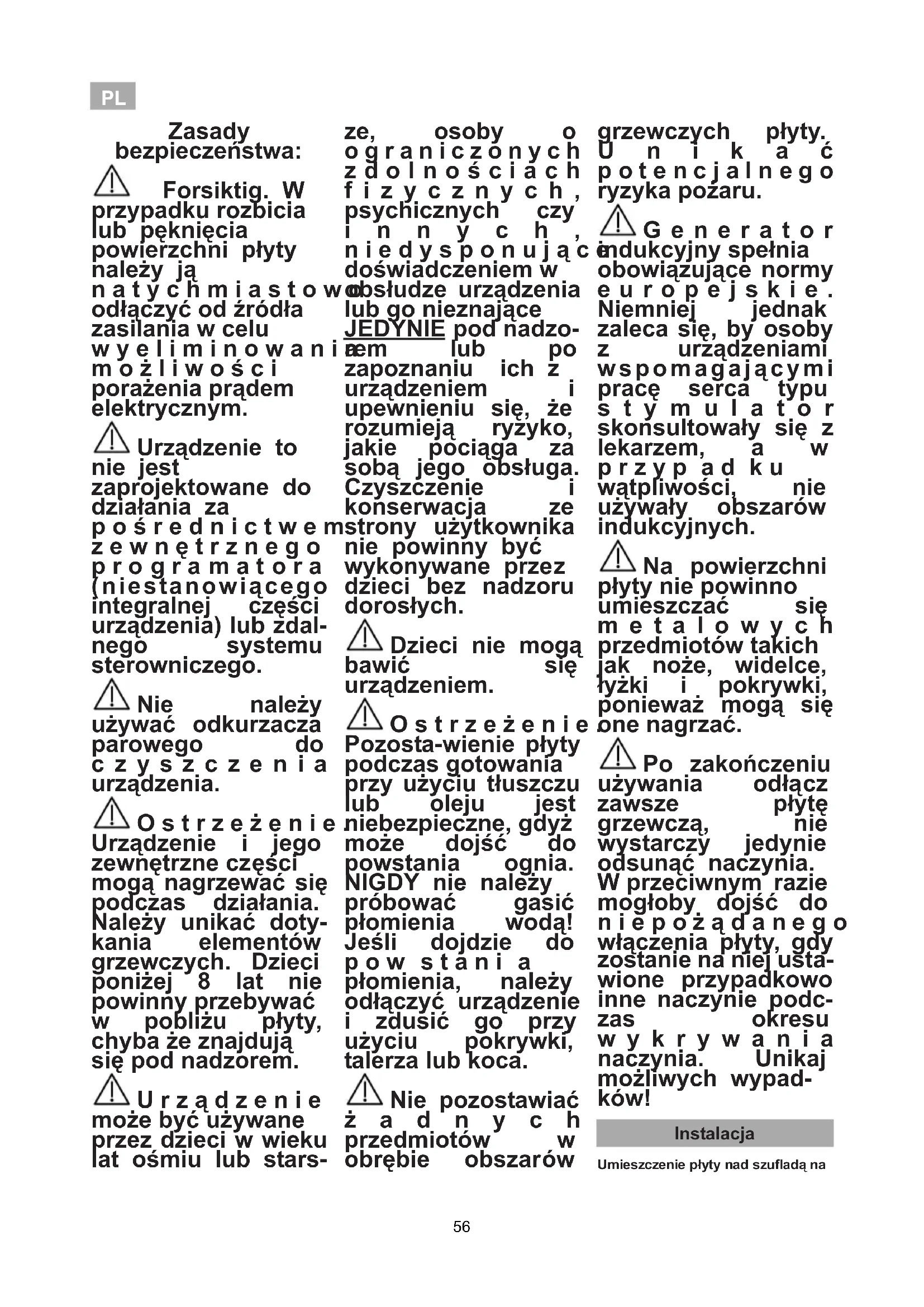 55PL Zasady bezpieczeństwa: Forsiktig. W przypadku rozbicia lub pęknięcia powierzchni płyty należy ją n a t y c h m i a s t o w o odłączyć od źródła zasilania w celu w y e l i m i n o w a n i a m o ż l i w o ś c i porażenia prądem elektrycznym. Urządzenie to nie jest zaprojektowane do działania za p o ś r e d n i c t w e m z e w n ę t r z n e g o p r o g r a m a t o r a (niestanowiącego integralnej części urządzenia) lub zdal- nego systemu sterowniczego. Nie należy używać odkurzacza parowego do c z y s z c z e n i a urządzenia. O s t r z e ż e n i e . Urządzenie i jego zewnętrzne części mogą nagrzewać się podczas działania. Należy unikać doty- kania elementów grzewczych. Dzieci poniżej 8 lat nie powinny przebywać w pobliżu płyty, chyba że znajdują się pod nadzorem. U r z ą d z e n i e może być używane przez dzieci w wieku lat ośmiu lub stars- ze, osoby o o g r a n i c z o n y c h z d o l n o ś c i a c h f i z y c z n y c h , psychicznych czy i n n y c h , n i e d y s p o n u j ą c e doświadczeniem w obsłudze urządzenia lub go nieznające JEDYNIE pod nadzo- rem lub po zapoznaniu ich z urządzeniem i upewnieniu się, że rozumieją ryzyko, jakie pociąga za sobą jego obsługa. Czyszczenie i konserwacja ze strony użytkownika nie powinny być wykonywane przez dzieci bez nadzoru dorosłych. Dzieci nie mogą bawić się urządzeniem. O s t r z e ż e n i e . Pozosta-wienie płyty podczas gotowania przy użyciu tłuszczu lub oleju jest niebezpieczne, gdyż może dojść do powstania ognia. NIGDY nie należy próbować gasić płomienia wodą! Jeśli dojdzie do p o w s t a n i a płomienia, należy odłączyć urządzenie i zdusić go przy użyciu pokrywki, talerza lub koca. Nie pozostawiać ż a d n y c h przedmiotów w obrębie obszarów grzewczych płyty. U n i k a ć p o t e n c j a l n e g o ryzyka pożaru. G e n e r a t o r indukcyjny spełnia obowiązujące normy e u r o p e j s k i e . Niemniej jednak zaleca się, by osoby z urządzeniami wspomagającymi pracę serca typu s t y m u l a t o r skonsultowały się z lekarzem, a w p r z y p a d k u wątpliwości, nie używały obszarów indukcyjnych. Na powierzchni płyty nie powinno umieszczać się m e t a l o w y c h przedmiotów takich jak noże, widelce, łyżki i pokrywki, ponieważ mogą się one nagrzać. Po zakończeniu używania odłącz zawsze płytę grzewczą, nie wystarczy jedynie odsunąć naczynia. W przeciwnym razie mogłoby dojść do n i e p o ż ą d a n e g o włączenia płyty, gdy zostanie na niej usta- wione przypadkowo inne naczynie podc- zas okresu w y k r y w a n i a naczynia. Unikaj możliwych wypad- ków! Instalacja Umieszczenie płyty nad szufladą na 56PL sztućce Jeśli użytkownik życzy sobie umieszczenie pod płytą grzewczą mebla lub szuflady, pomiędzy oboma elementami należy umieścić płytę oddzielającą. W ten sposób zostanie wyeliminowana możliwość przypadkowego kontaktu z gorącą powierzchnią obudowy urządzenia. Płyta oddzielająca powinna znajdować się około 20 mm poniżej dolnej części płyty grzewczej. Przyłączenie do instalacji elektrycznej Przed podłączeniem płyty grzewczej do sieci elektrycznej należy sprawdzić czy napięcie (woltaż) i jego częstotliwość odpowiadają tym wska- zanym na tabliczce informacyjnej płyty, znajdującej się w jej dolnej części oraz informacjom zawartym w Karcie gwarancyjnej lub, jeśli dotyczy, na kar- cie danych technicznych, która powinna zostać przechowywana wraz z niniejszymi instrukcjami przez okres użytkowania urządzenia. Przyłączenie do instalacji elektrycznej powinno zostać wykonane za pośrednictwem wielobiegunowego wyłącznika lub gniazda, o ile jest ono łatwodostępne, odpowiednich dla przewidzianego napięcia i o odległości pomiędzy stykami roboczymi minimum 3 mm, co zagwarantuje bezpieczne odłączenie w przypadku awarii lub czyszczenia płyty. Należy uważać, by kabel wejściowy nie dotykał ani obudowy płyty, ani obudowy piekarnika, jeśli ten jest zainstalowany w tym samym meblu. Uwaga! Przyłączenie do sieci elektrycznej powinno zawierać poprawnie wykonane uziemienie, zgodnie z obowiązującymi przepisami, w przeciwnym wypadku płyta może nie działać poprawnie. Wyjątkowe wysokie przepięcia mogą spowodować awarię systemu sterowania (jak w przypadku jakiegokolwiek innego urządzenia elektronicznego). Nie zaleca się używania kuchni indukcyjnej w czasie działania funkcji czyszczenia pirolitycznego w przypadku piekarników pirolitycznych ze względu na wysoką temperaturę, jaką osiąga to urządzenie. Jakakolwiek manipulacja czy reparacja urządzenia, włączając wymianę elastycznego kabla zasilającego, powinna zostać doko- nana przez autoryzowany serwis techniczny TEKA. Przed odłączeniem kuchni od sieci elektrycznej zaleca się wyłączyć wyłącznik i odczekać około 25 sekund przed wyciągnięciem wtyczki. Ten czas jest konieczny dla całkowitego rozładowania obwodu elektronicznego i uniknięcia możliwości porażenia prądem elektrycznym poprzez dotknięcie bolców wtyczki. Należy zachować Certyfikat gwarancyjny lub, jeśli dotyczy, kartę danych technicznych, wraz z Instrukcją obsługi przez okres użytkowania urządzenia. Zawarte są w nim jego ważne dane techniczne. Użytkowanie i konserwacja Instrukcje użycia Sterowania dotykowego ELEMENTY OPERACYJNE (rys. 2) Sensor włączenia/wyłączenia. Wskaźnik płyty. Wskaźniki mocy i/lub nagromadzo- nej energii*. Sensory wyboru pola grzewczego. Separator dziesiętny zegara*. Sensor zegara. Wskaźnik zegara. Sensor blokady pozostałych sensorów. Separator dziesiętny wskaźników mocy i/lub ciepła resztkowego*. Lampka kontrolna sygnalizująca aktywowaną blokadę*. Sensor “minus” zwiększenia mocy/czasu. Sensor “plus” zwiększenia mocy/czasu.
