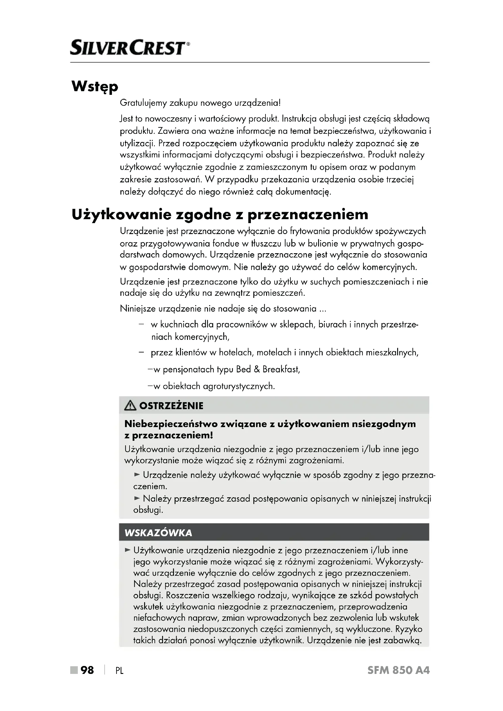 PL SFM 850 A4 Wstęp Gratulujemy zakupu nowego urządzenia! Jest to nowoczesny i wartościowy produkt. Instrukcja obsługi jest częścią składową produktu. Zawiera ona ważne informacje na temat bezpieczeństwa, użytkowania i utylizacji. Przed rozpoczęciem użytkowania produktu należy zapoznać się ze wszystkimi informacjami dotyczącymi obsługi i bezpieczeństwa. Produkt należy użytkować wyłącznie zgodnie z zamieszczonym tu opisem oraz w podanym zakresie zastosowań. W przypadku przekazania urządzenia osobie trzeciej należy dołączyć do niego również całą dokumentację. Użytkowanie zgodne z przeznaczeniem Urządzenie jest przeznaczone wyłącznie do frytowania produktów spożywczych oraz przygotowywania fondue w tłuszczu lub w bulionie w prywatnych gospo- darstwach domowych. Urządzenie przeznaczone jest wyłącznie do stosowania w gospodarstwie domowym. Nie należy go używać do celów komercyjnych. Urządzenie jest przeznaczone tylko do użytku w suchych pomieszczeniach i nie nadaje się do użytku na zewnątrz pomieszczeń. Niniejsze urządzenie nie nadaje się do stosowania … – w kuchniach dla pracowników w sklepach, biurach i innych przestrze- niach komercyjnych, – przez klientów w hotelach, motelach i innych obiektach mieszkalnych, – w pensjonatach typu Bed & Breakfast, – w obiektach agroturystycznych. OSTRZEŻENIE Niebezpieczeństwo związane z użytkowaniem nsiezgodnym z przeznaczeniem! Użytkowanie urządzenia niezgodnie z jego przeznaczeniem i/lub inne jego wykorzystanie może wiązać się z różnymi zagrożeniami. ► Urządzenie należy użytkować wyłącznie w sposób zgodny z jego przezna- czeniem. ► Należy przestrzegać zasad postępowania opisanych w niniejszej instrukcji obsługi. WSKAZÓWKA