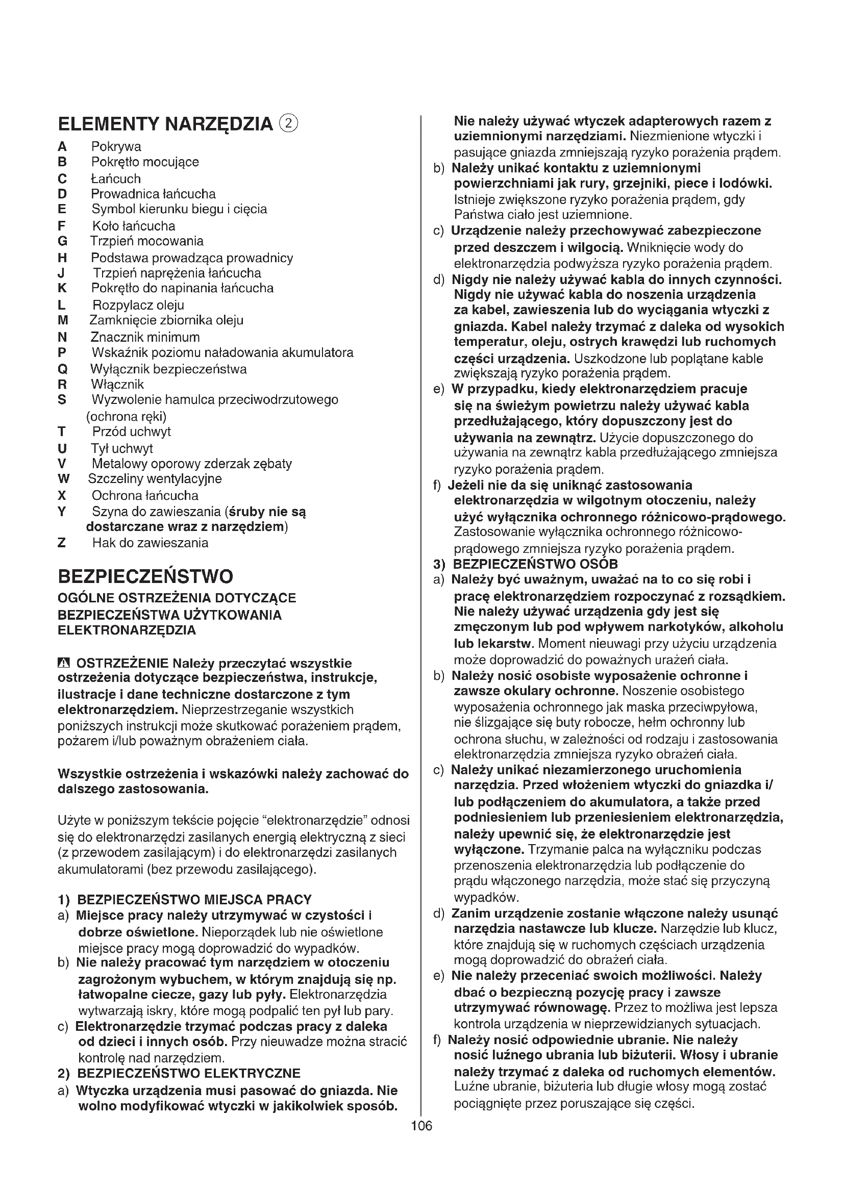 A Pokrywa B Pokrętło mocujące C Łańcuch D Prowadnica łańcucha E Symbol kierunku biegu i cięcia F Koło łańcucha G Trzpień mocowania H Podstawa prowadząca prowadnicy J Trzpień naprężenia łańcucha K Pokrętło do napinania łańcucha L Rozpylacz oleju M Zamknięcie zbiornika oleju N Znacznik minimum P Wskaźnik poziomu naładowania akumulatora Q Wyłącznik bezpieczeństwa R Włącznik S Wyzwolenie hamulca przeciwodrzutowego (ochrona ręki) T Przód uchwyt U Tył uchwyt V Metalowy oporowy zderzak zębaty W Szczeliny wentylacyjne X Ochrona łańcucha Y Szyna do zawieszania (śruby nie są dostarczane wraz z narzędziem) Z Hak do zawieszania BEZPIECZEŃSTWO