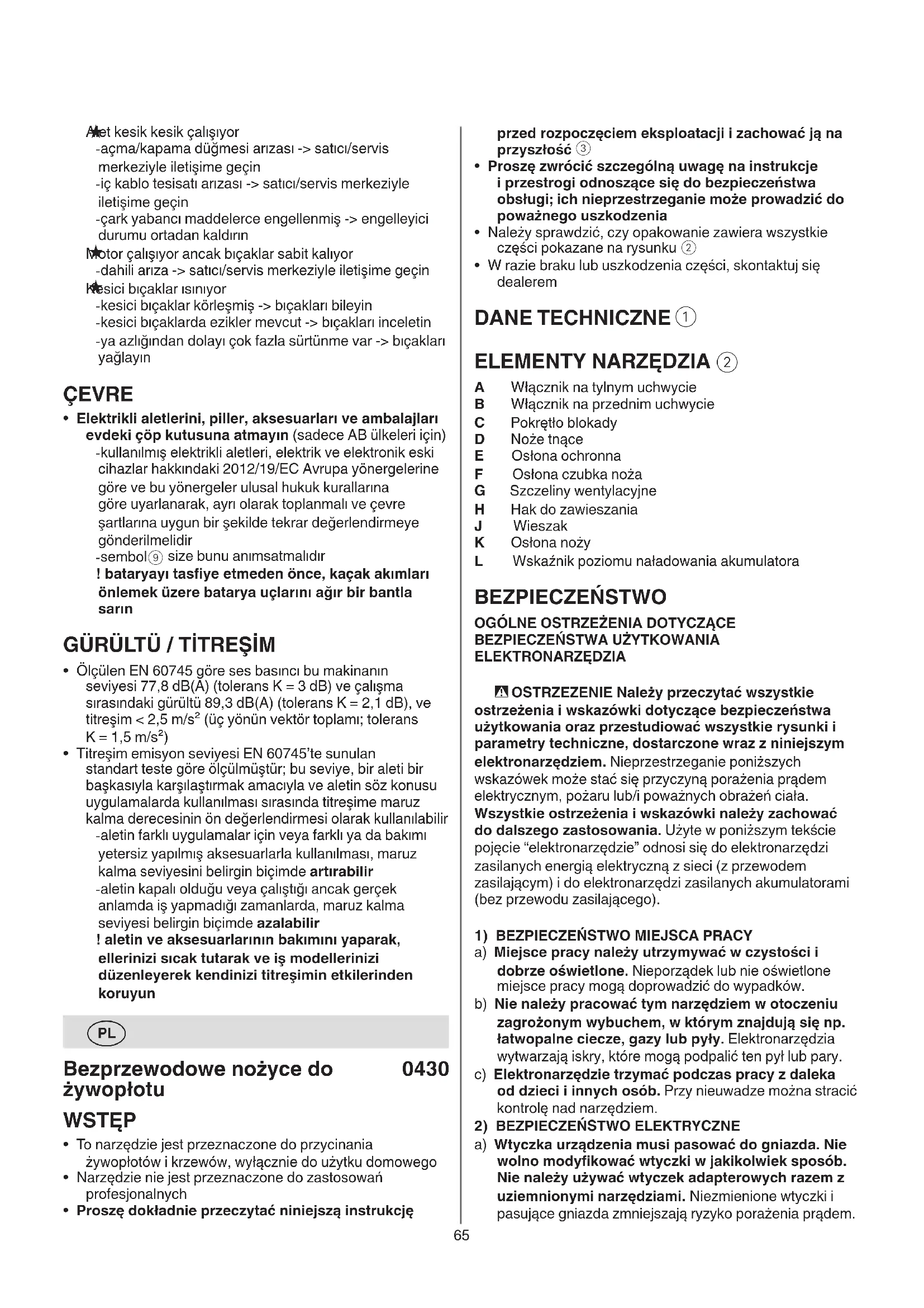 A Włącznik na tylnym uchwycie B Włącznik na przednim uchwycie C Pokrętło blokady D Noże tnące E Osłona ochronna F Osłona czubka noża G Szczeliny wentylacyjne H Hak do zawieszania J Wieszak K Osłona noży L Wskaźnik poziomu naładowania akumulatora BEZPIECZEŃSTWO